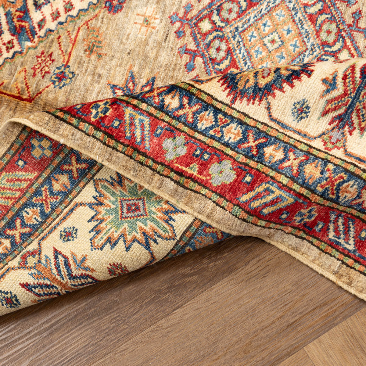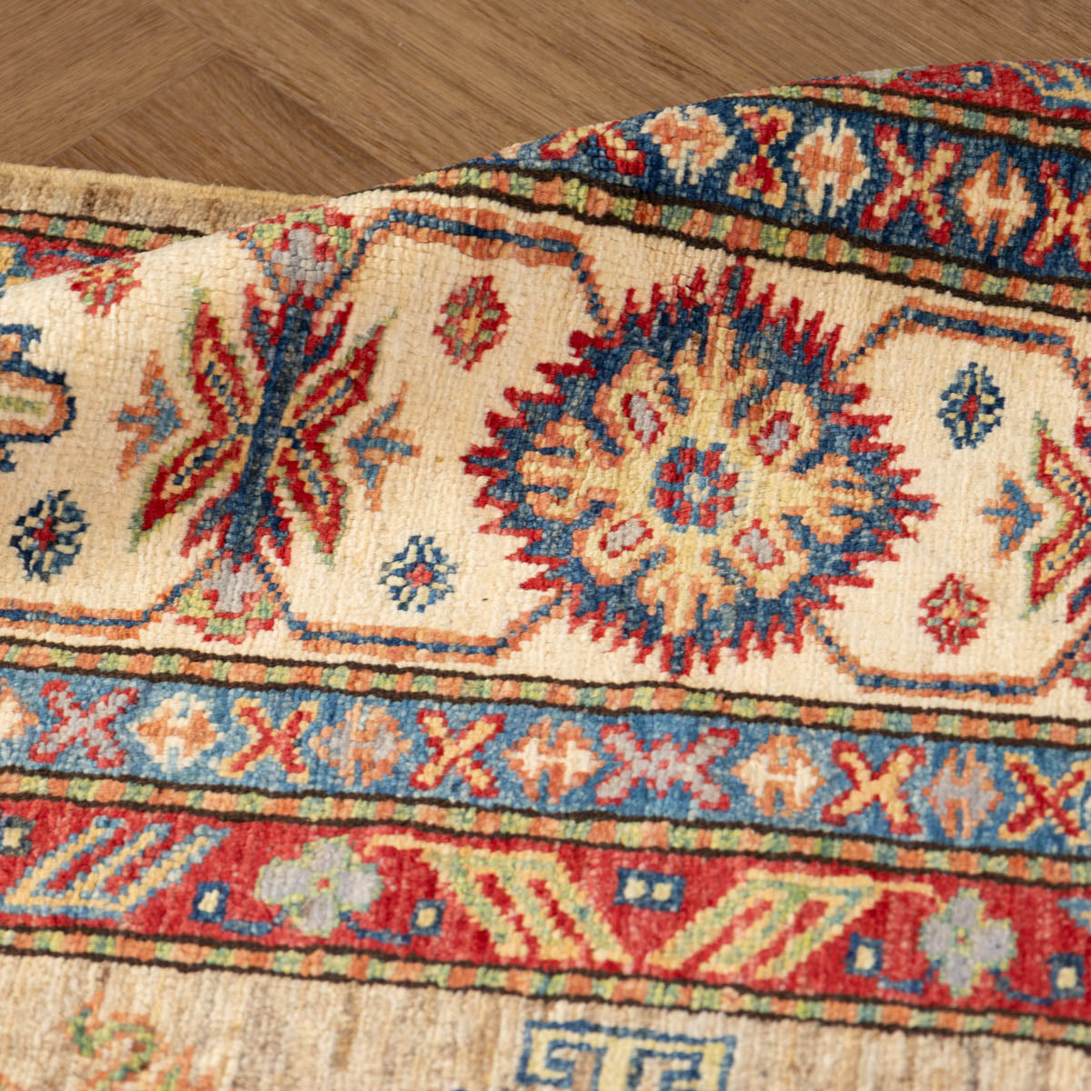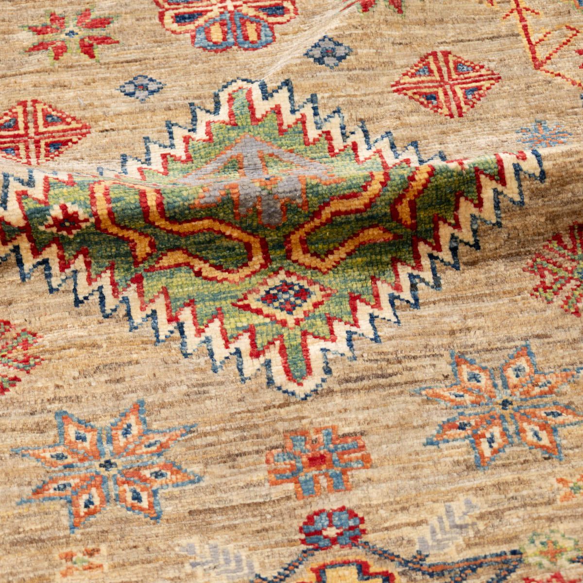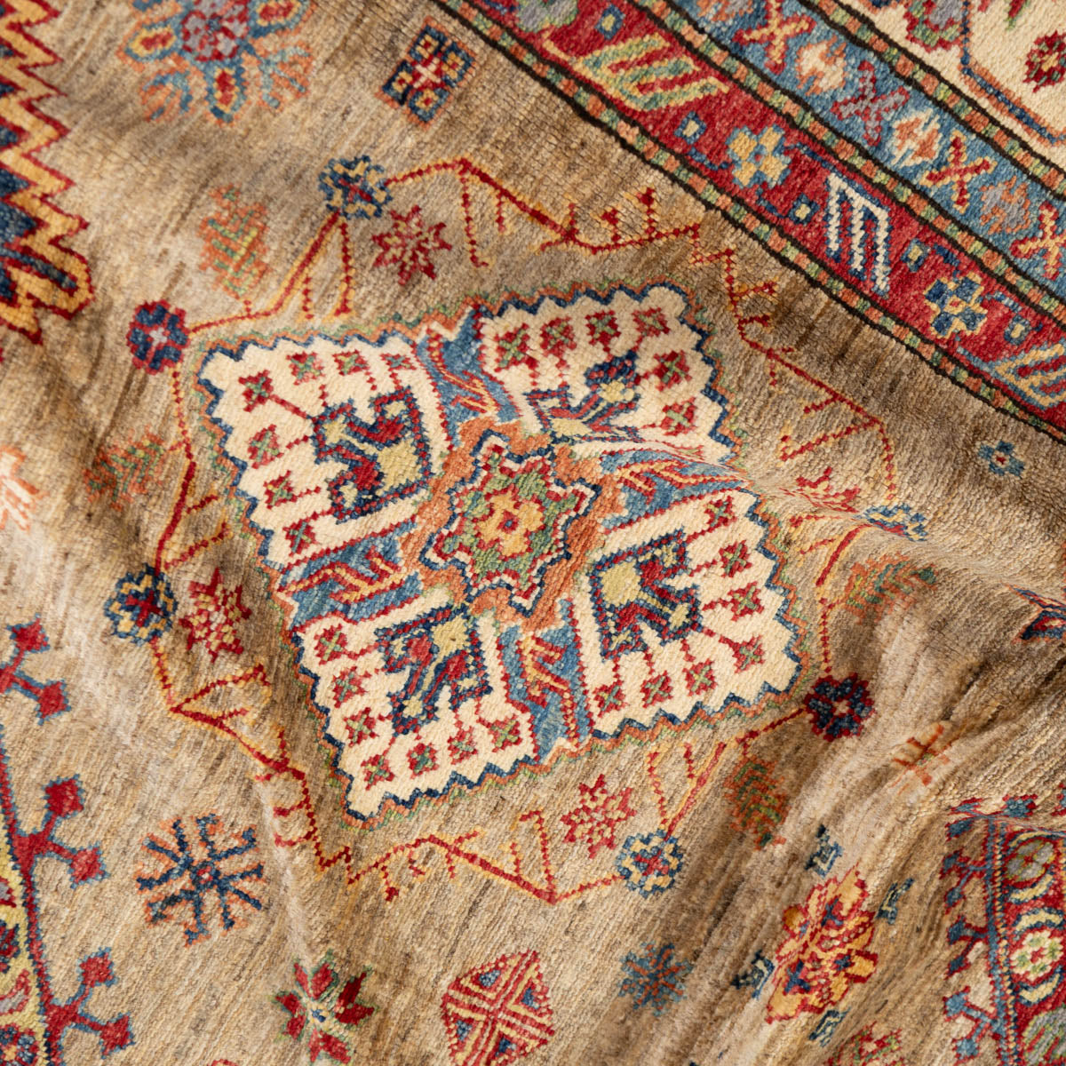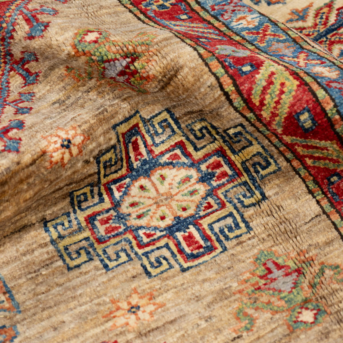 השטיח משלב גווני בז' טבעיים עם נגיעות של אדום, כחול, ירוק וזהב. הדפוסים הגיאומטריים והפרחוניים האופייניים לקזאק יוצרים מראה עשיר, מאוזן ואותנטי.