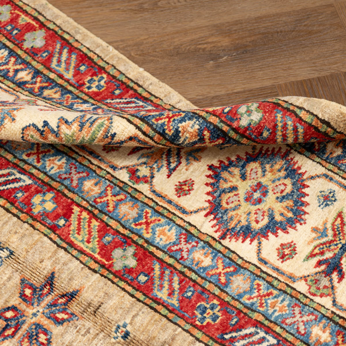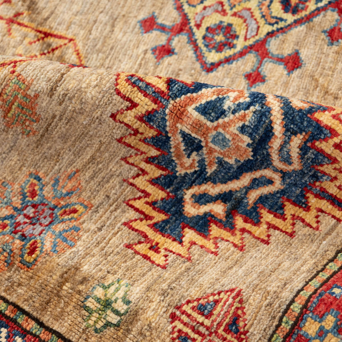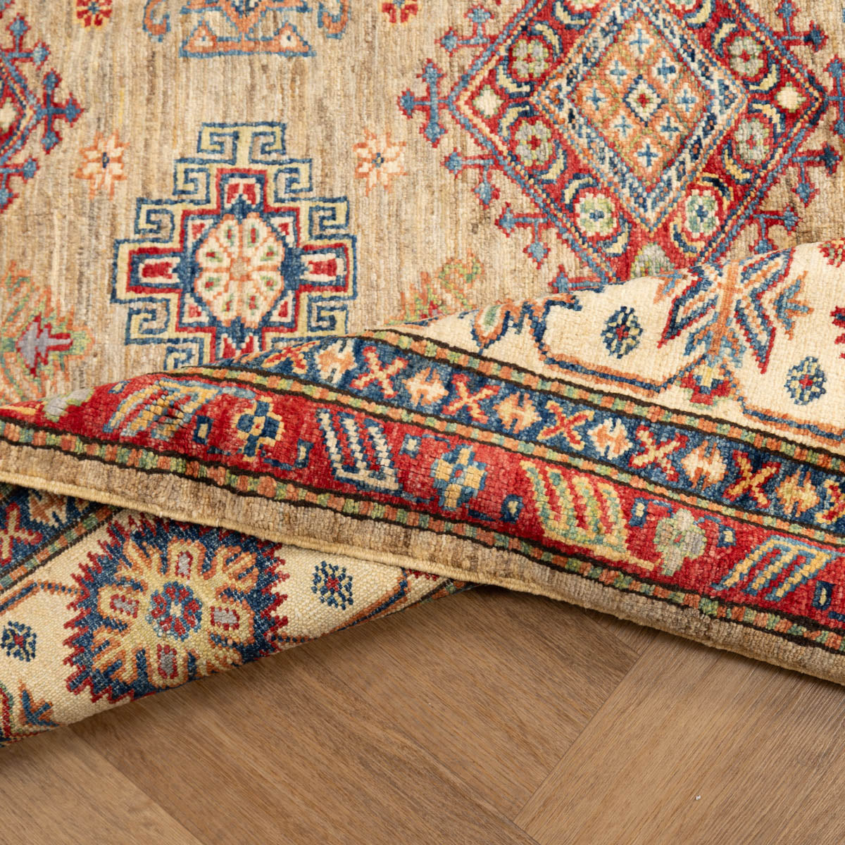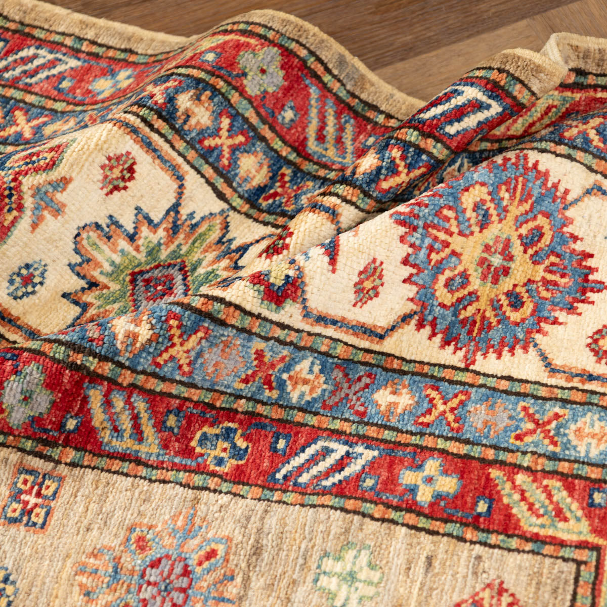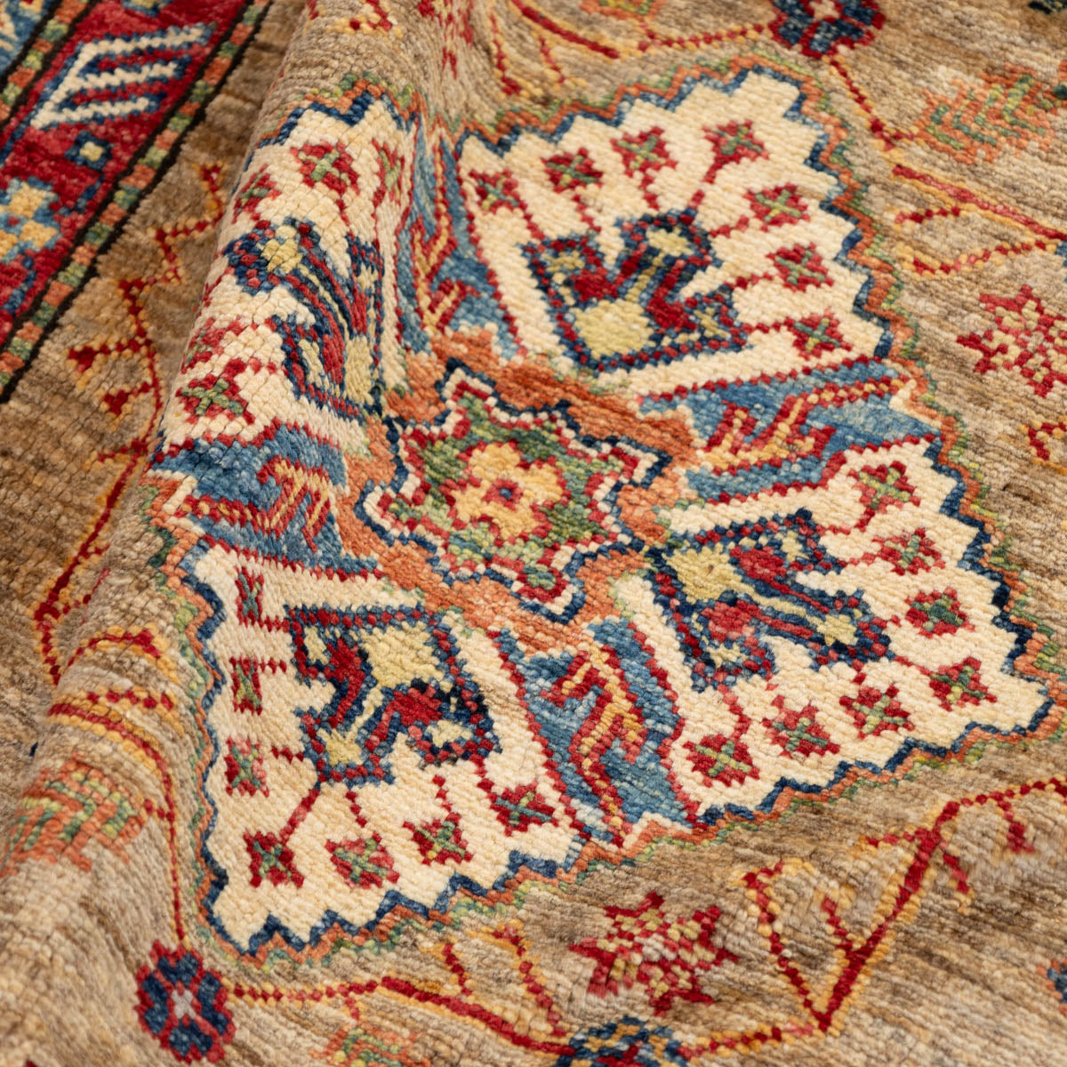 השטיח משלב גווני בז' טבעיים עם נגיעות של אדום, כחול, ירוק וזהב. הדפוסים הגיאומטריים והפרחוניים האופייניים לקזאק יוצרים מראה עשיר, מאוזן ואותנטי.