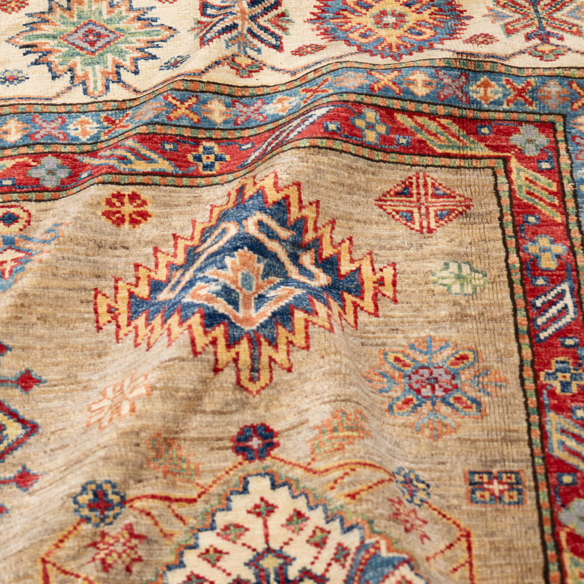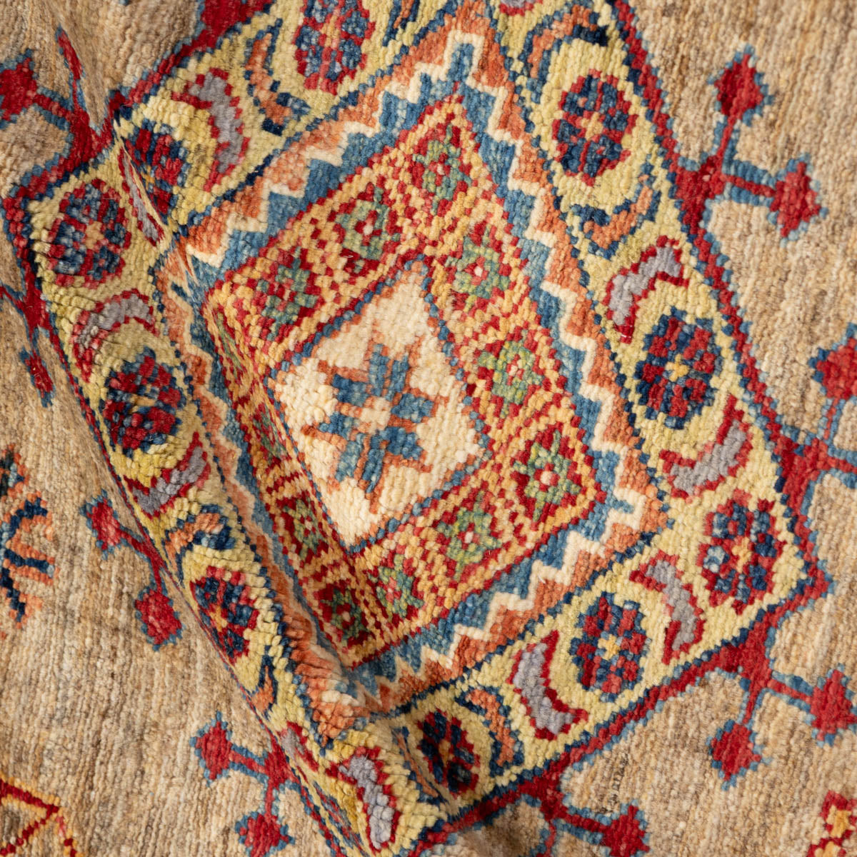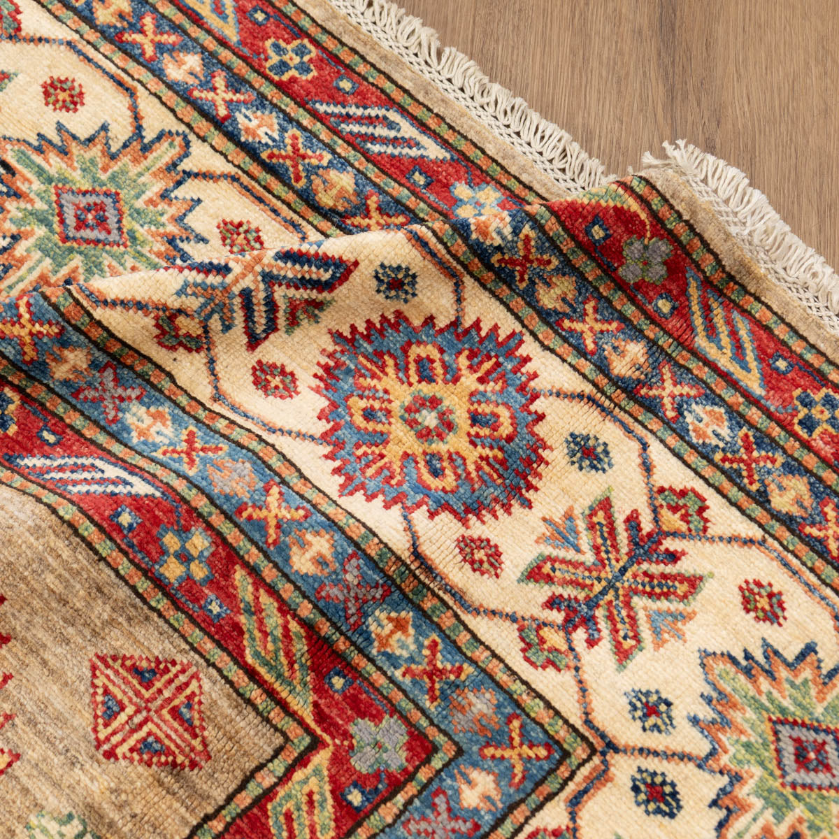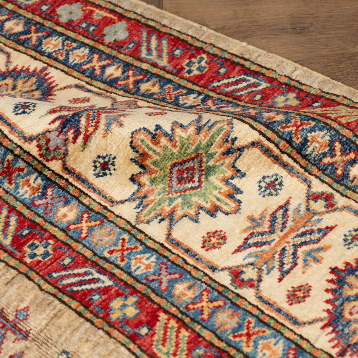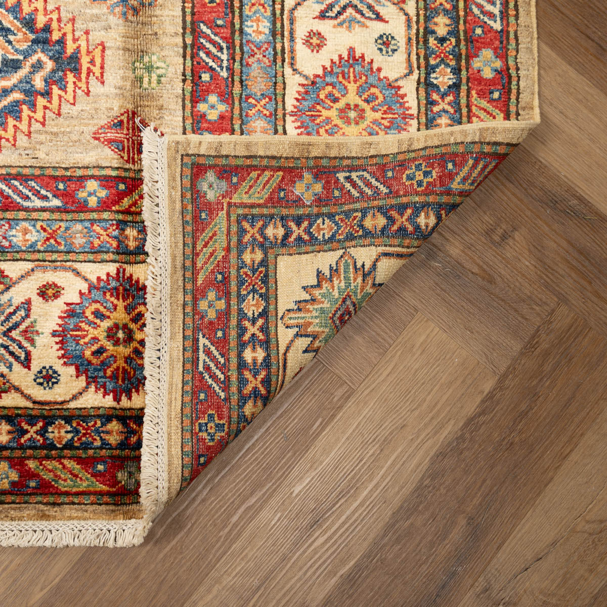 השטיח משלב גווני בז' טבעיים עם נגיעות של אדום, כחול, ירוק וזהב. הדפוסים הגיאומטריים והפרחוניים האופייניים לקזאק יוצרים מראה עשיר, מאוזן ואותנטי.
