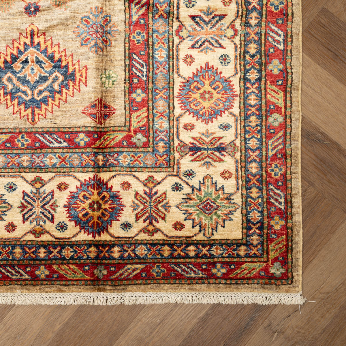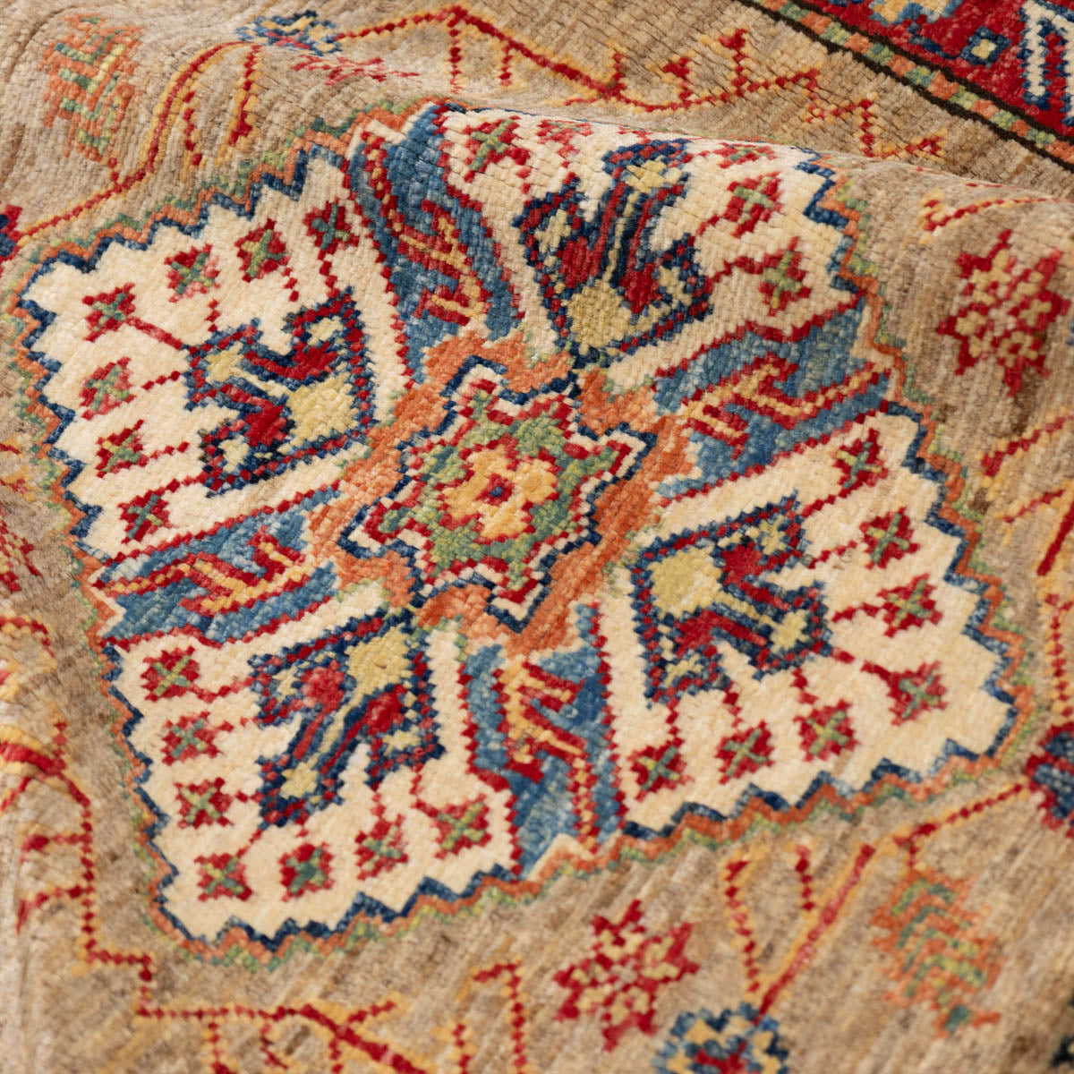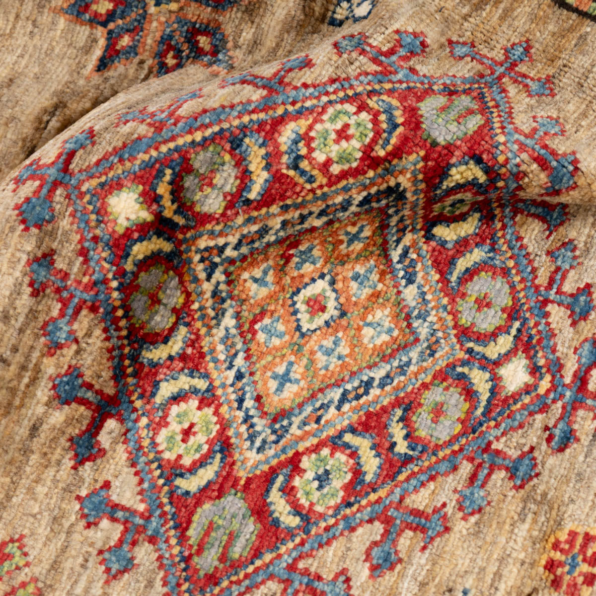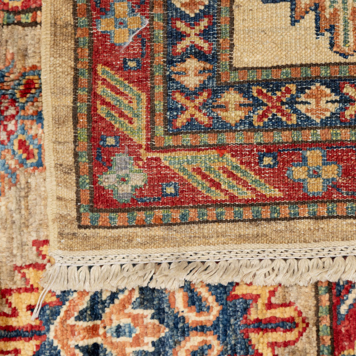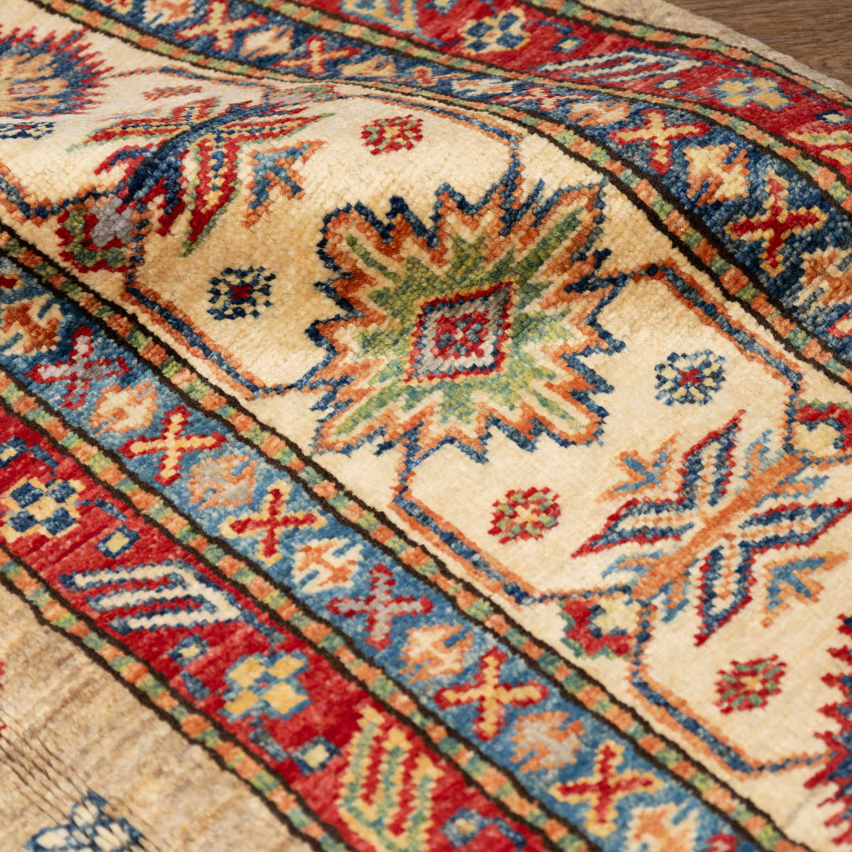 השטיח משלב גווני בז' טבעיים עם נגיעות של אדום, כחול, ירוק וזהב. הדפוסים הגיאומטריים והפרחוניים האופייניים לקזאק יוצרים מראה עשיר, מאוזן ואותנטי.