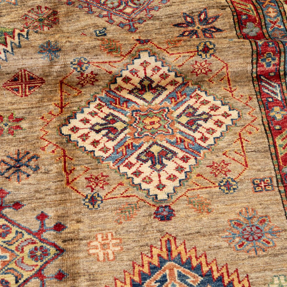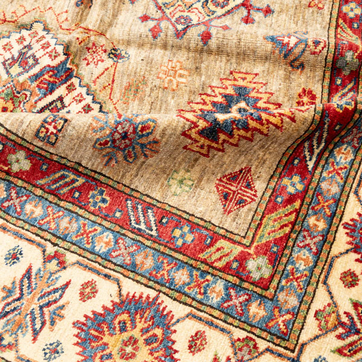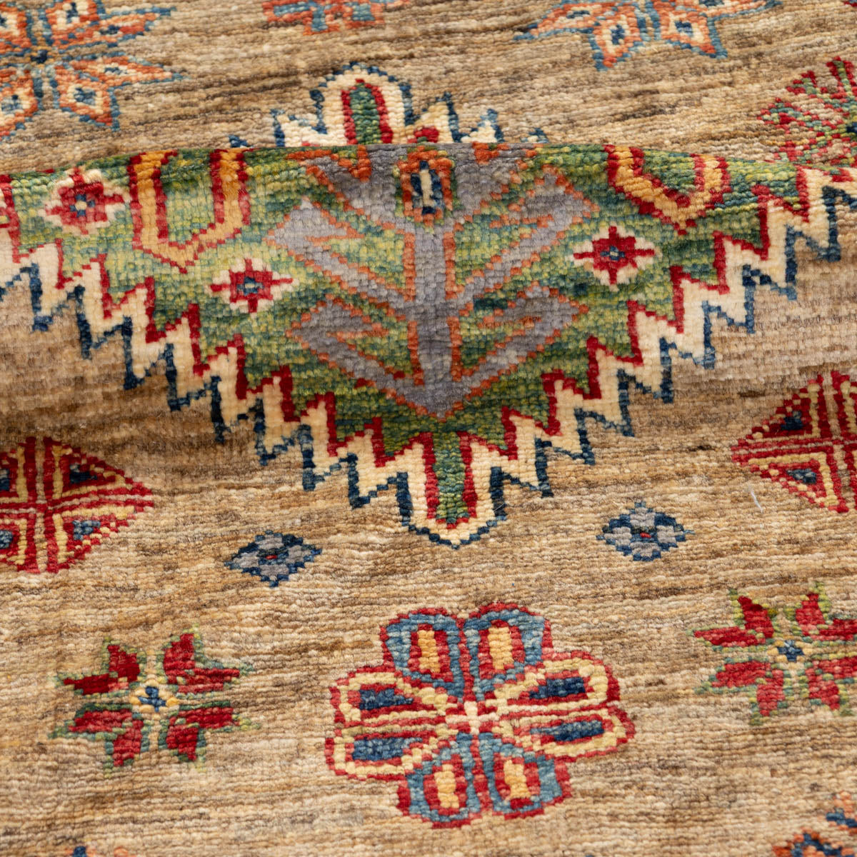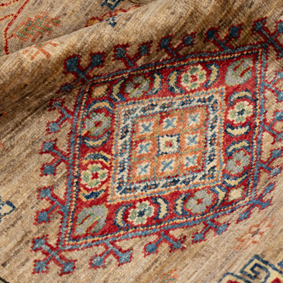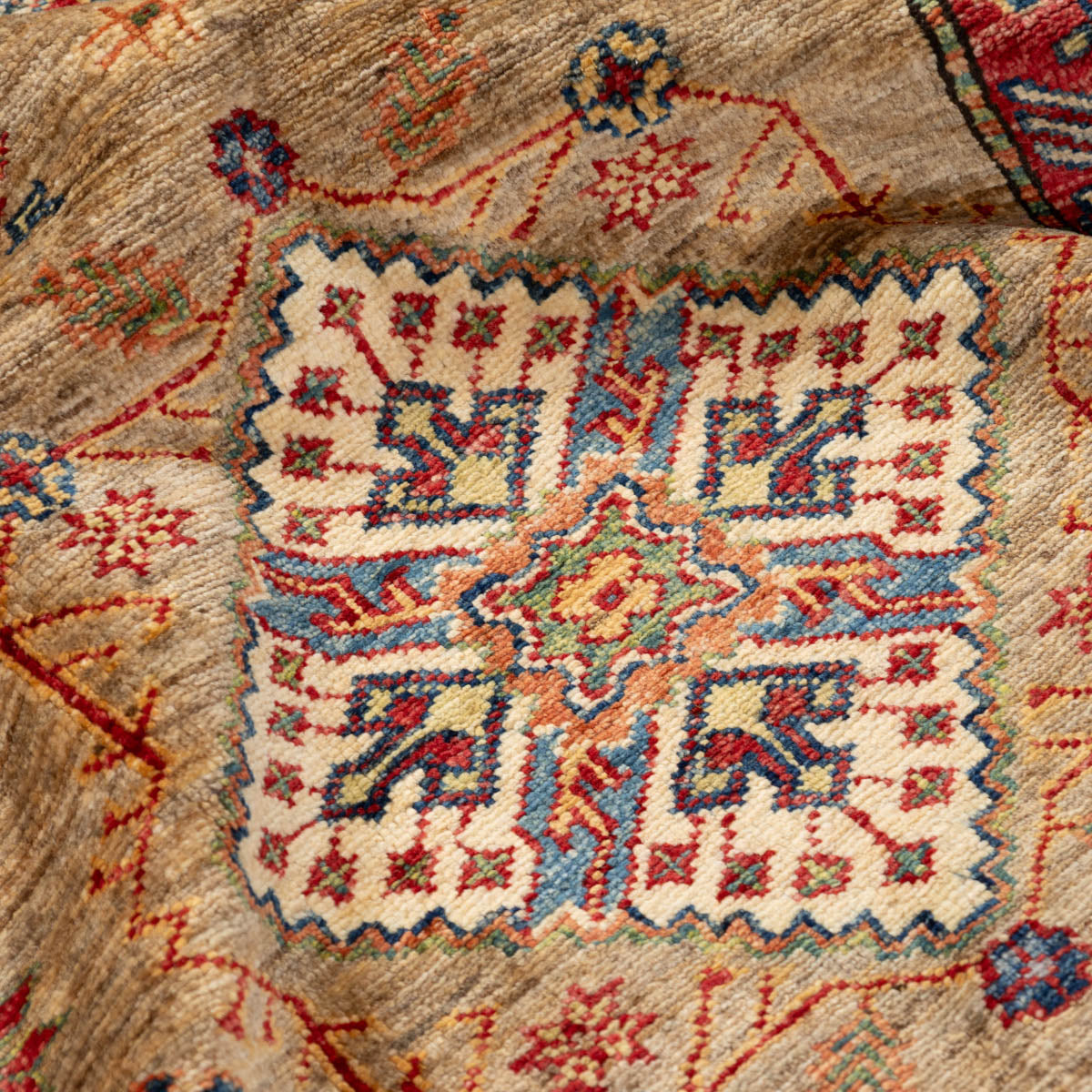 השטיח משלב גווני בז' טבעיים עם נגיעות של אדום, כחול, ירוק וזהב. הדפוסים הגיאומטריים והפרחוניים האופייניים לקזאק יוצרים מראה עשיר, מאוזן ואותנטי.