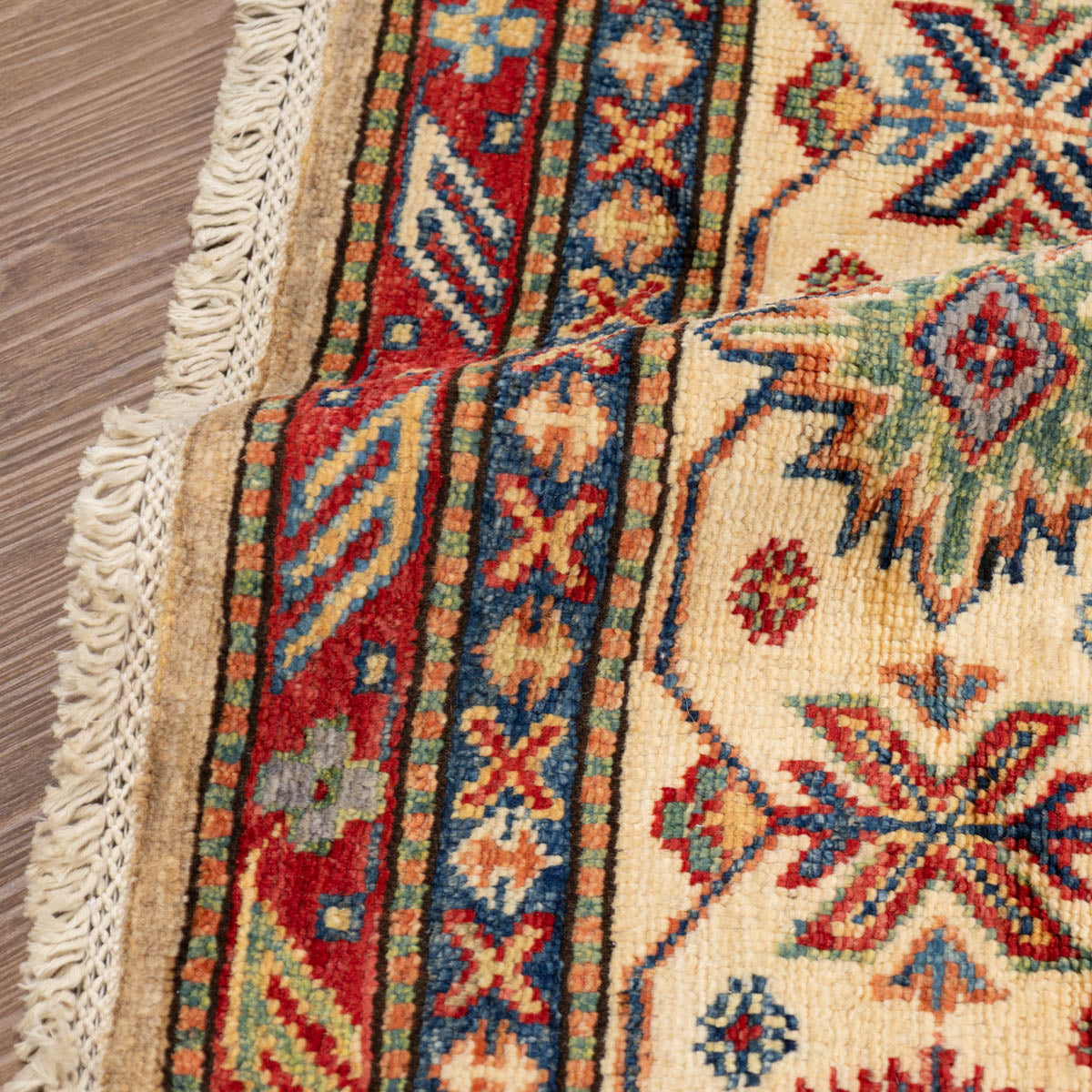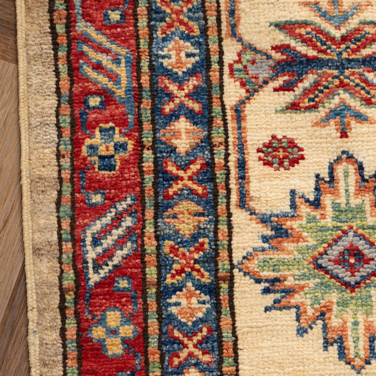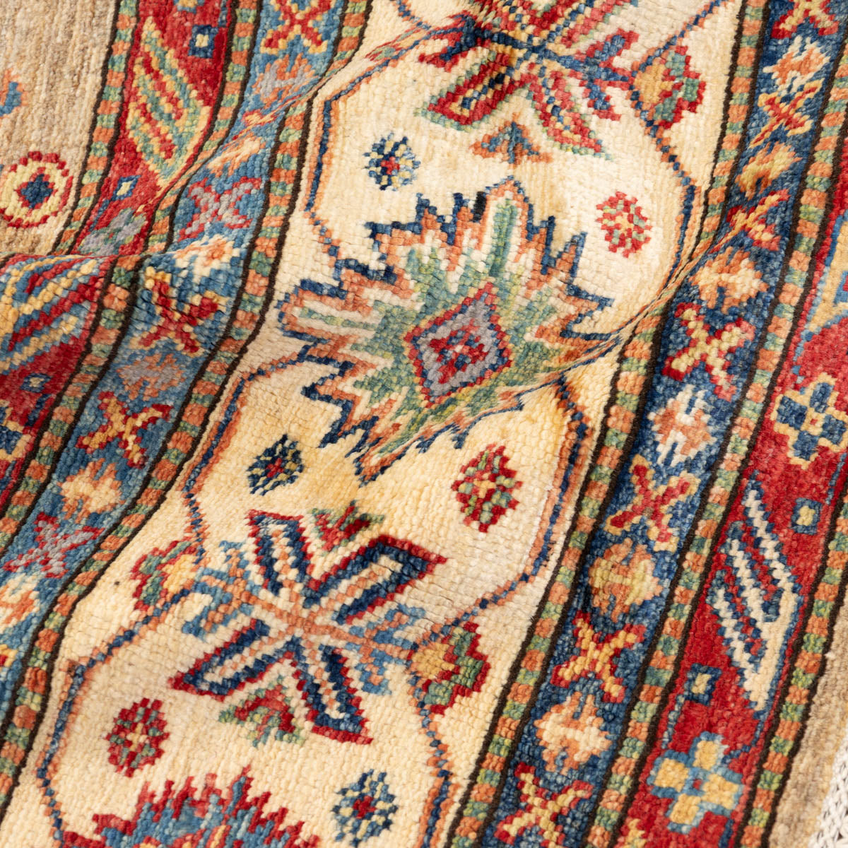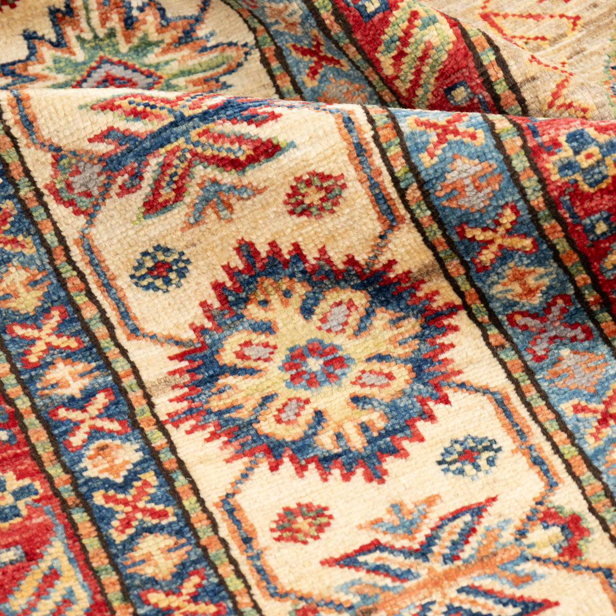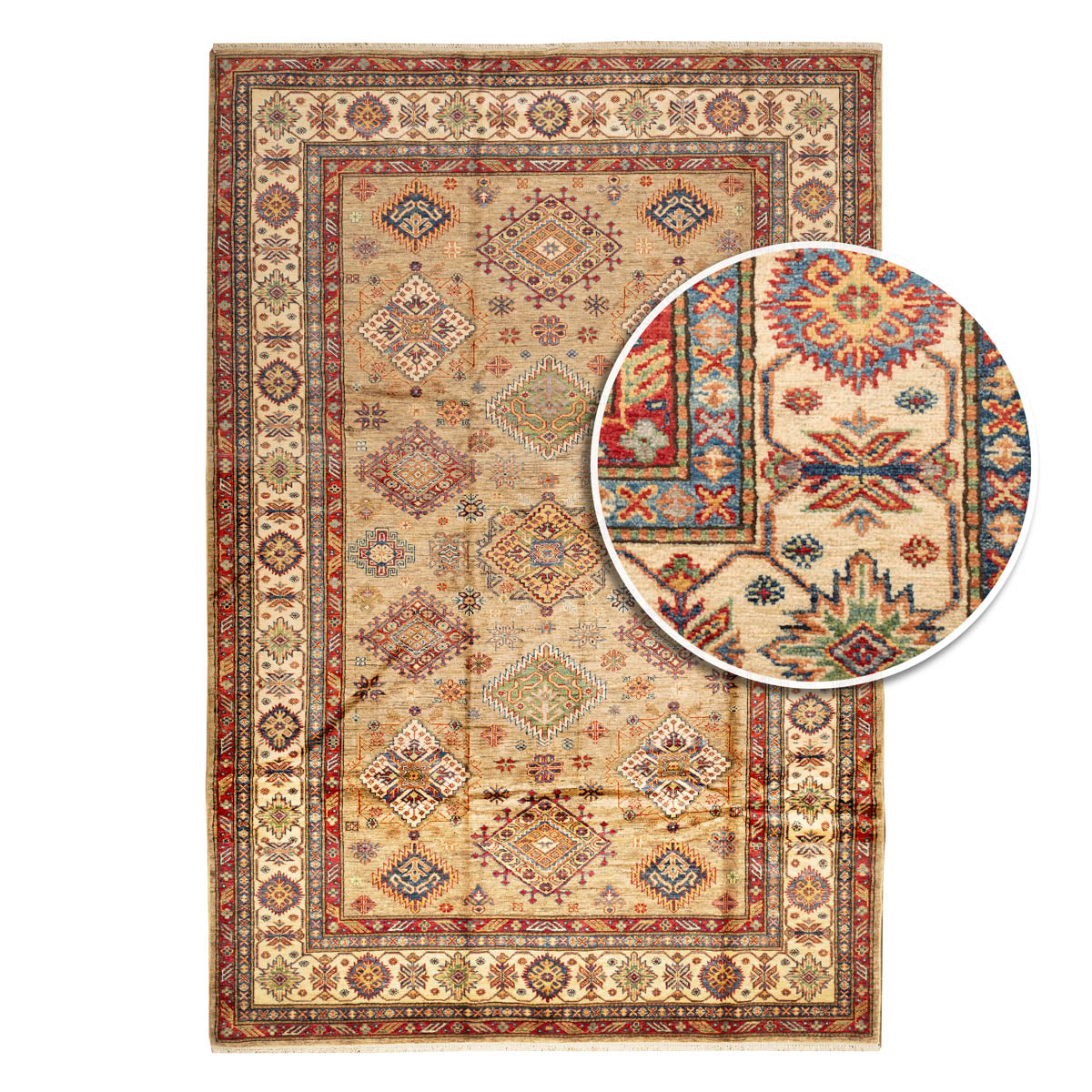 השטיח משלב גווני בז' טבעיים עם נגיעות של אדום, כחול, ירוק וזהב. הדפוסים הגיאומטריים והפרחוניים האופייניים לקזאק יוצרים מראה עשיר, מאוזן ואותנטי.