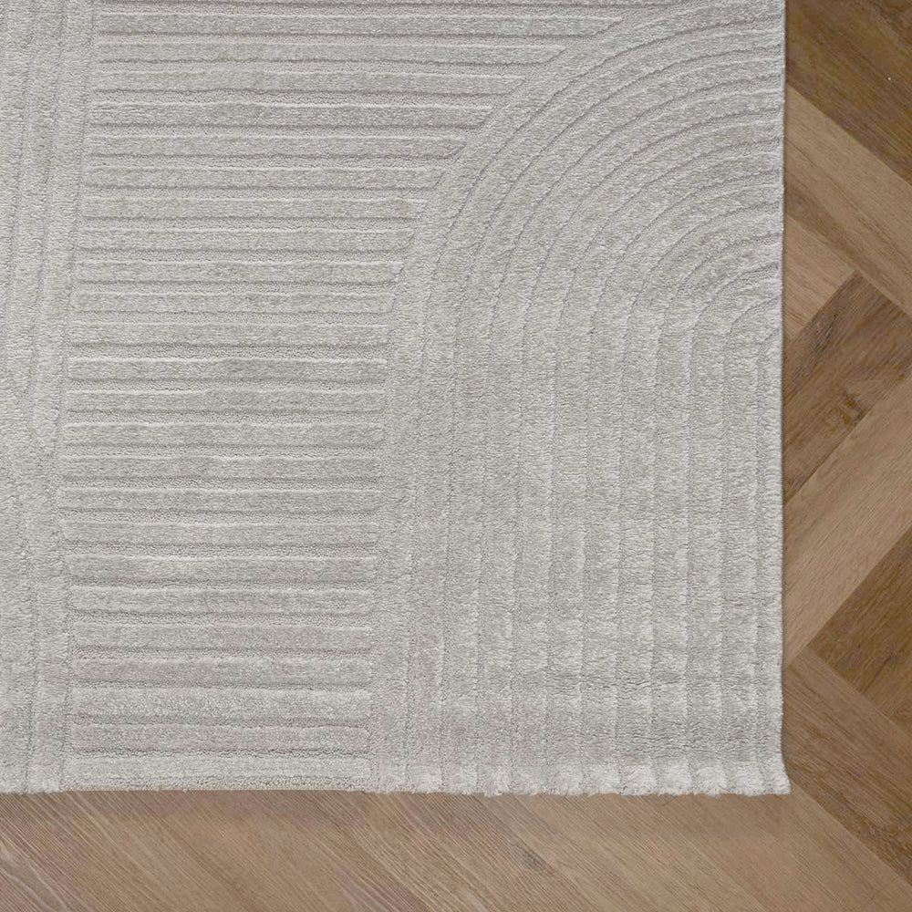שטיח מודרני, מדויק ומוקפד – בגוון אפור בהיר ובדוגמת תבליט גיאומטרית עדינה שמעניקה תחושת תנועה ואלגנטיות שקטה.