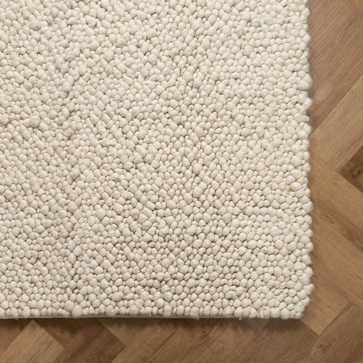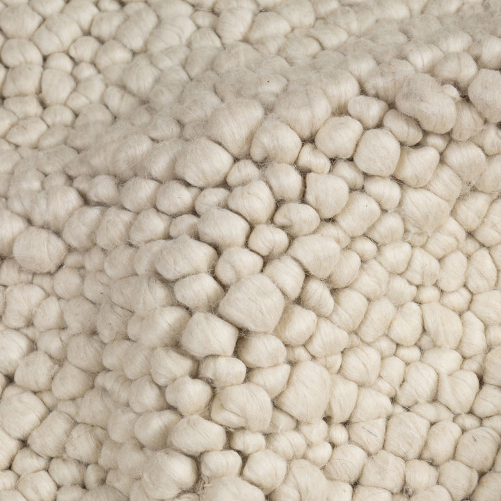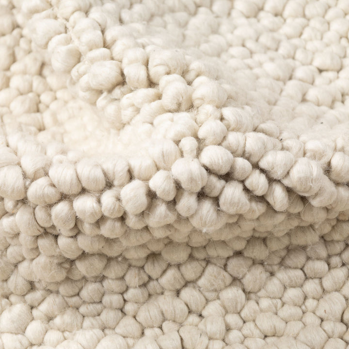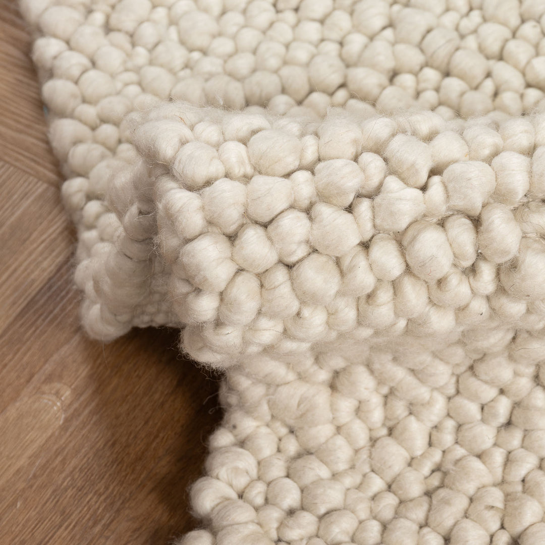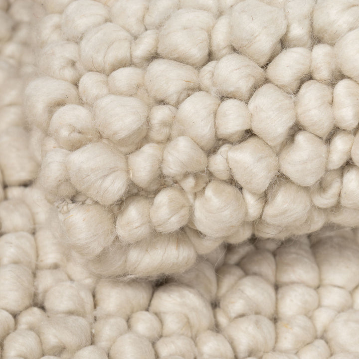 שטיח בעיצוב מינימליסטי, בגוון קרם רך, עשוי כדורוני צמר טבעי שמקנים לו מראה ייחודי וטקסטורה מהפנטת. מתאים במיוחד לחללים מוארים, סקנדינביים או כבסיס רגוע לפינה חמימה.