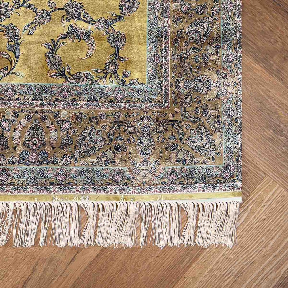 שטיח משי קום 05 הוא דוגמה נפלאה לעיצוב אלגנטי ומסורתי, העשוי ממשי מלאכותי איכותי המעניק לו ברק מרשים ומגע רך ונעים. השטיח מיוצר בטכנולוגיה מתקדמת המאפשרת צפיפות גבוהה במיוחד ודיוק מרשים המקנה לו מראה יוקרתי המזכיר שטיחים בעבודת יד.