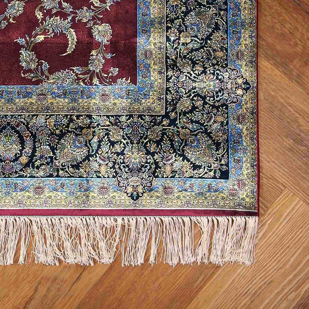 השטיח מעוצב בגוון אדום עמוק, המעוטר בדוגמאות פרחוניות מתפתלות בגווני שנהב, כחול וזהב. המראה הדינמי של העיטורים השזורים במיומנות על פני הרקע האדום יוצר תחושת עומק ותחכום. מסגרת עשירה בדפוסים עדינים מקיפה את השטיח ומוסיפה לו נופך מלכותי ומדויק.
