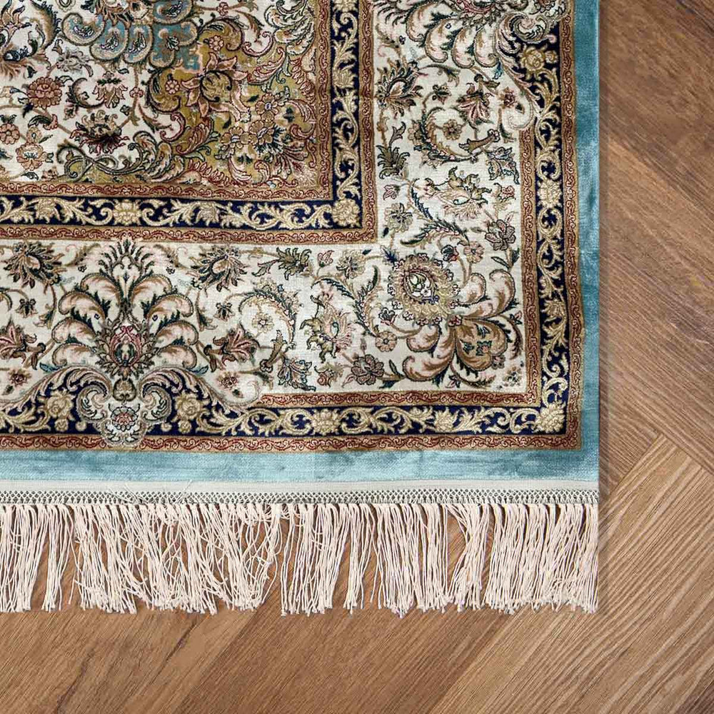 השטיח מעוצב בגוון טורקיז רך, המעוטר במוטיבים פרחוניים מפוארים ודפוסים עדינים בגווני שמנת, חום וזהב. במרכז השטיח בולטת מנדלה סימטרית ומורכבת, שמוסיפה תחושת עומק והרמוניה עיצובית לכל חלל בו יוצב.