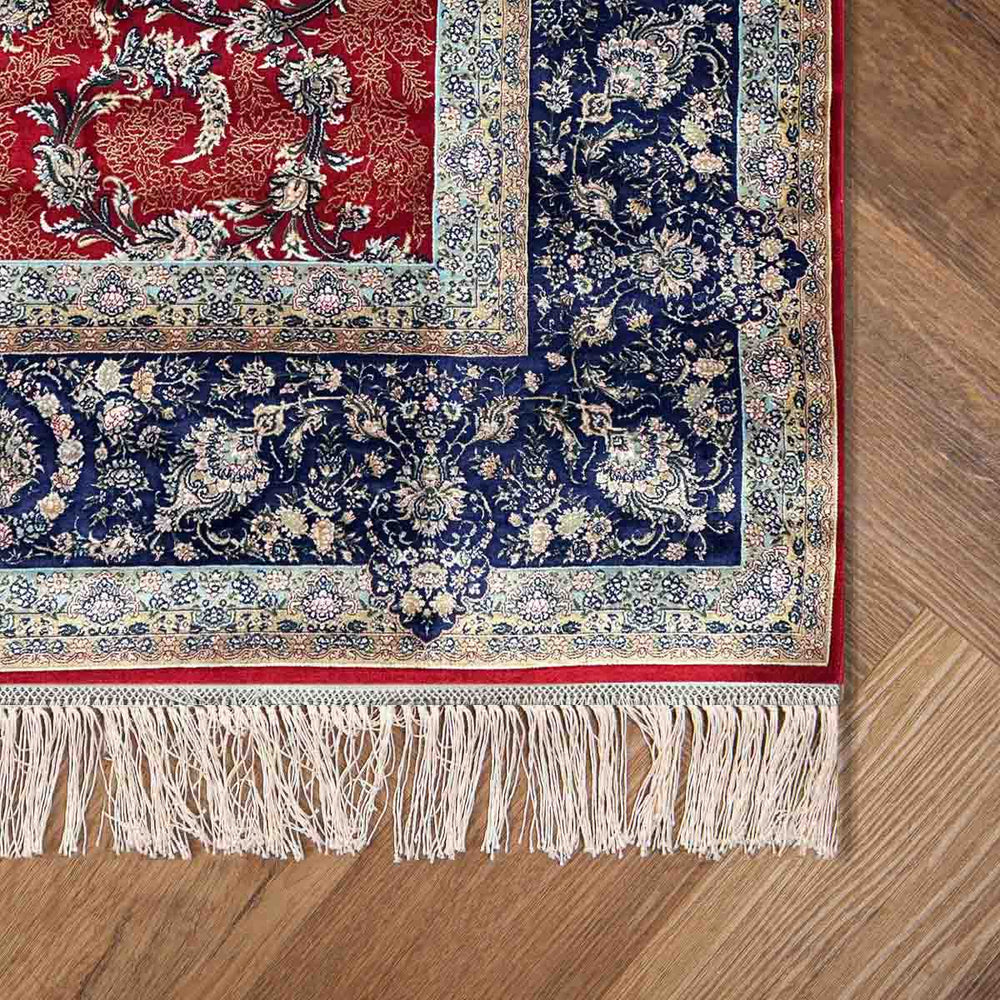 שטיח קום משי 10 בגוון אדום עז הוא שטיח ייחודי המשלב דוגמה פרסית מסורתית עם תחושת יוקרה מרשימה. העיטורים הסימטריים והטקסטורה העשירה משתלבים עם פלטת צבעים מרהיבה – אדום עמוק, שמנת, זהב וכחול – ויוצרים מראה מלא נוכחות ואלגנטיות.