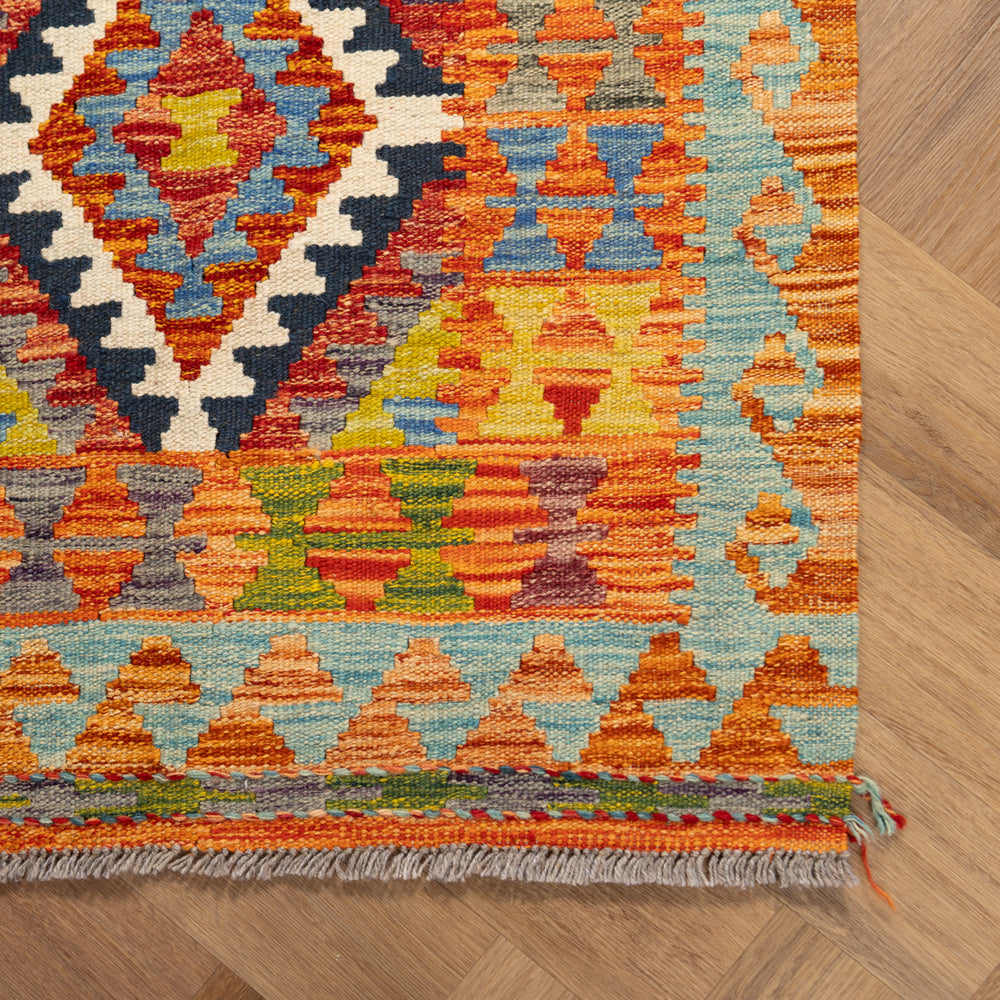 שטיח קילים צבעוני, ארוג בעבודת יד בשיטת אריגה שטוחה (Flat Weave) עם דוגמאות שבטיות גיאומטריות ועושר של גוונים חמים.