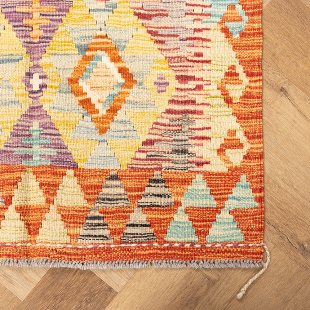 שטיח קילים צבעוני, ארוג בעבודת יד בשיטת אריגה שטוחה (Flat Weave) עם דוגמאות שבטיות גיאומטריות ועושר של גוונים חמים.