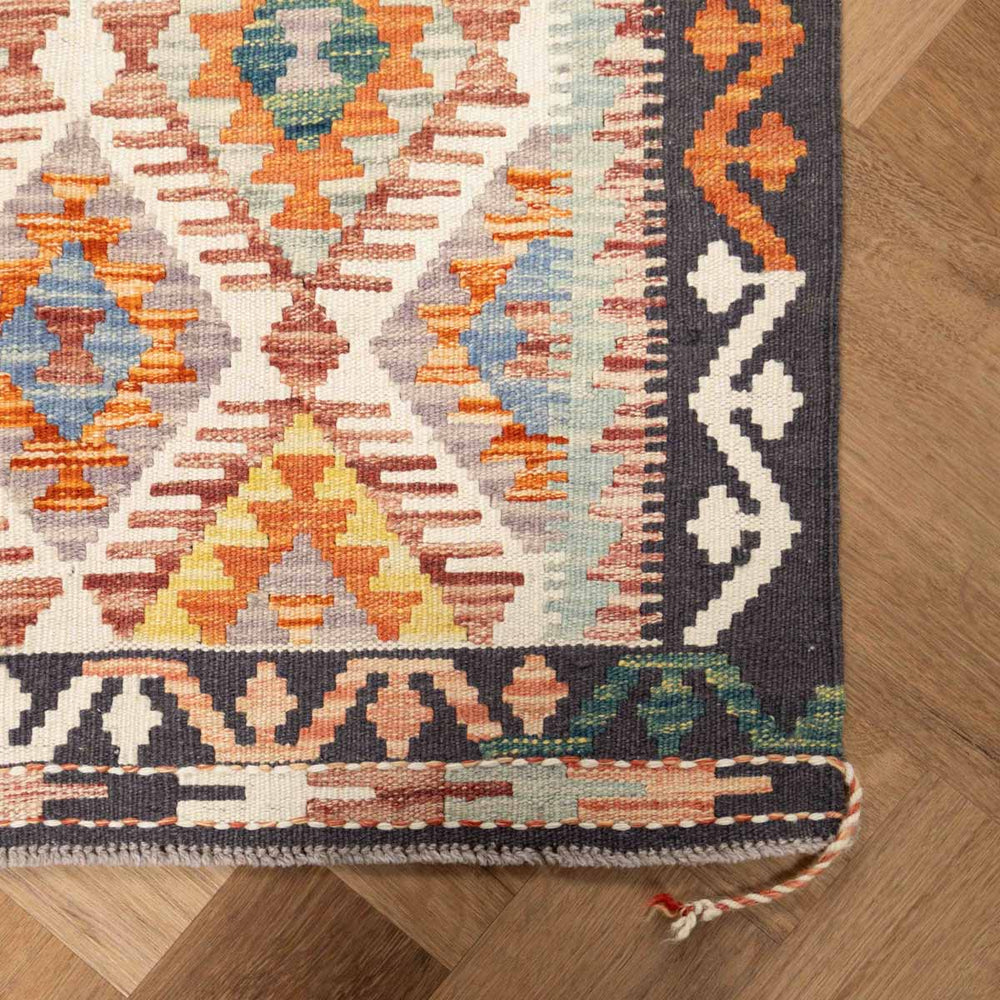 שטיח קילים צבעוני, ארוג בעבודת יד בשיטת אריגה שטוחה (Flat Weave) עם דוגמאות שבטיות גיאומטריות ועושר של גוונים חמים.