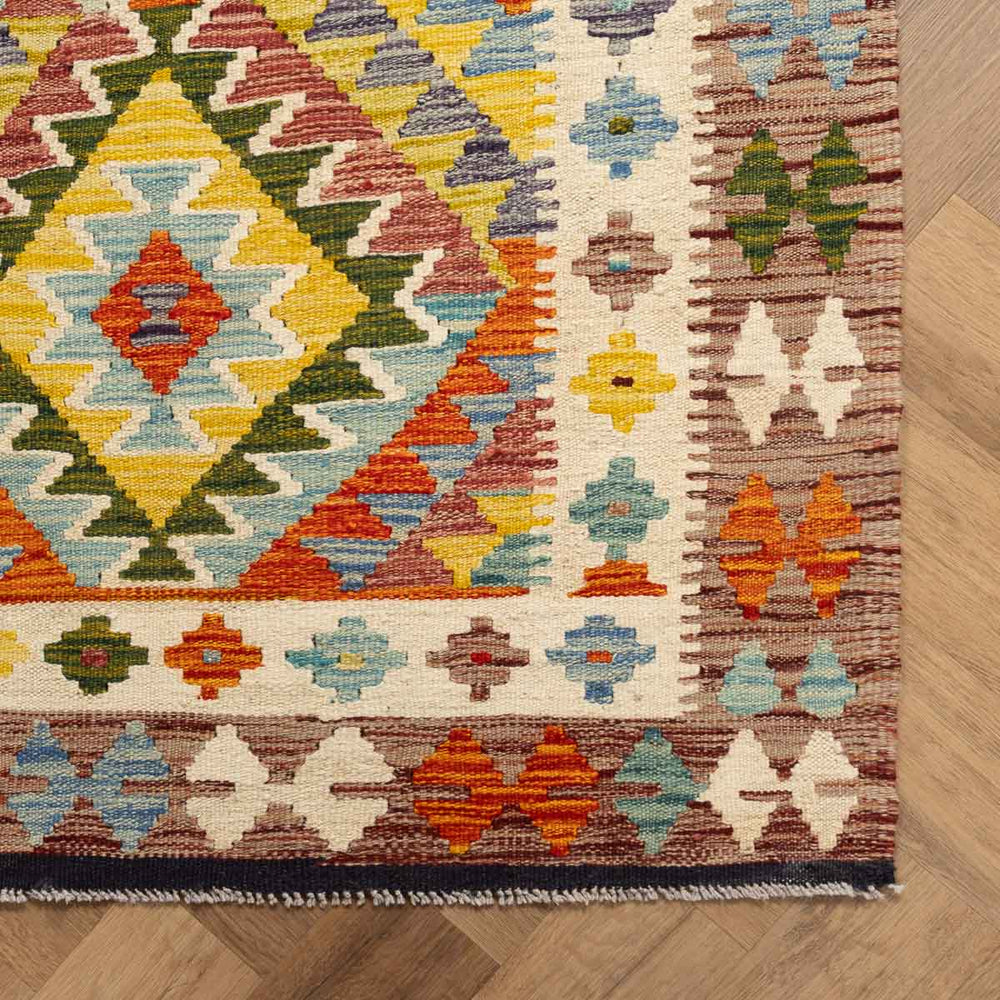 שטיח קילים צבעוני בעבודת אריגה שטוחה, עשוי צמר טבעי וארוג ביד בשיטה מסורתית המאפיינת את אזור אפגניסטן. העיצוב האתני מלא חיים, עם שילובי צבעים עשירים שמכניסים חמימות לכל חלל.