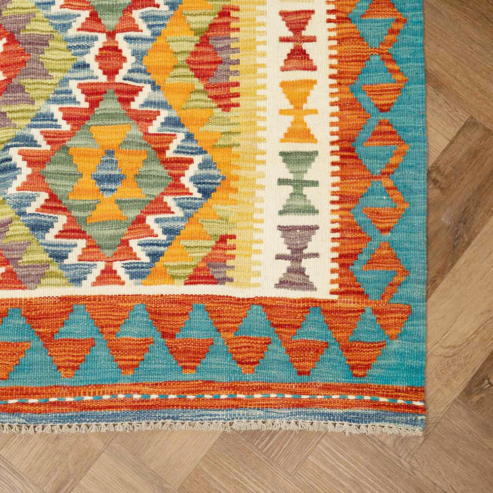 שטיח קילים בעיצוב שבטי מסורתי, ארוג בטכניקה שטוחה בצמר טבעי ומשלב גוונים עזים של כתום, ירוק, תכלת, אדום וצהוב. דוגמת היהלומים המרכזית מוקפת במסגרת צבעונית עשירה שמוסיפה חיות לכל חלל.