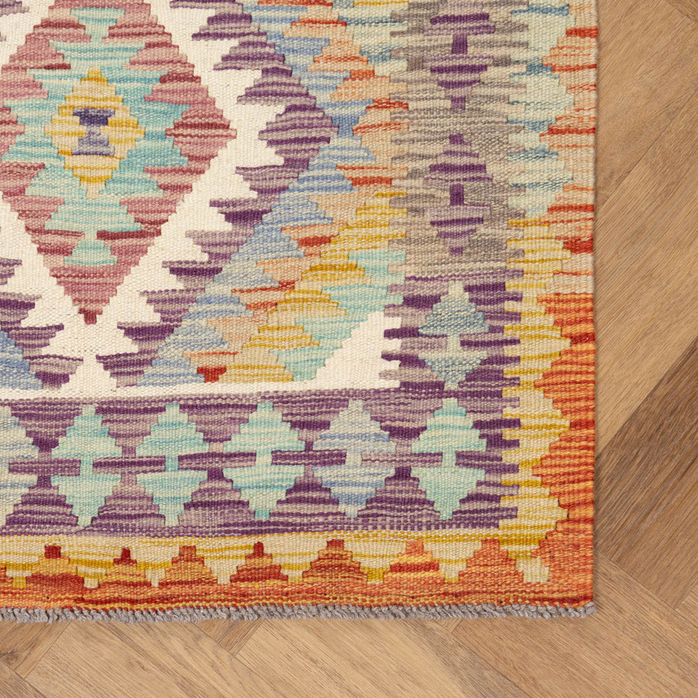 שטיח באריגה שטוחה בעבודת יד, בטכניקת קילים מסורתית מהרי אפגניסטן. שילוב גוונים עשיר במיוחד – סגול, תכלת, כתום, ירוק וצהוב – בדוגמה גיאומטרית שבטית המעניקה עומק, חום ואופי לכל חלל.