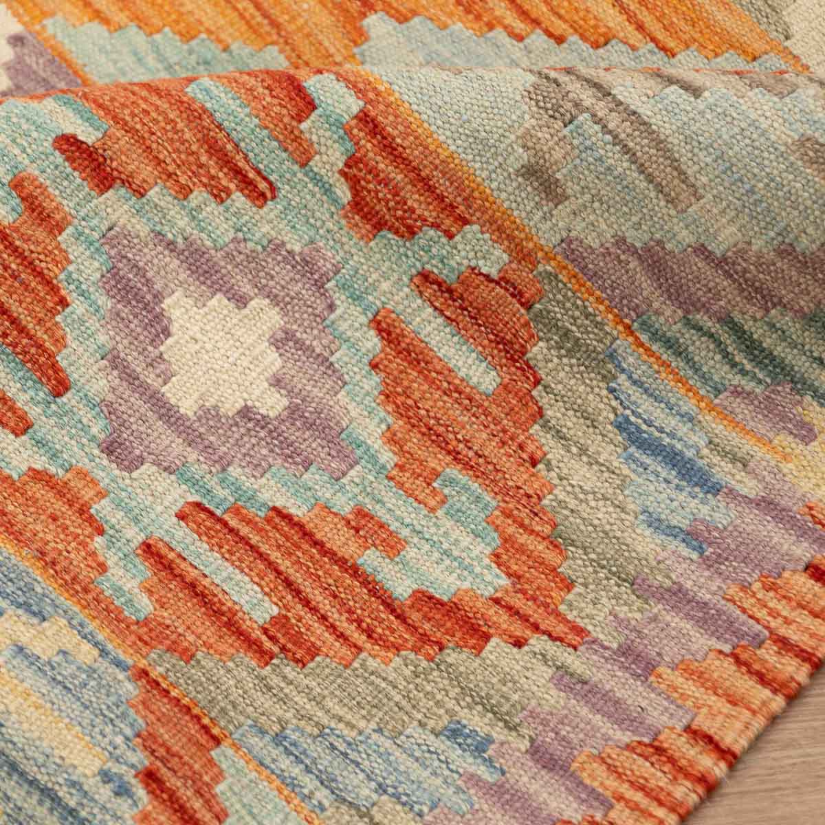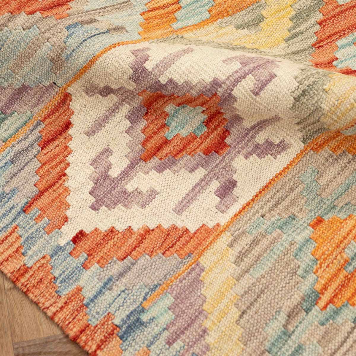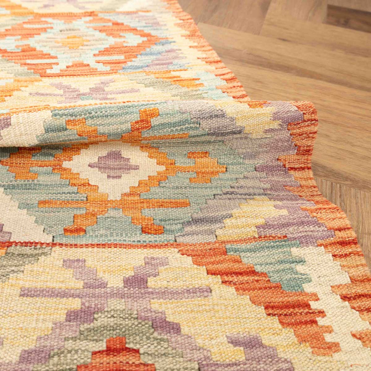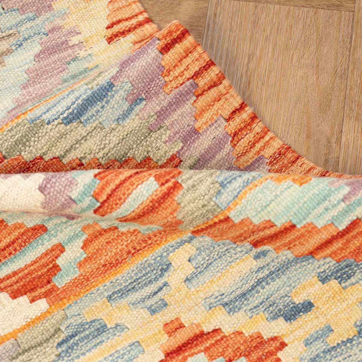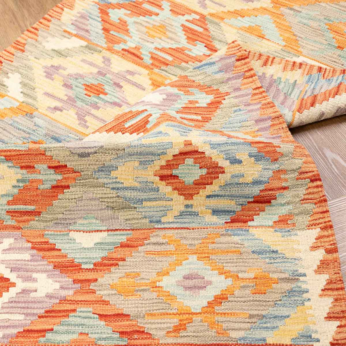 השטיח שזור בדוגמה גיאומטרית אפגנית מסורתית, עם שילוב צבעים עשיר בגווני כתום, תכלת, צהוב, בז', סגול וירקרק. הדפוסים המשושים והיהלומיים יוצרים תנועה שמחמיאה במיוחד למסדרונות ומעברים.