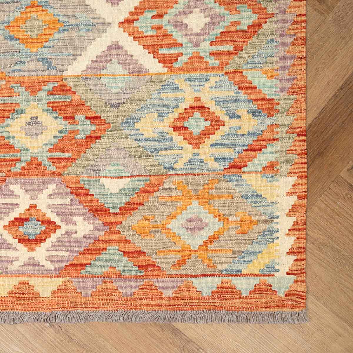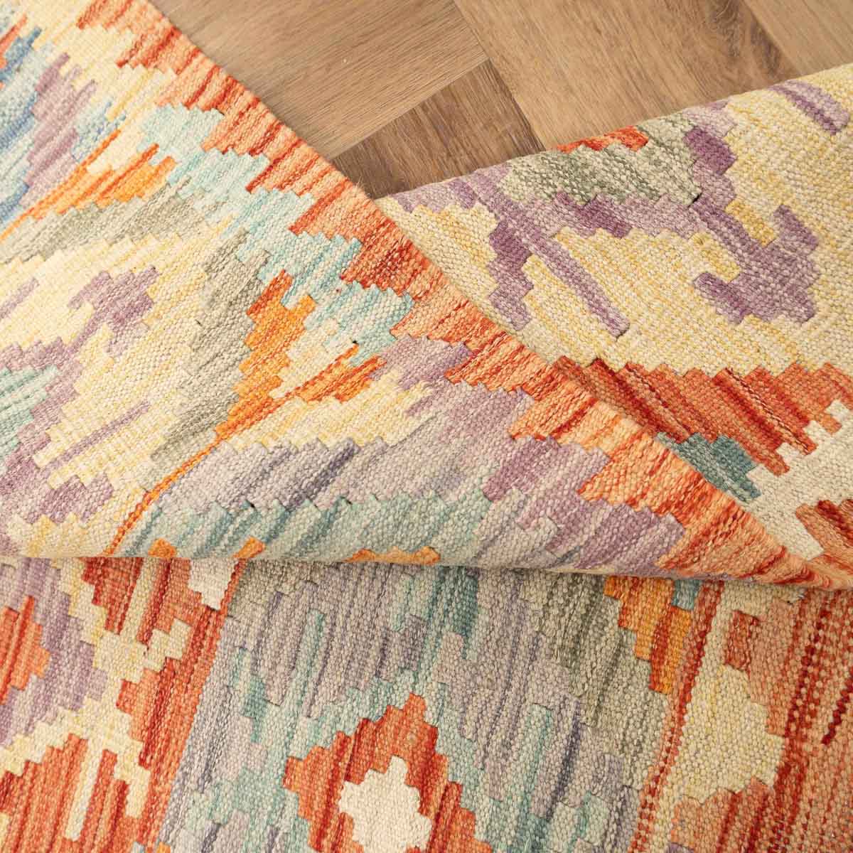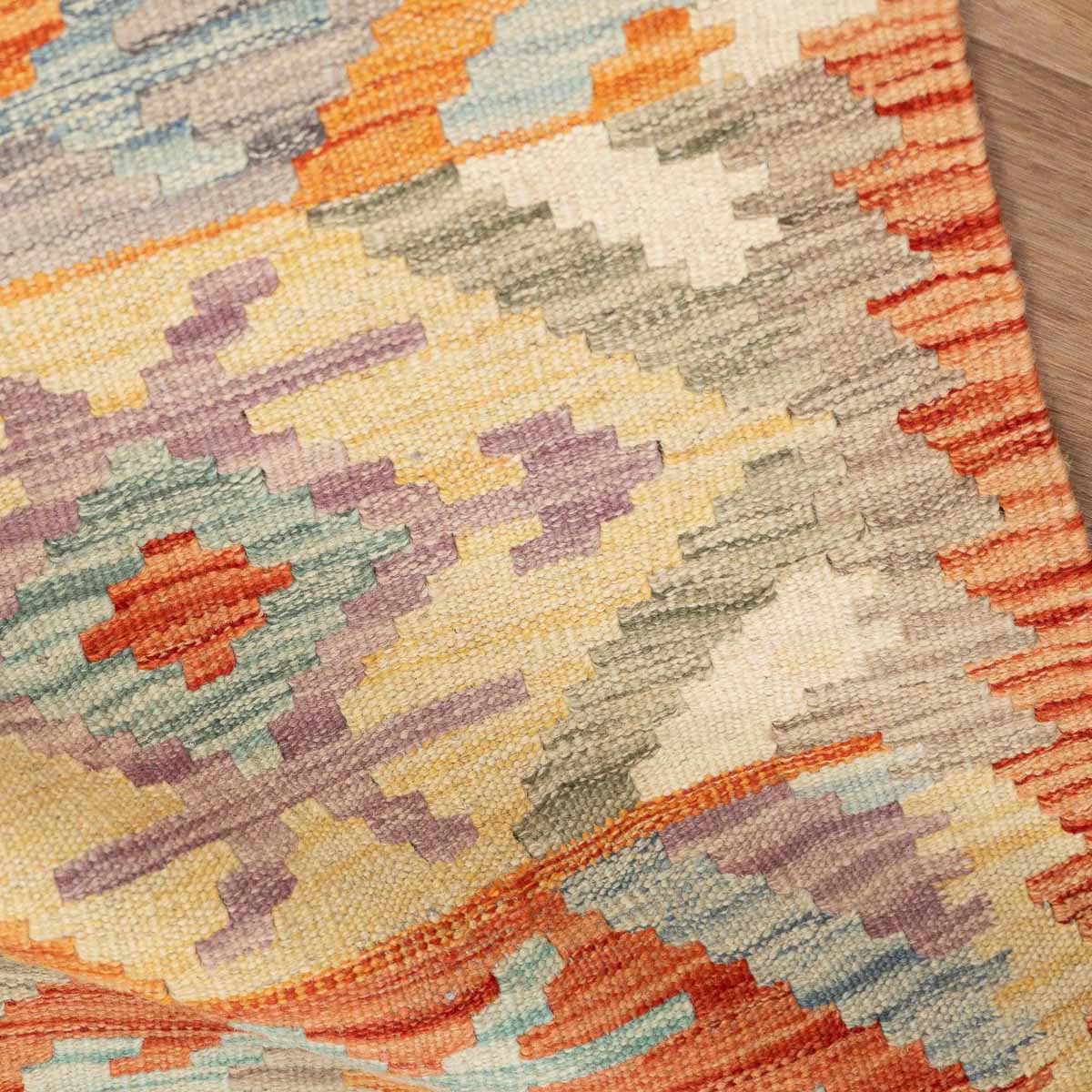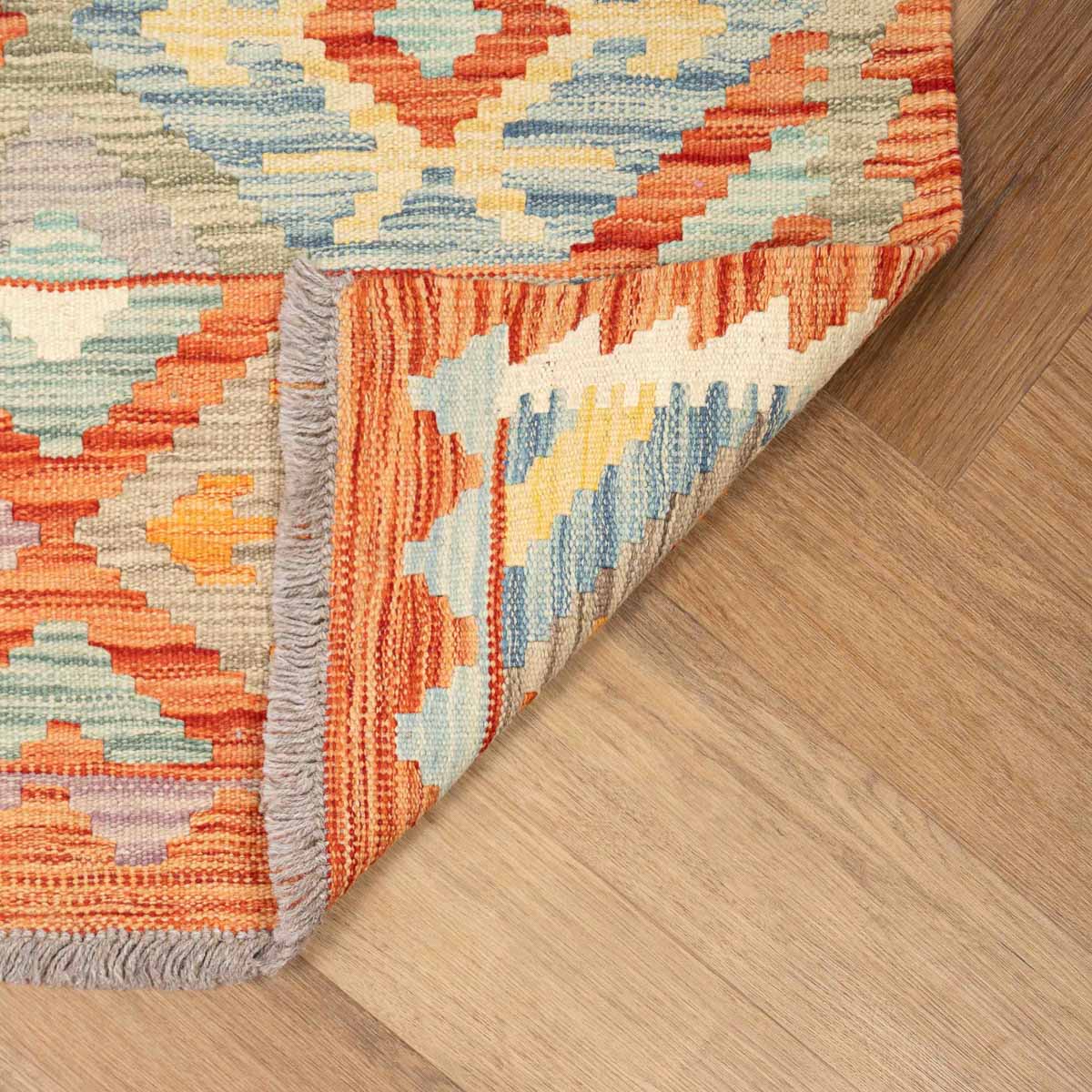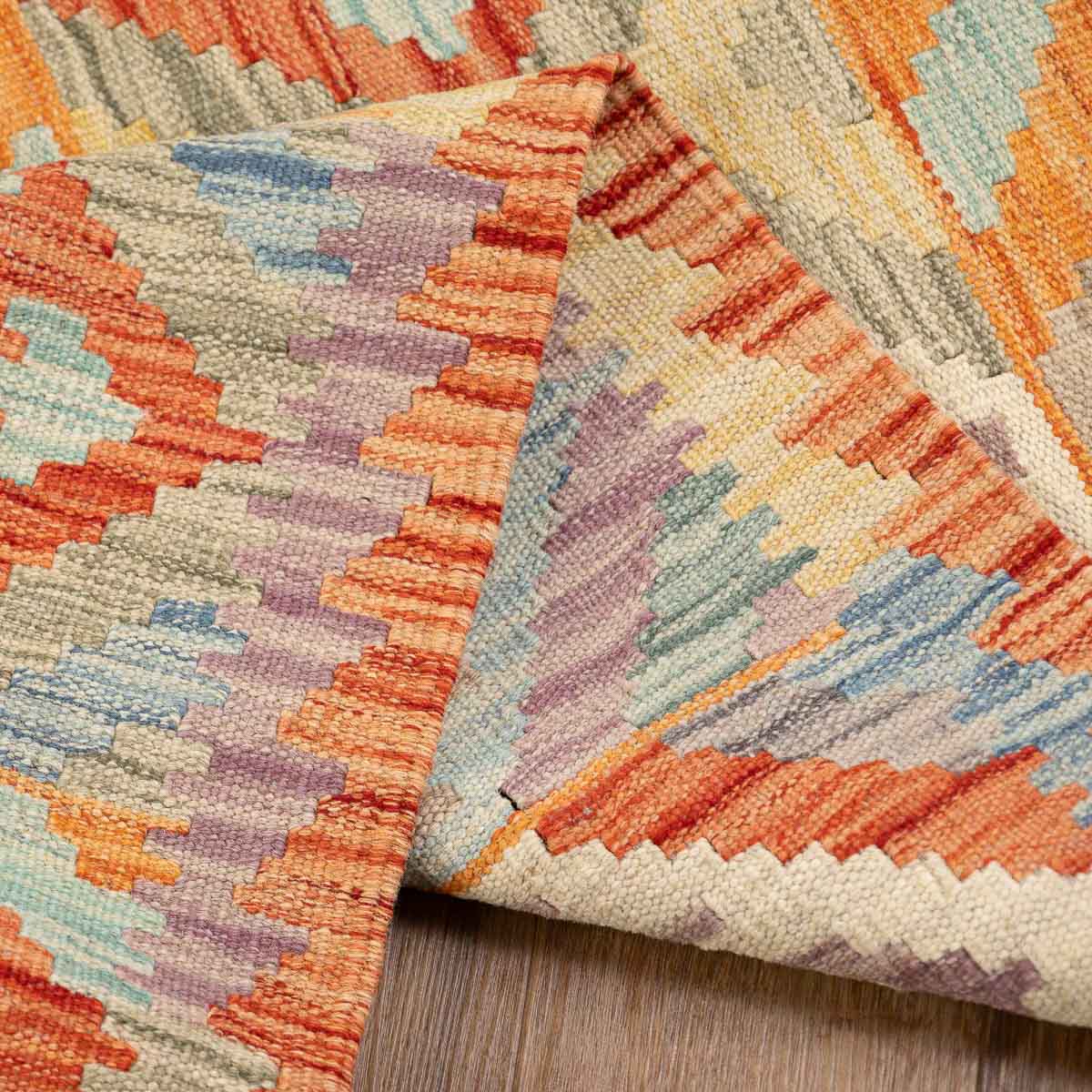 השטיח שזור בדוגמה גיאומטרית אפגנית מסורתית, עם שילוב צבעים עשיר בגווני כתום, תכלת, צהוב, בז', סגול וירקרק. הדפוסים המשושים והיהלומיים יוצרים תנועה שמחמיאה במיוחד למסדרונות ומעברים.