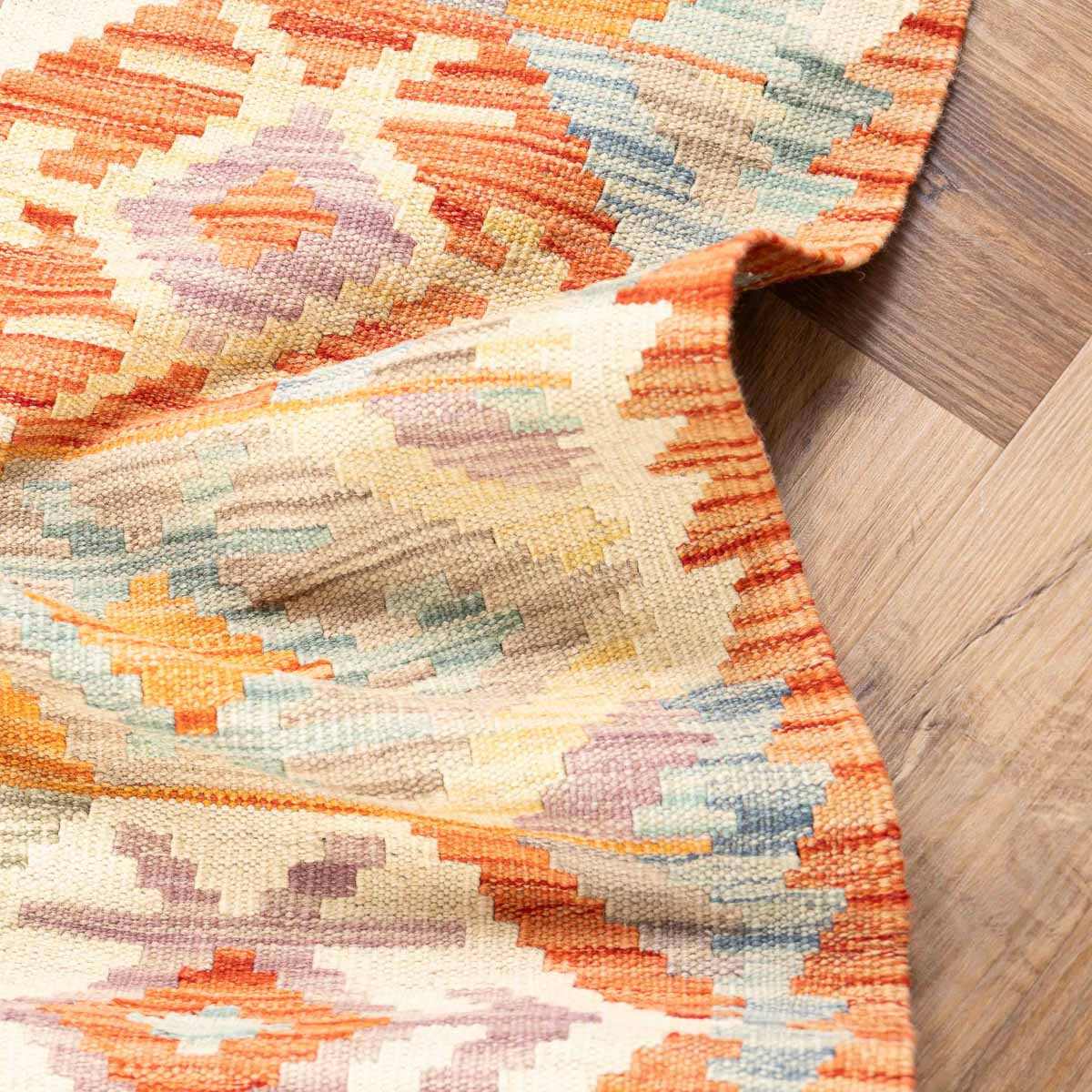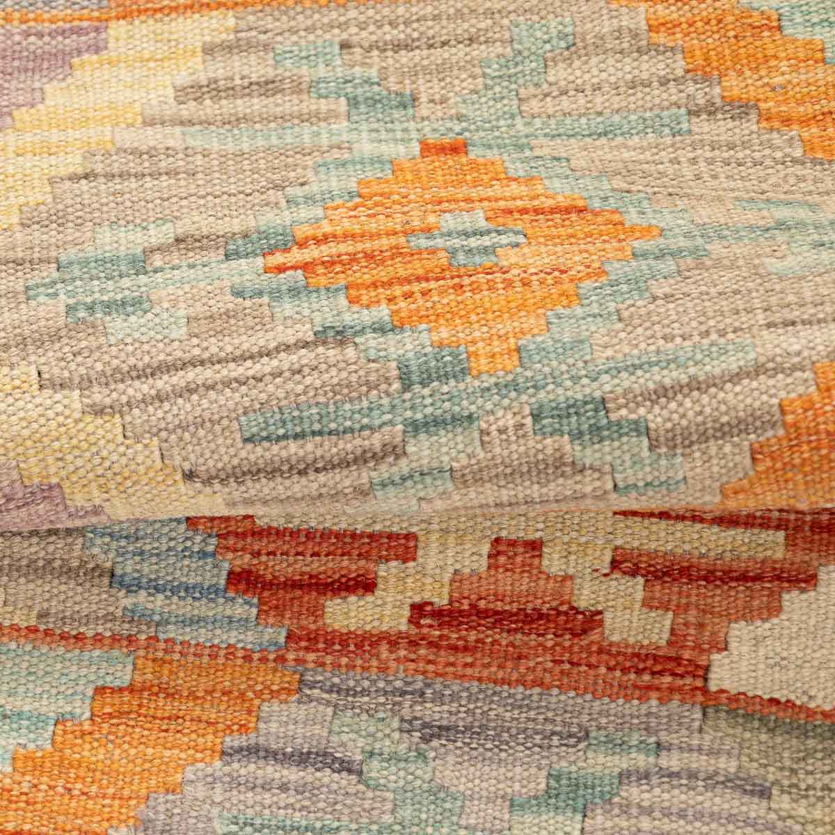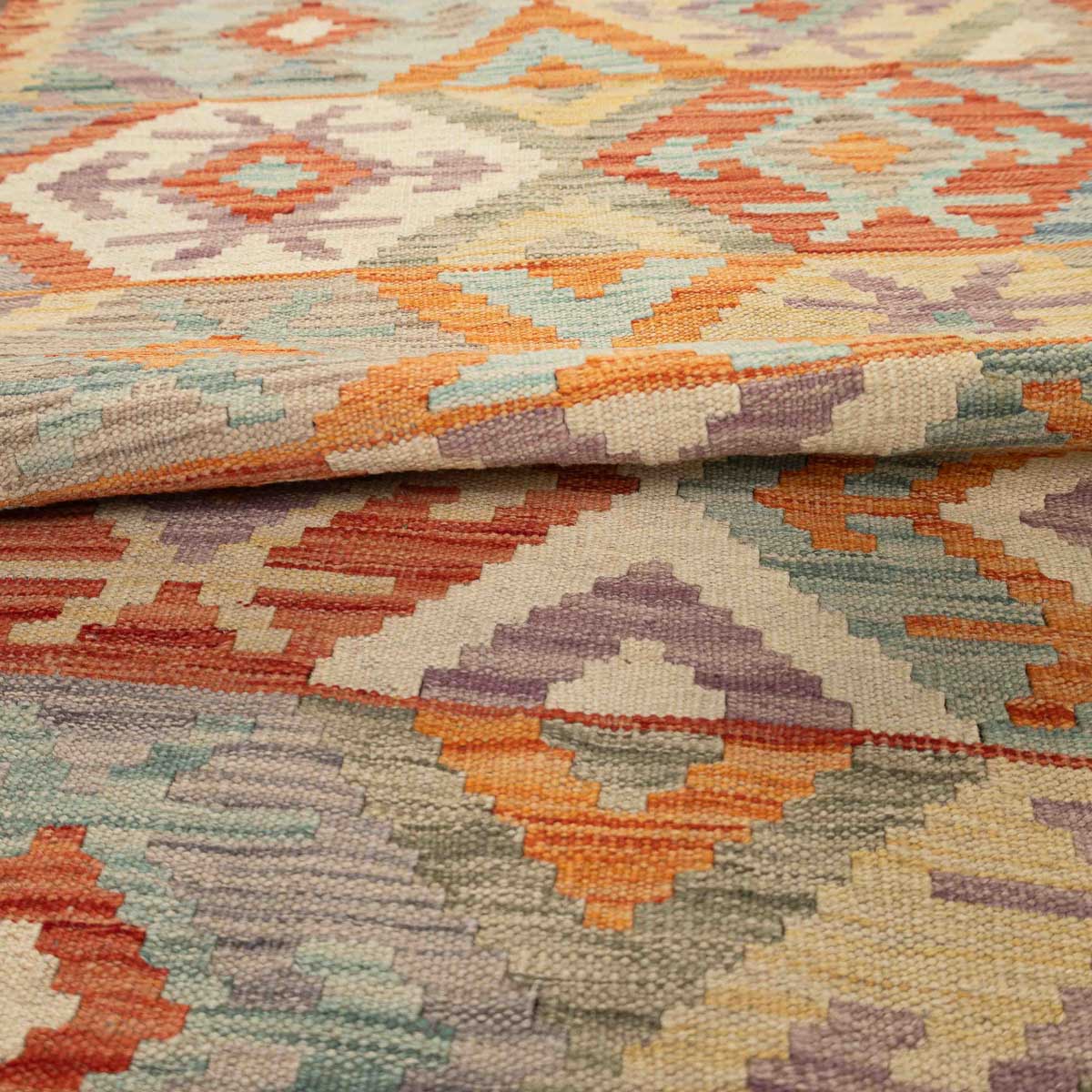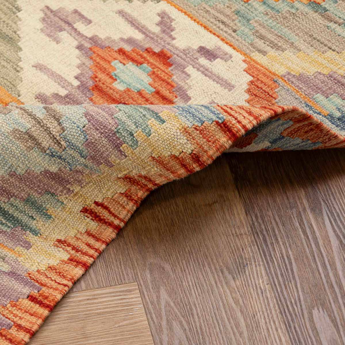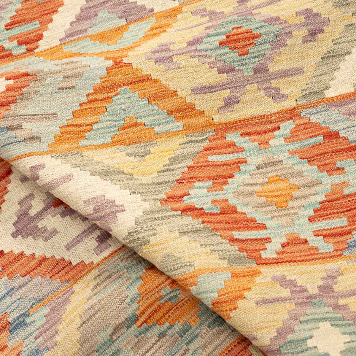 השטיח שזור בדוגמה גיאומטרית אפגנית מסורתית, עם שילוב צבעים עשיר בגווני כתום, תכלת, צהוב, בז', סגול וירקרק. הדפוסים המשושים והיהלומיים יוצרים תנועה שמחמיאה במיוחד למסדרונות ומעברים.