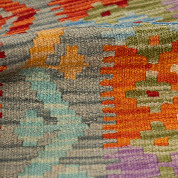 שטיח קילים אותנטי, בעבודת יד מסורתית, עם דוגמה גיאומטרית צפופה ומלאת צבעוניות חיה – בגווני אדום, כתום, תכלת, ירוק וסגול. השטיח נרקם בסגנון קילים קלאסי, עם טקסטורה שטוחה ודקה, המעניקה מראה אתני מלא חיים.