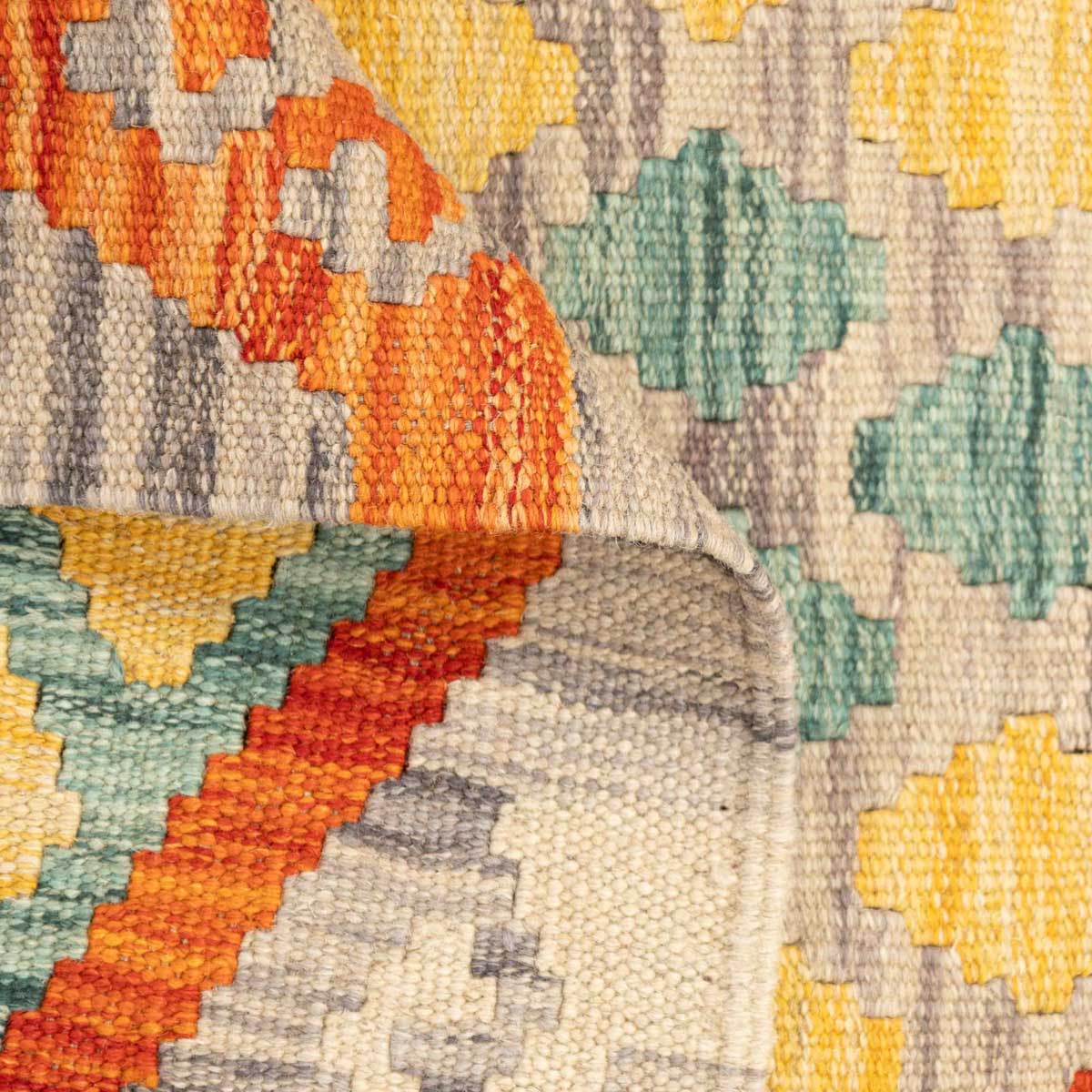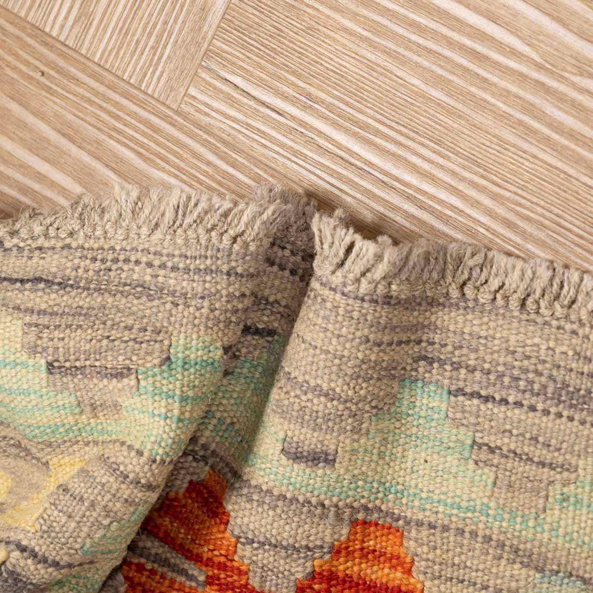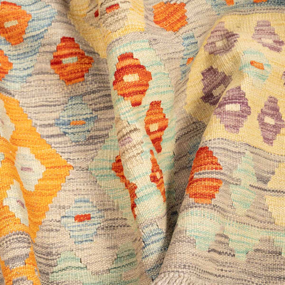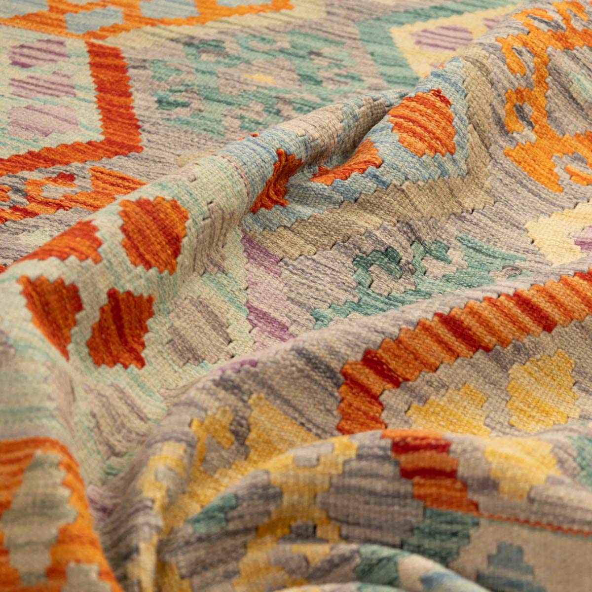שטיח בעבודת יד מסורתית בסגנון קילים אפגני, בעל צבעוניות חמה ועשירה המשלבת אדום, כתום, צהוב, כחול וירוק. הדוגמאות הגיאומטריות האופייניות לקילים מעניקות לשטיח מראה אותנטי, דינמי ומלא חיים – יצירה שמביאה עמה נגיעה של תרבות עתיקה ישירות לחלל הבית.