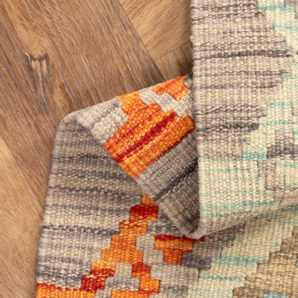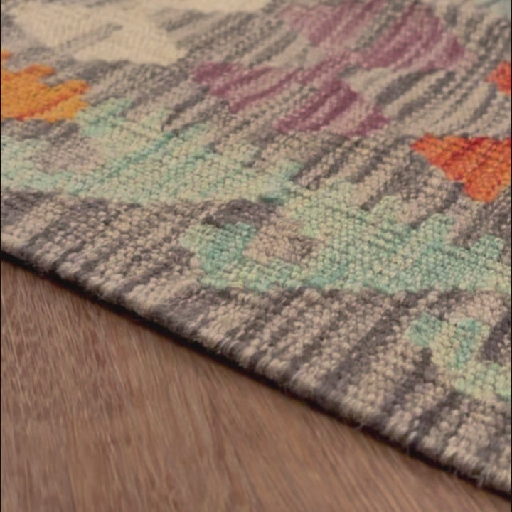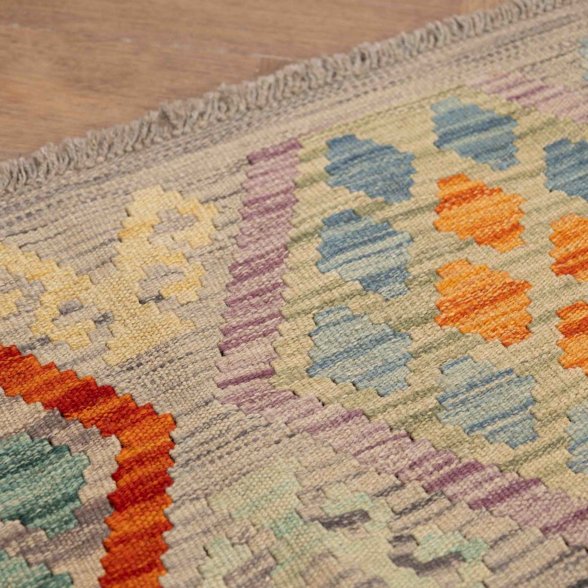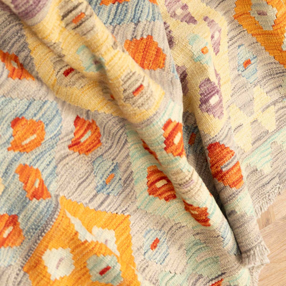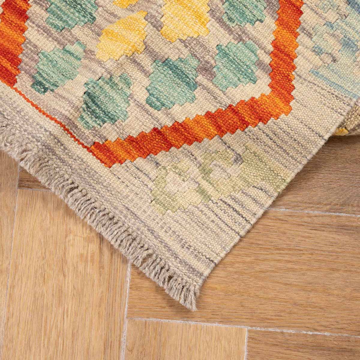 שטיח בעבודת יד מסורתית בסגנון קילים אפגני, בעל צבעוניות חמה ועשירה המשלבת אדום, כתום, צהוב, כחול וירוק. הדוגמאות הגיאומטריות האופייניות לקילים מעניקות לשטיח מראה אותנטי, דינמי ומלא חיים – יצירה שמביאה עמה נגיעה של תרבות עתיקה ישירות לחלל הבית.