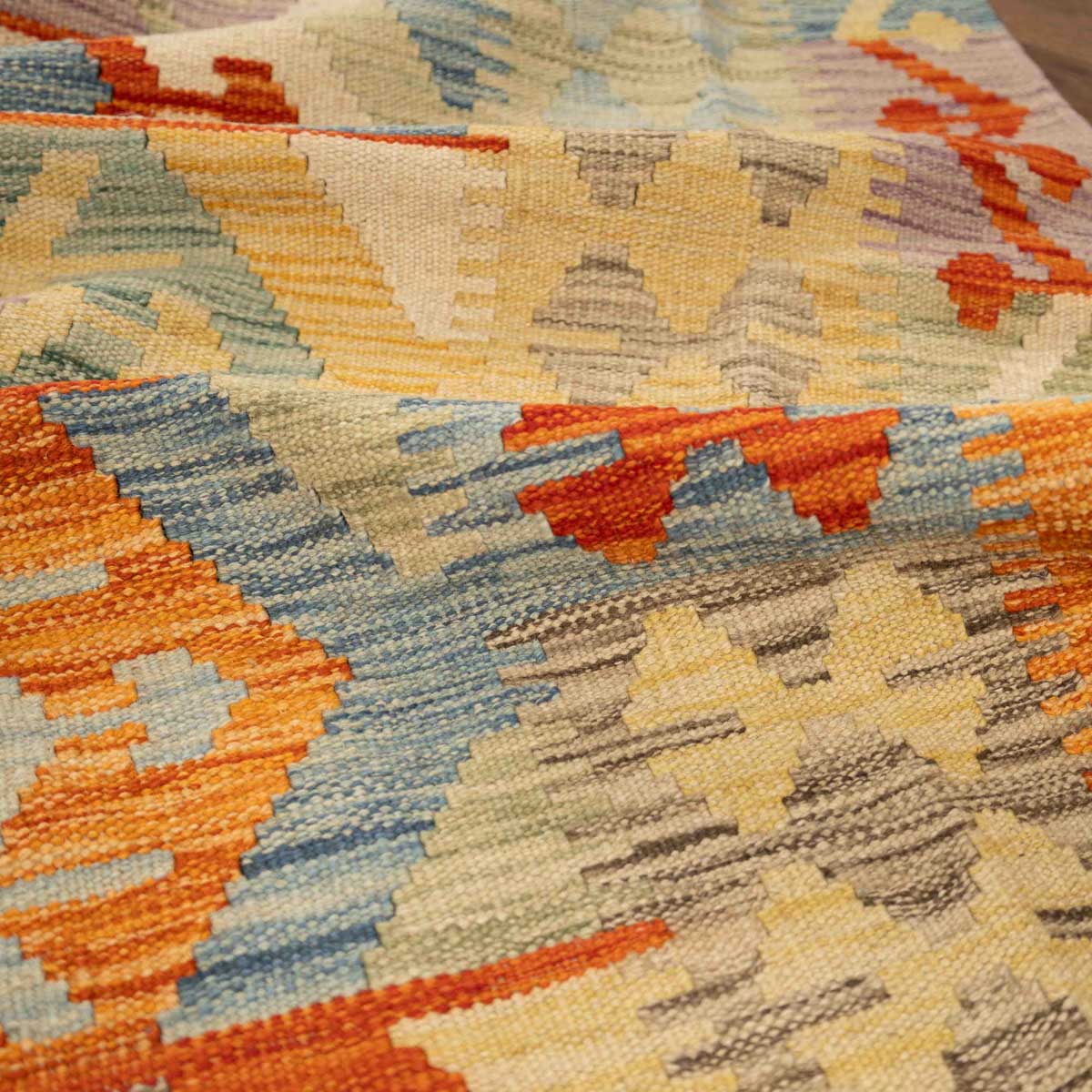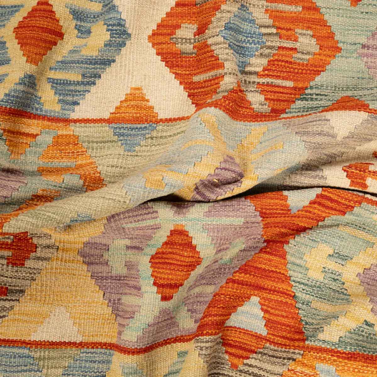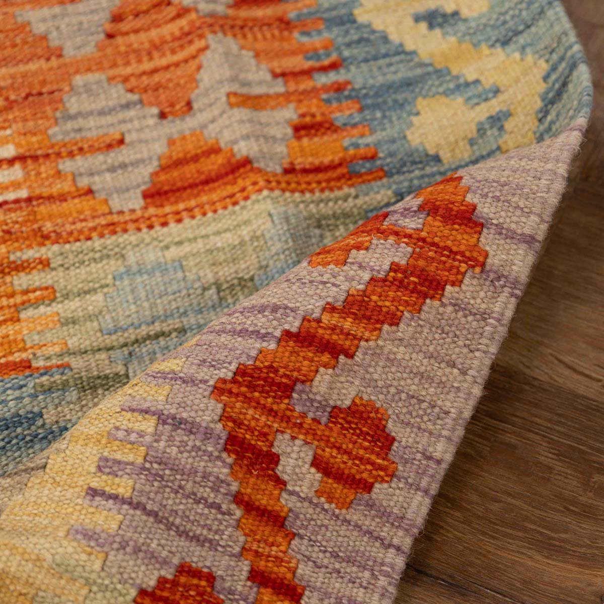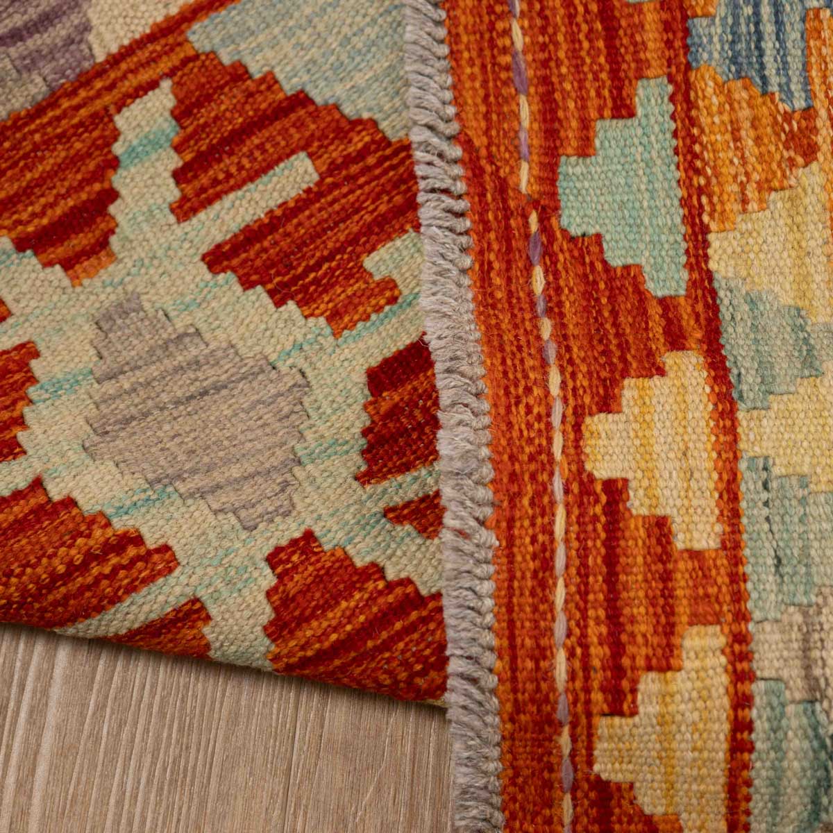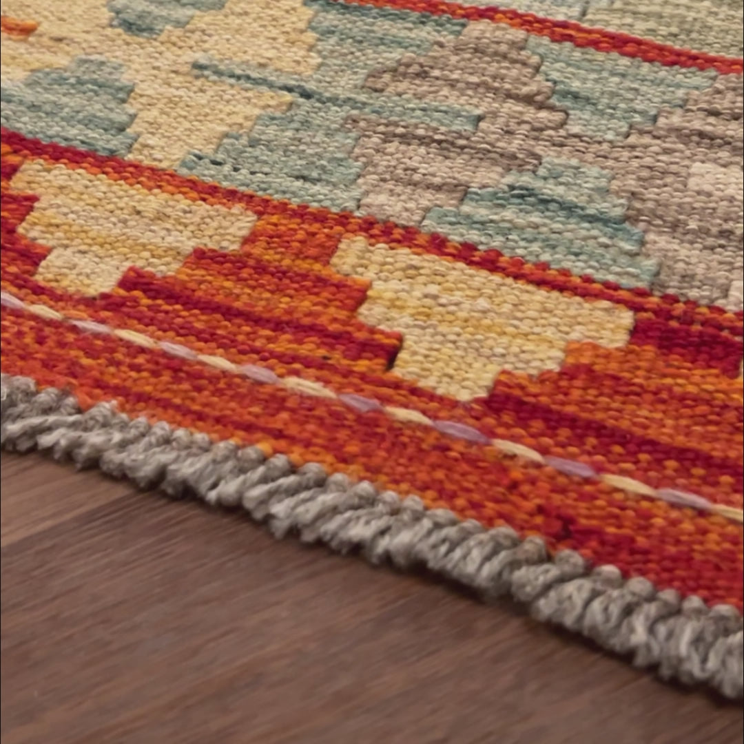 שטיח בעבודת יד מסורתית בסגנון קילים אפגני, בעל צבעוניות חמה ועשירה המשלבת אדום, כתום, צהוב, כחול וירוק. הדוגמאות הגיאומטריות האופייניות לקילים מעניקות לשטיח מראה אותנטי, דינמי ומלא חיים – יצירה שמביאה עמה נגיעה של תרבות עתיקה ישירות לחלל הבית.
