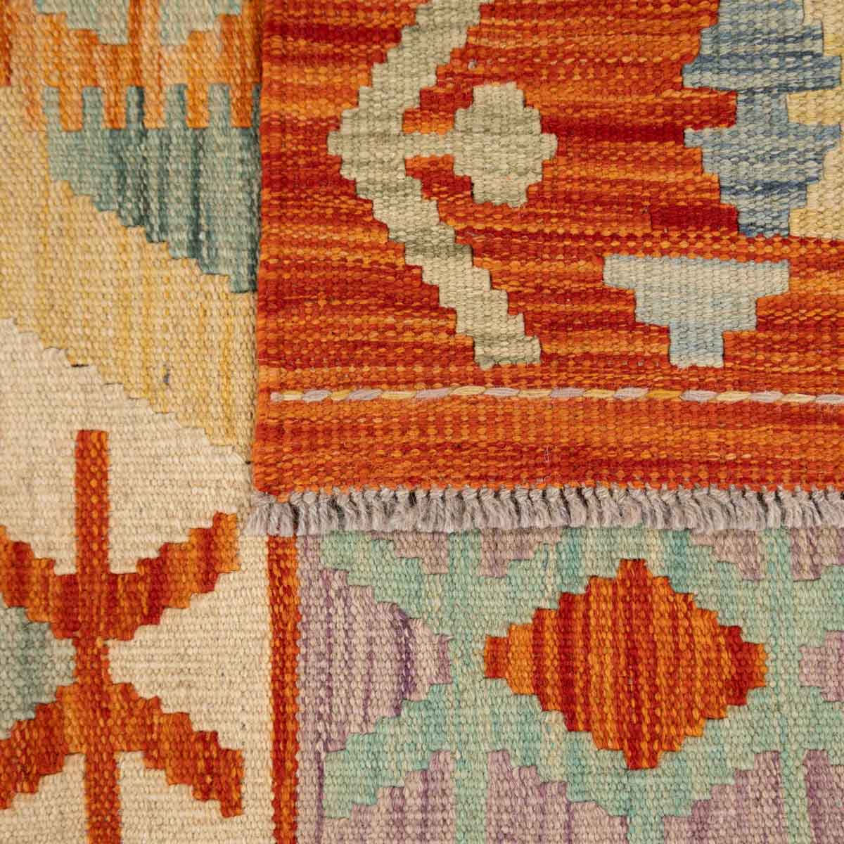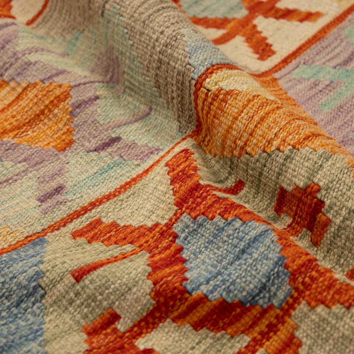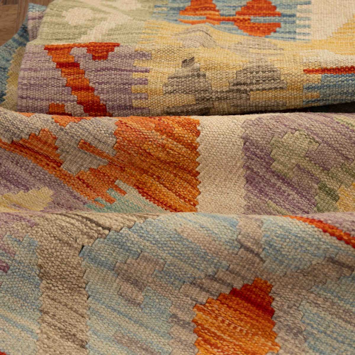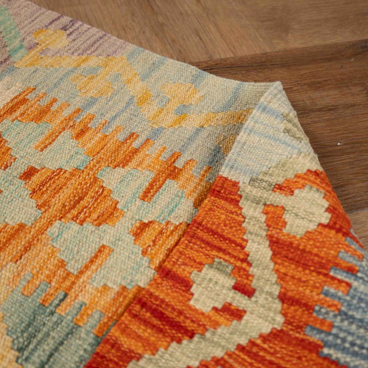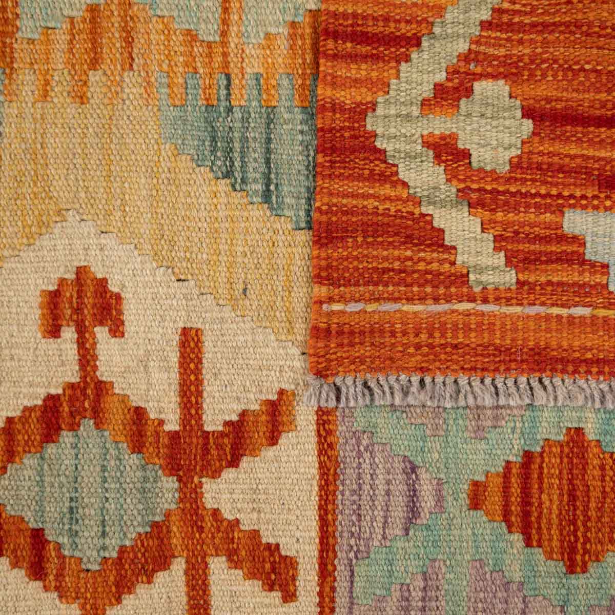 שטיח בעבודת יד מסורתית בסגנון קילים אפגני, בעל צבעוניות חמה ועשירה המשלבת אדום, כתום, צהוב, כחול וירוק. הדוגמאות הגיאומטריות האופייניות לקילים מעניקות לשטיח מראה אותנטי, דינמי ומלא חיים – יצירה שמביאה עמה נגיעה של תרבות עתיקה ישירות לחלל הבית.