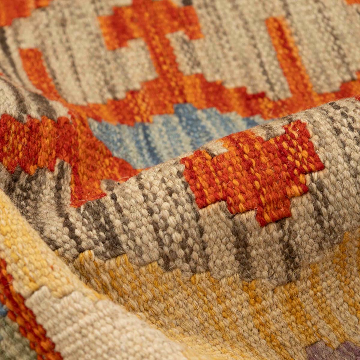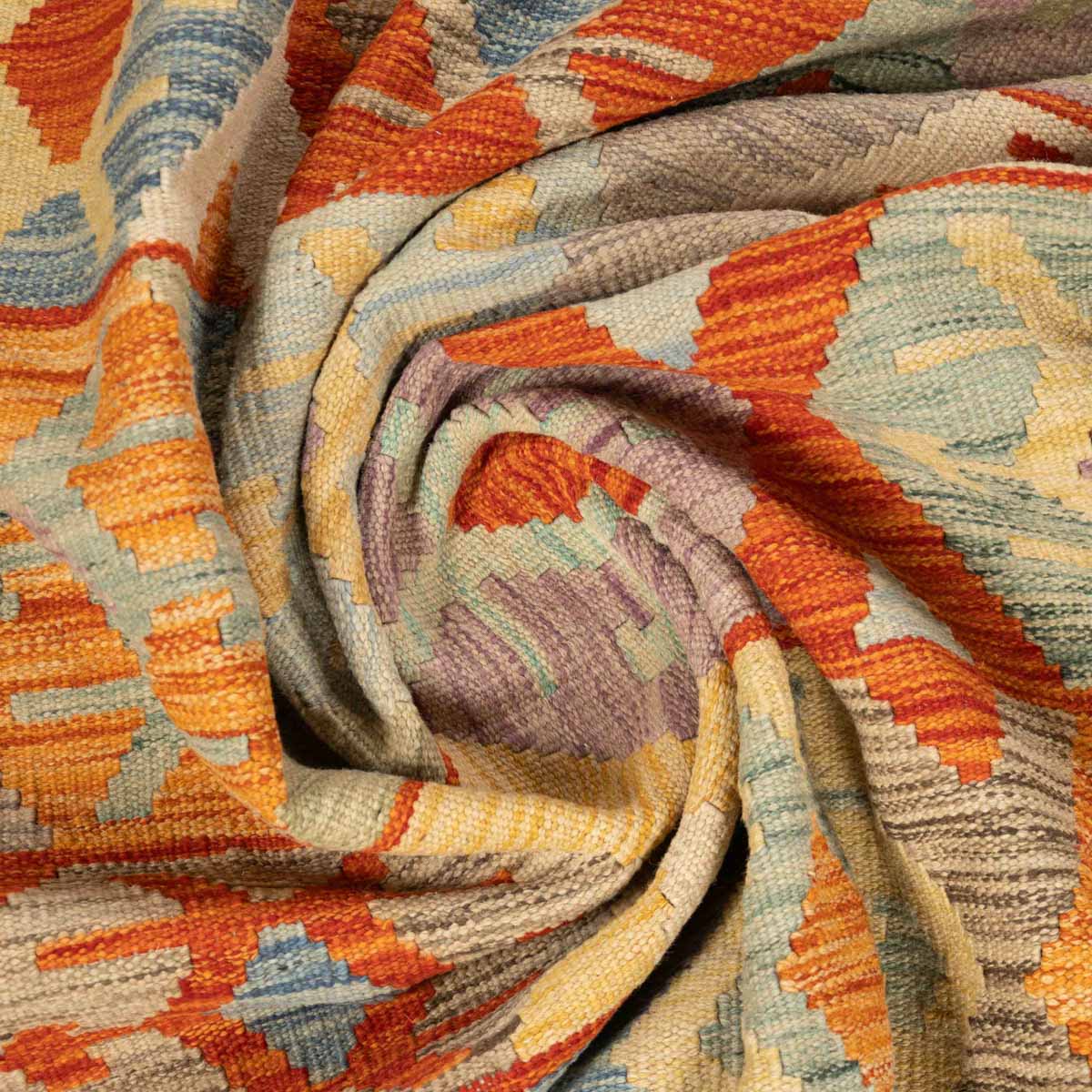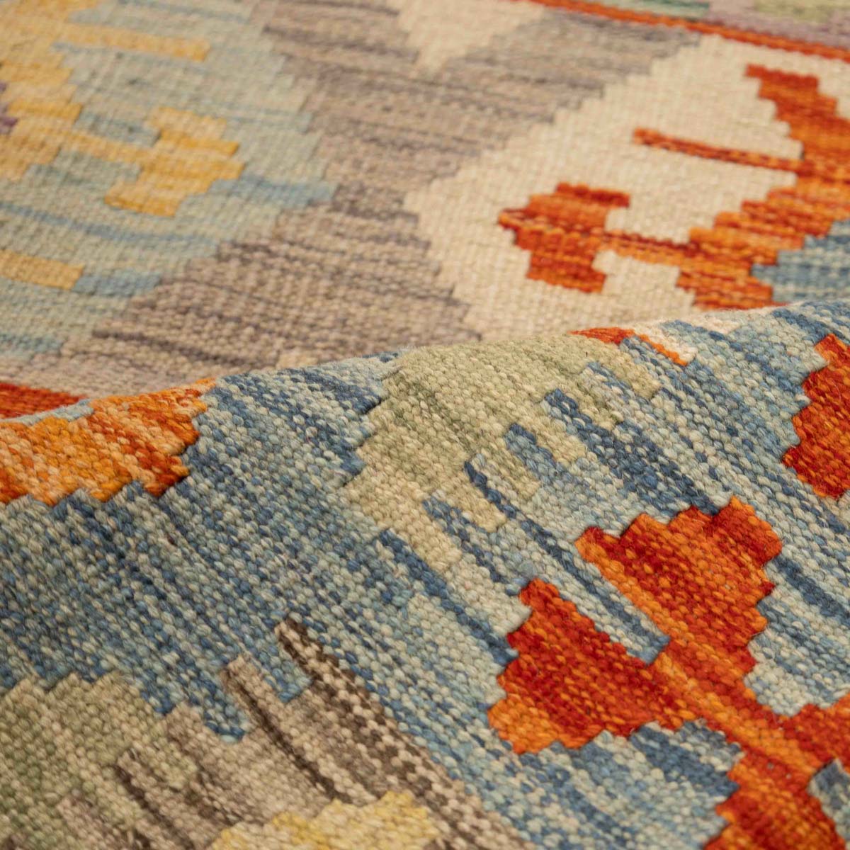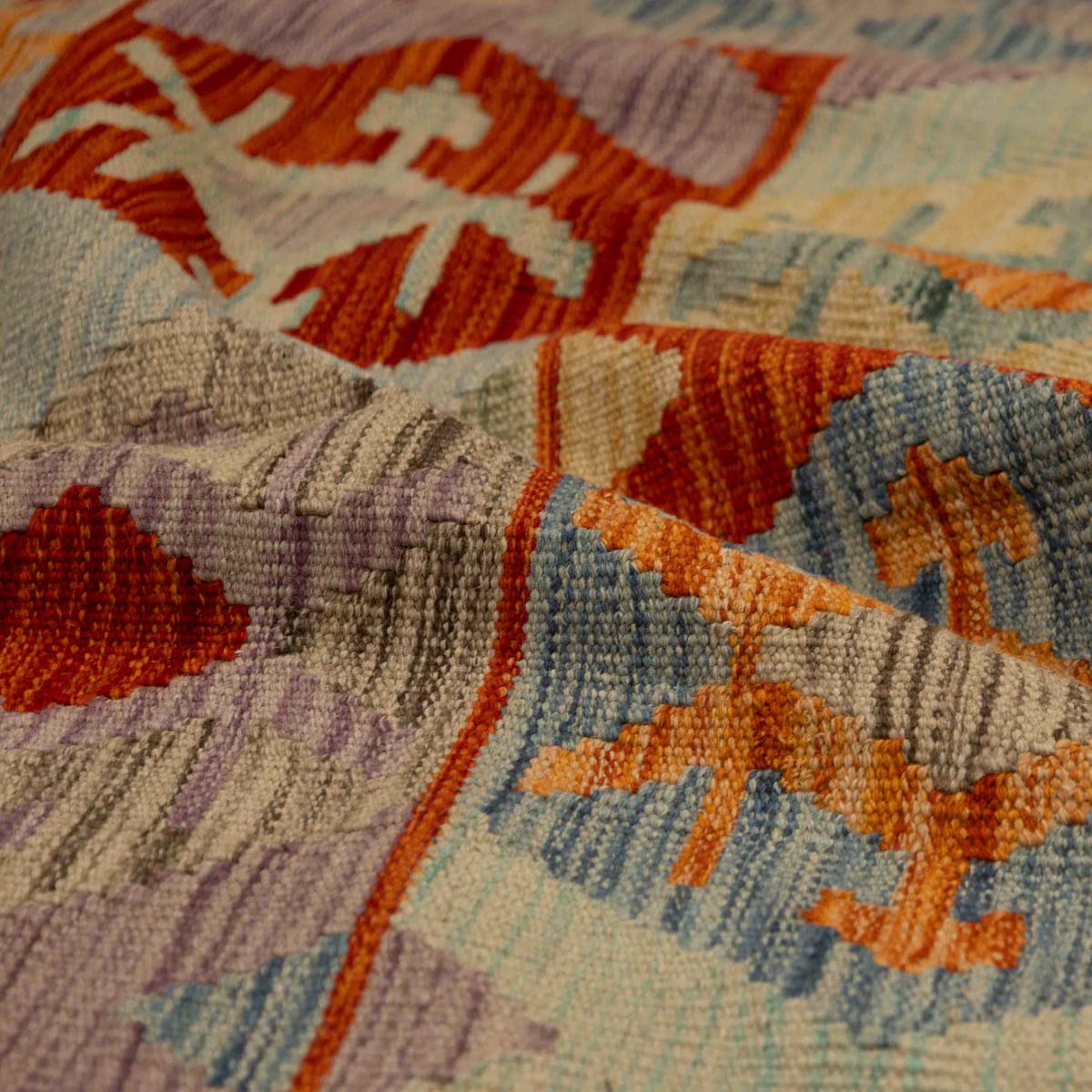 שטיח בעבודת יד מסורתית בסגנון קילים אפגני, בעל צבעוניות חמה ועשירה המשלבת אדום, כתום, צהוב, כחול וירוק. הדוגמאות הגיאומטריות האופייניות לקילים מעניקות לשטיח מראה אותנטי, דינמי ומלא חיים – יצירה שמביאה עמה נגיעה של תרבות עתיקה ישירות לחלל הבית.