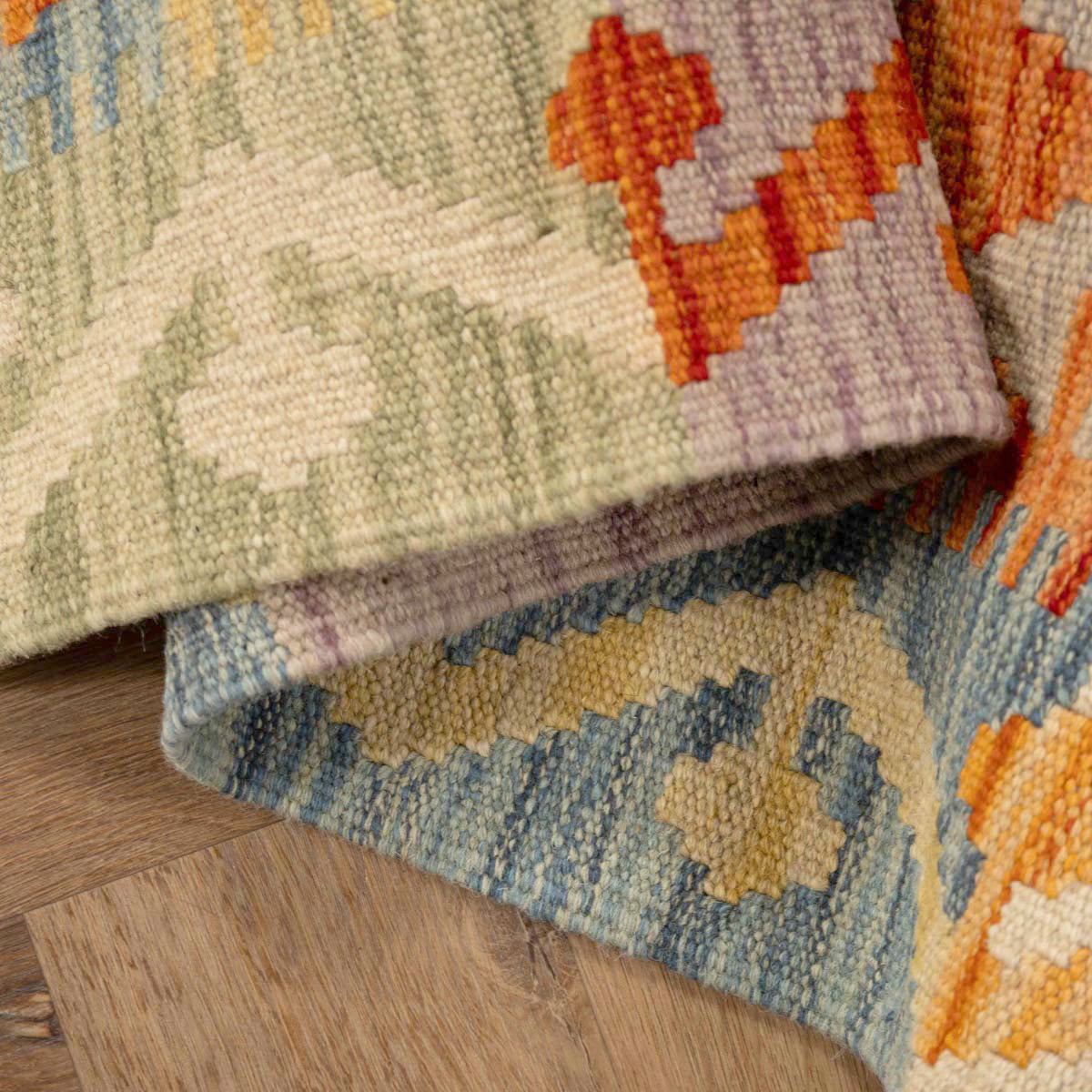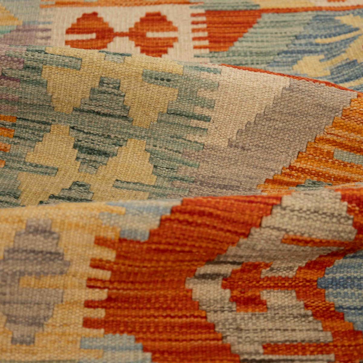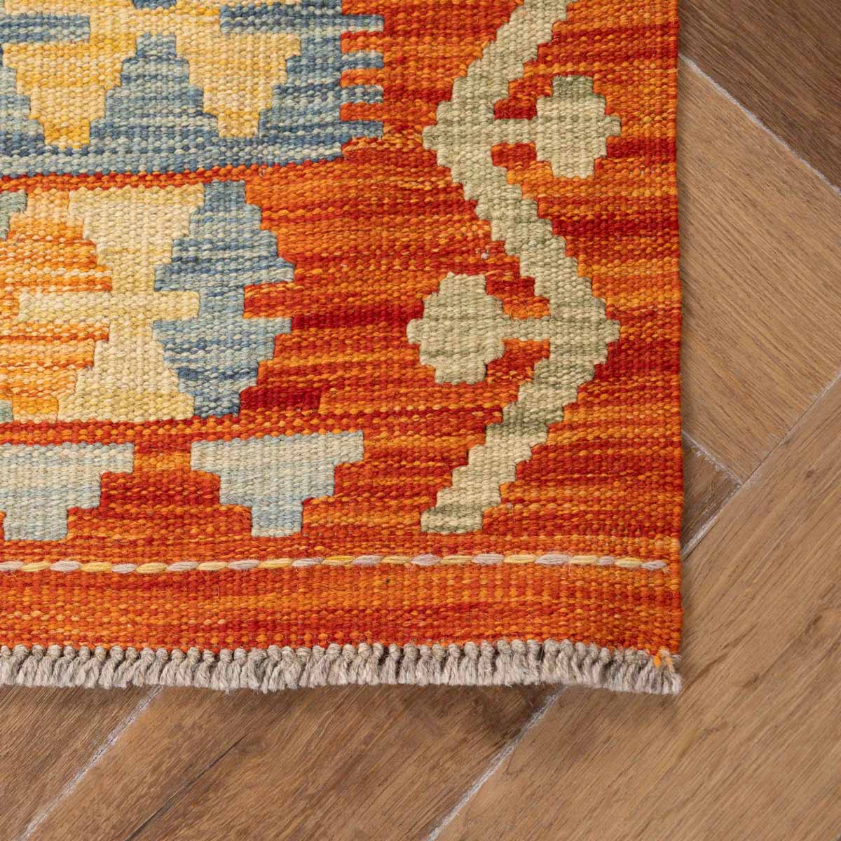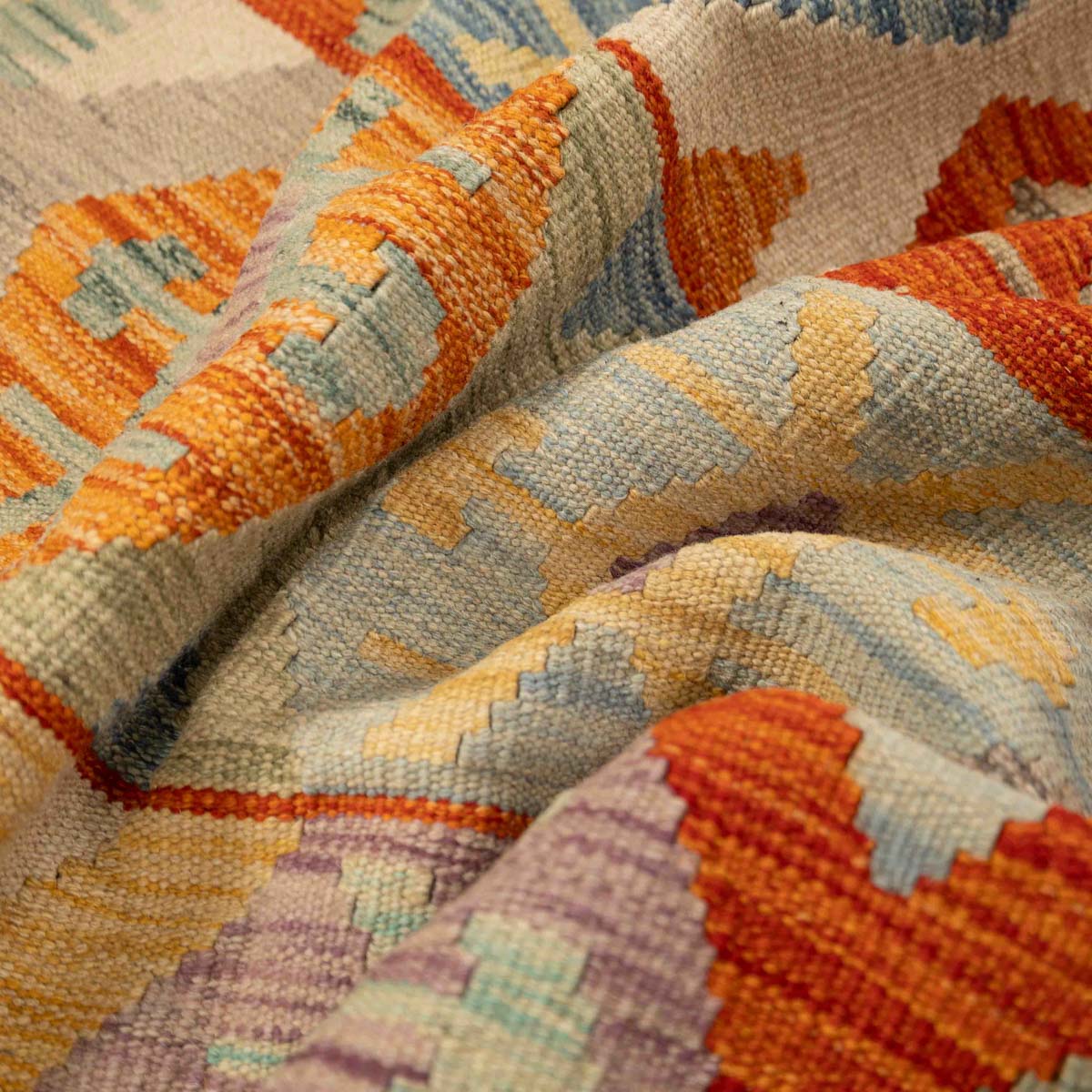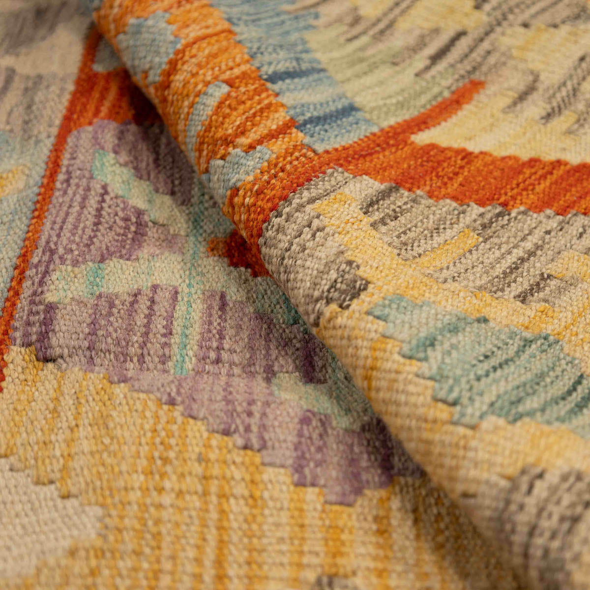 שטיח בעבודת יד מסורתית בסגנון קילים אפגני, בעל צבעוניות חמה ועשירה המשלבת אדום, כתום, צהוב, כחול וירוק. הדוגמאות הגיאומטריות האופייניות לקילים מעניקות לשטיח מראה אותנטי, דינמי ומלא חיים – יצירה שמביאה עמה נגיעה של תרבות עתיקה ישירות לחלל הבית.