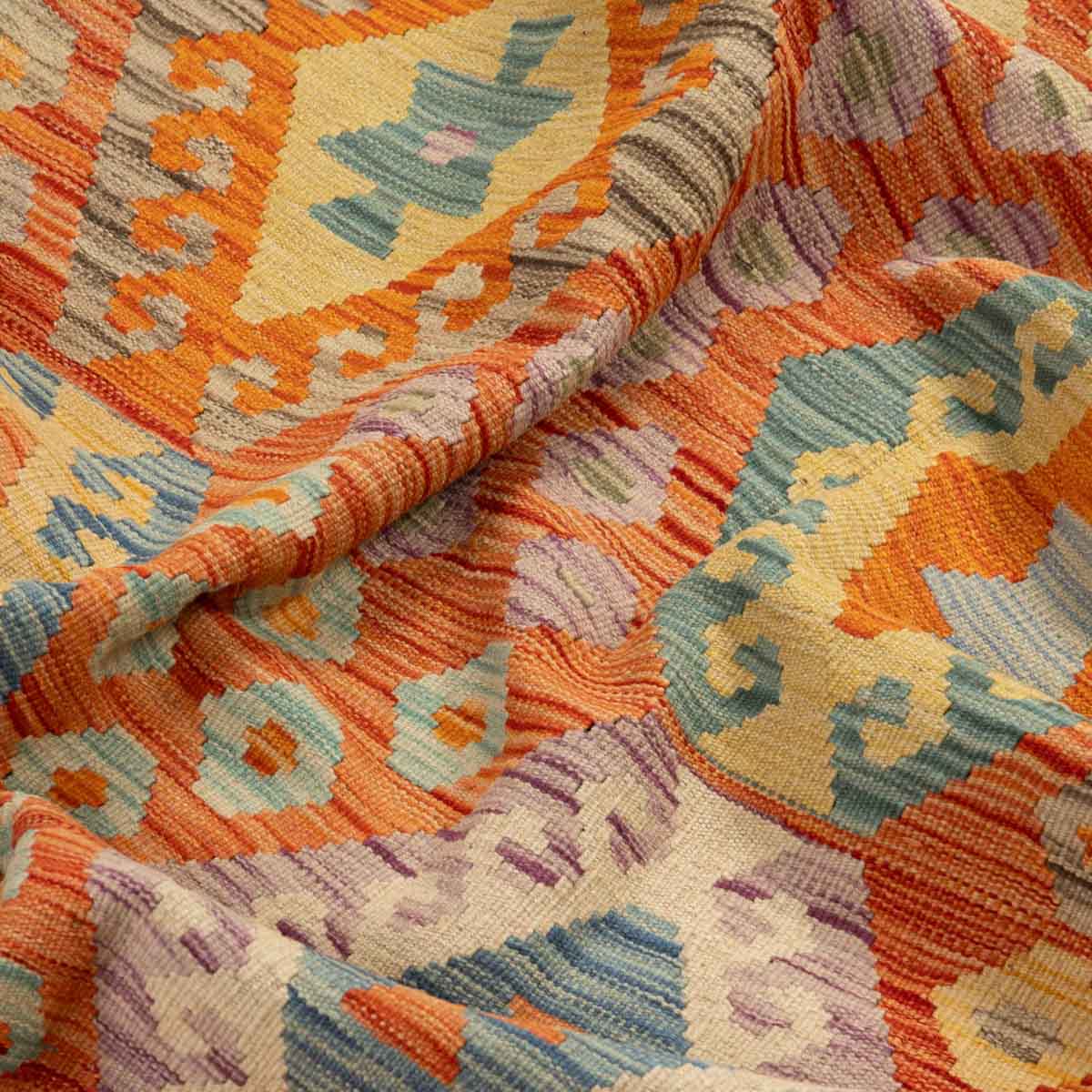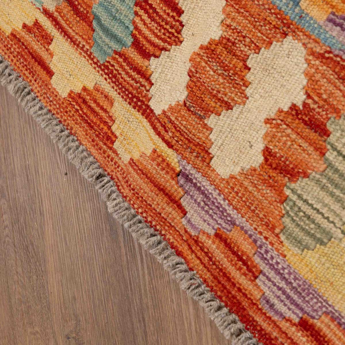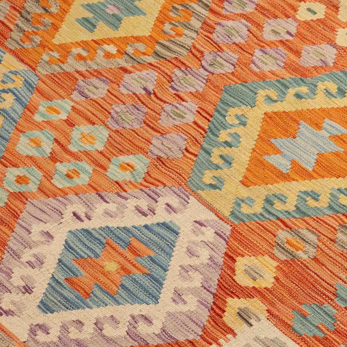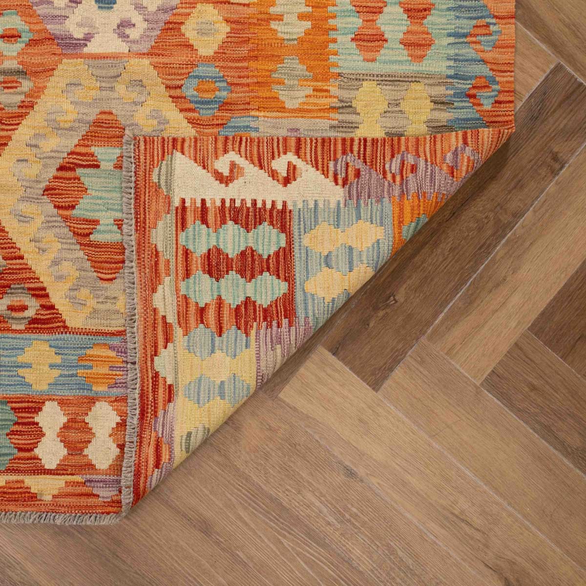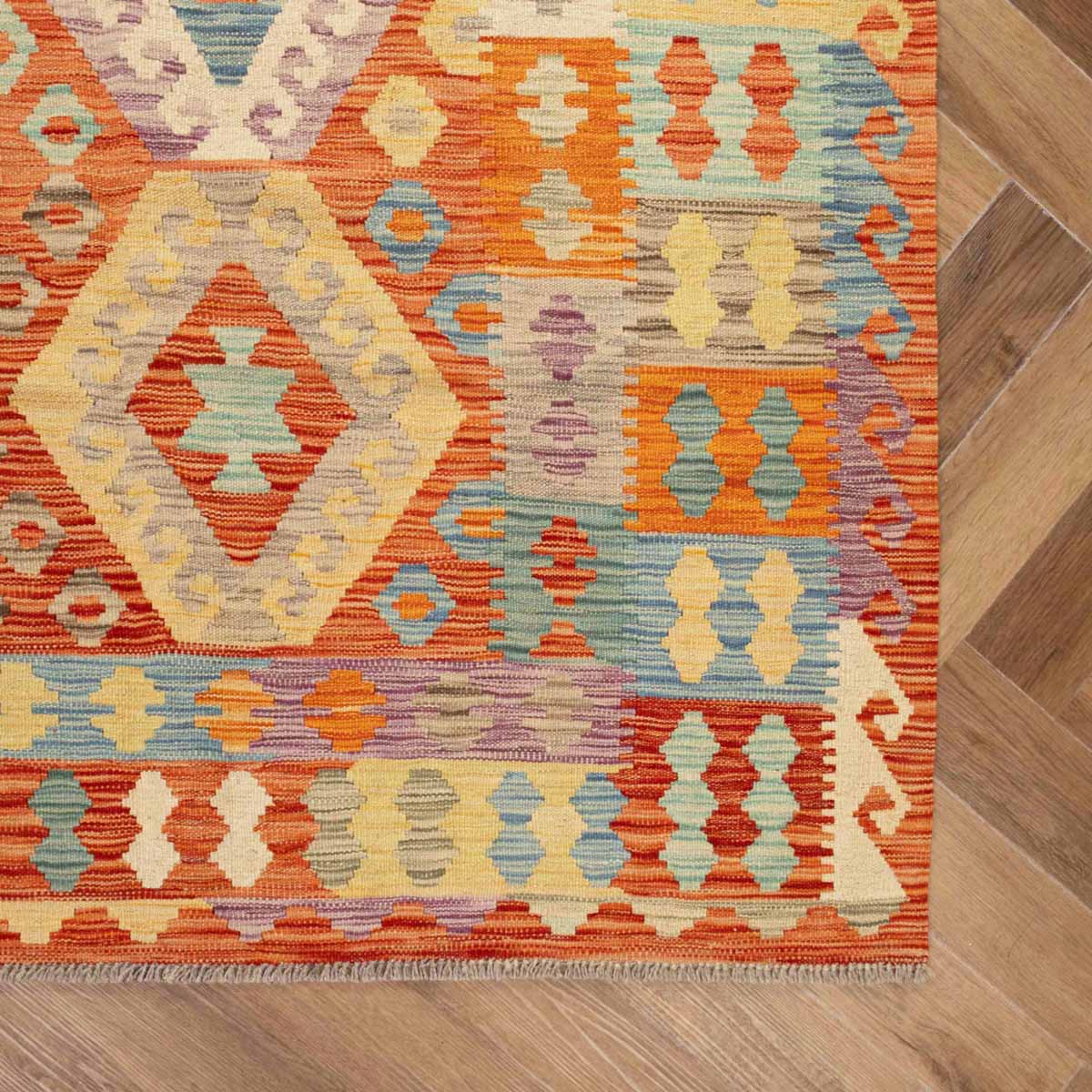 שטיח בעבודת יד מסורתית בסגנון קילים אפגני, בעל צבעוניות חמה ועשירה המשלבת אדום, כתום, צהוב, כחול וירוק. הדוגמאות הגיאומטריות האופייניות לקילים מעניקות לשטיח מראה אותנטי, דינמי ומלא חיים – יצירה שמביאה עמה נגיעה של תרבות עתיקה ישירות לחלל הבית.