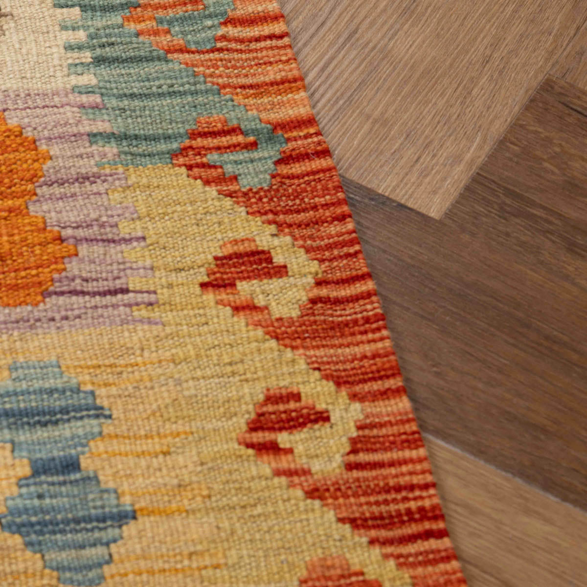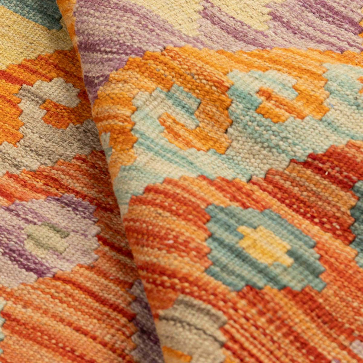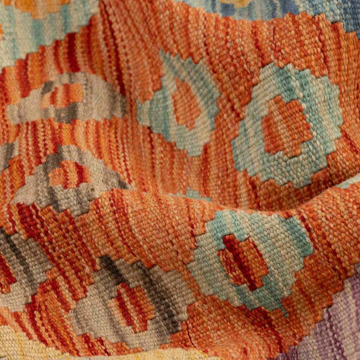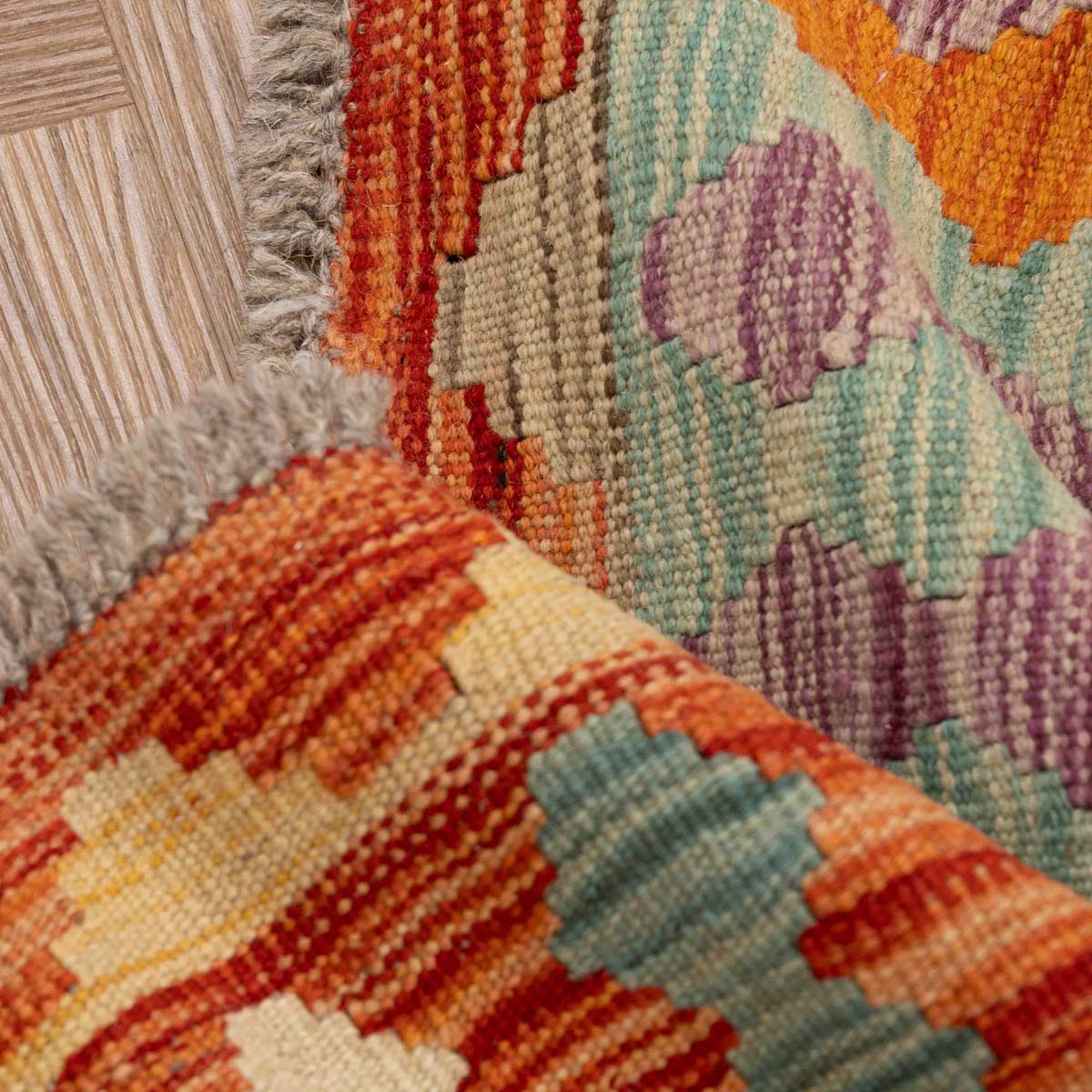 שטיח בעבודת יד מסורתית בסגנון קילים אפגני, בעל צבעוניות חמה ועשירה המשלבת אדום, כתום, צהוב, כחול וירוק. הדוגמאות הגיאומטריות האופייניות לקילים מעניקות לשטיח מראה אותנטי, דינמי ומלא חיים – יצירה שמביאה עמה נגיעה של תרבות עתיקה ישירות לחלל הבית.