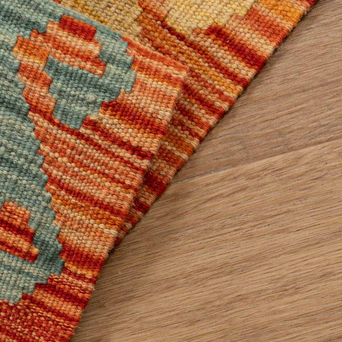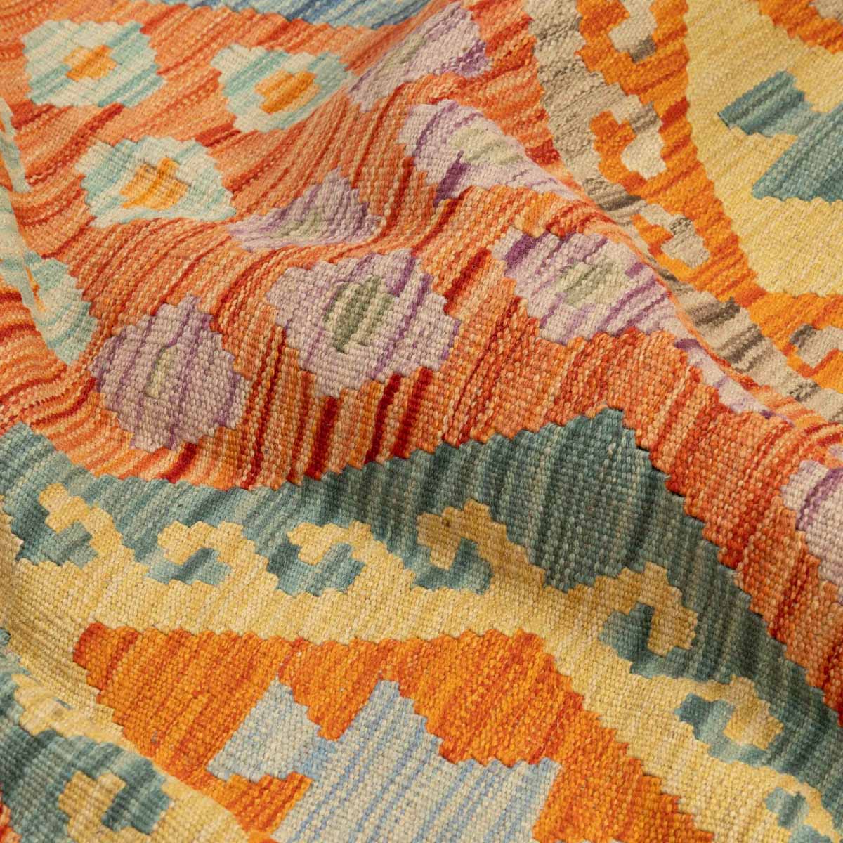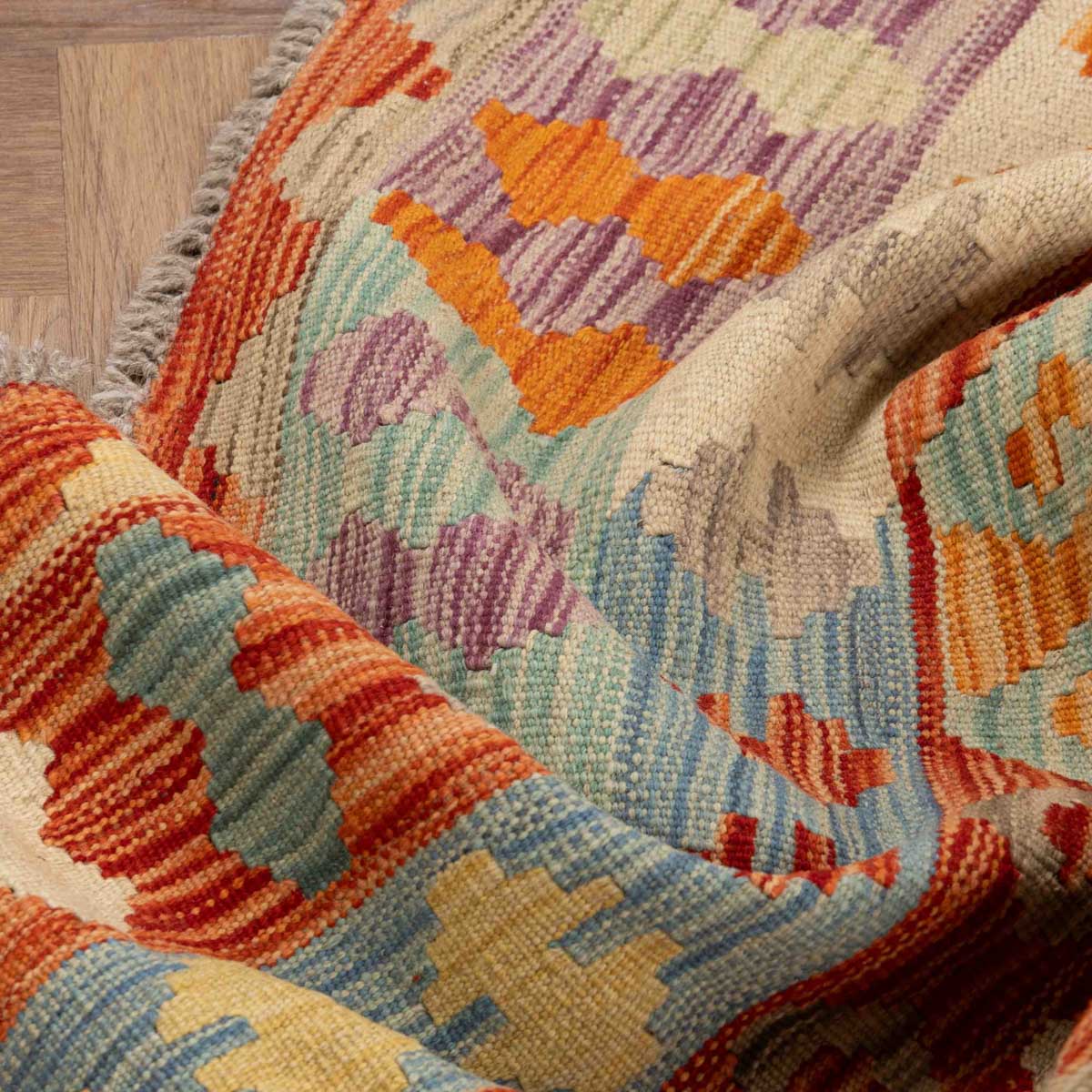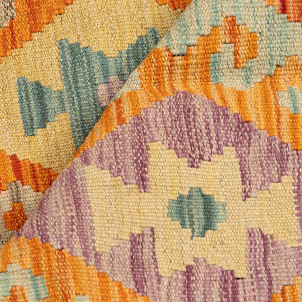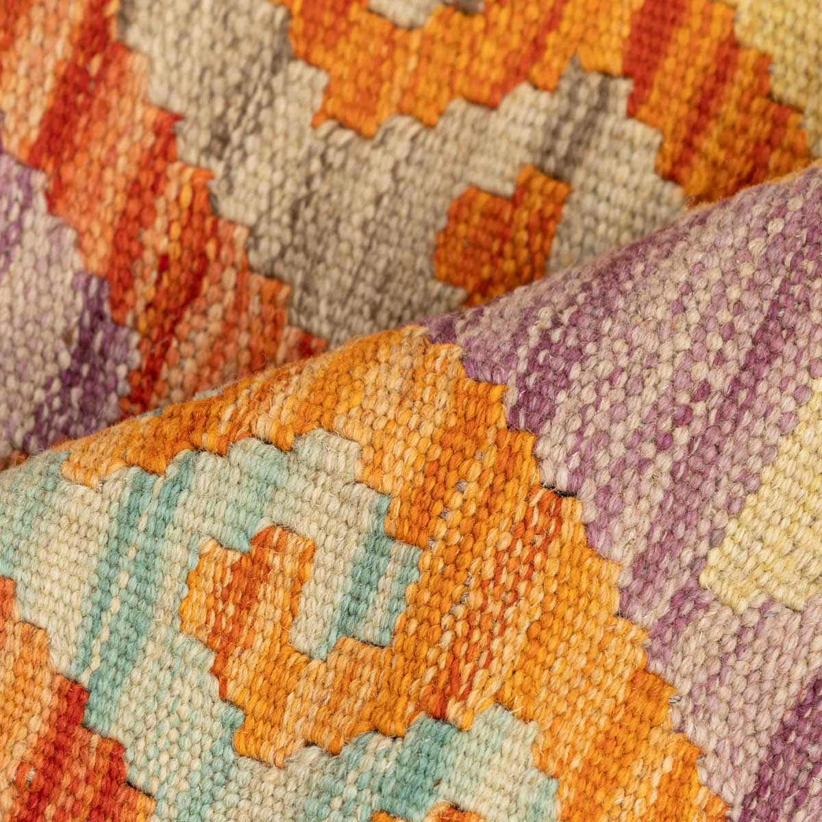 שטיח בעבודת יד מסורתית בסגנון קילים אפגני, בעל צבעוניות חמה ועשירה המשלבת אדום, כתום, צהוב, כחול וירוק. הדוגמאות הגיאומטריות האופייניות לקילים מעניקות לשטיח מראה אותנטי, דינמי ומלא חיים – יצירה שמביאה עמה נגיעה של תרבות עתיקה ישירות לחלל הבית.