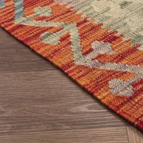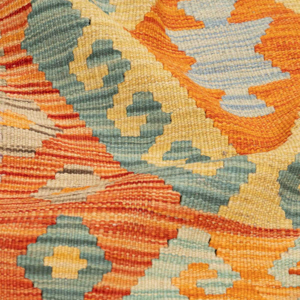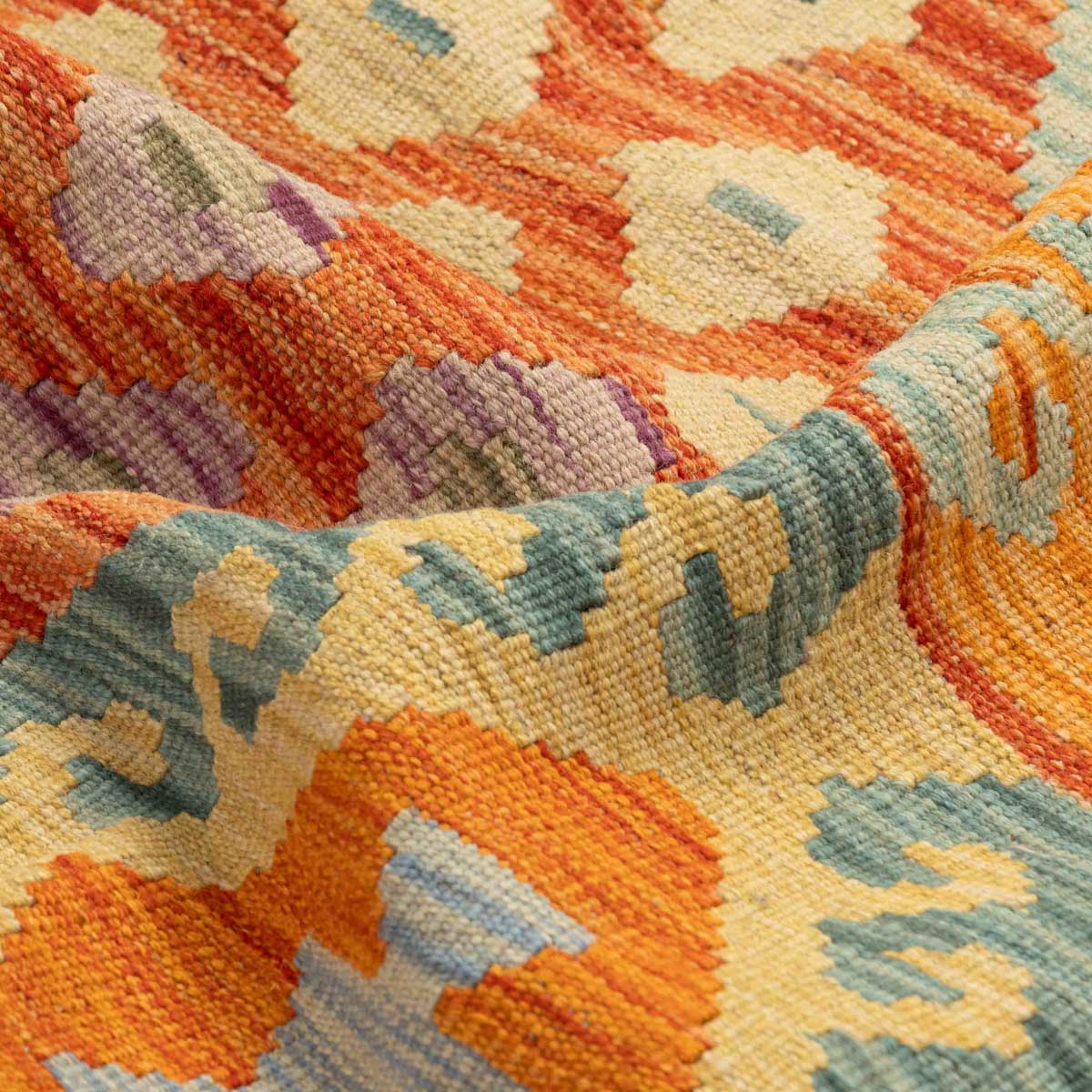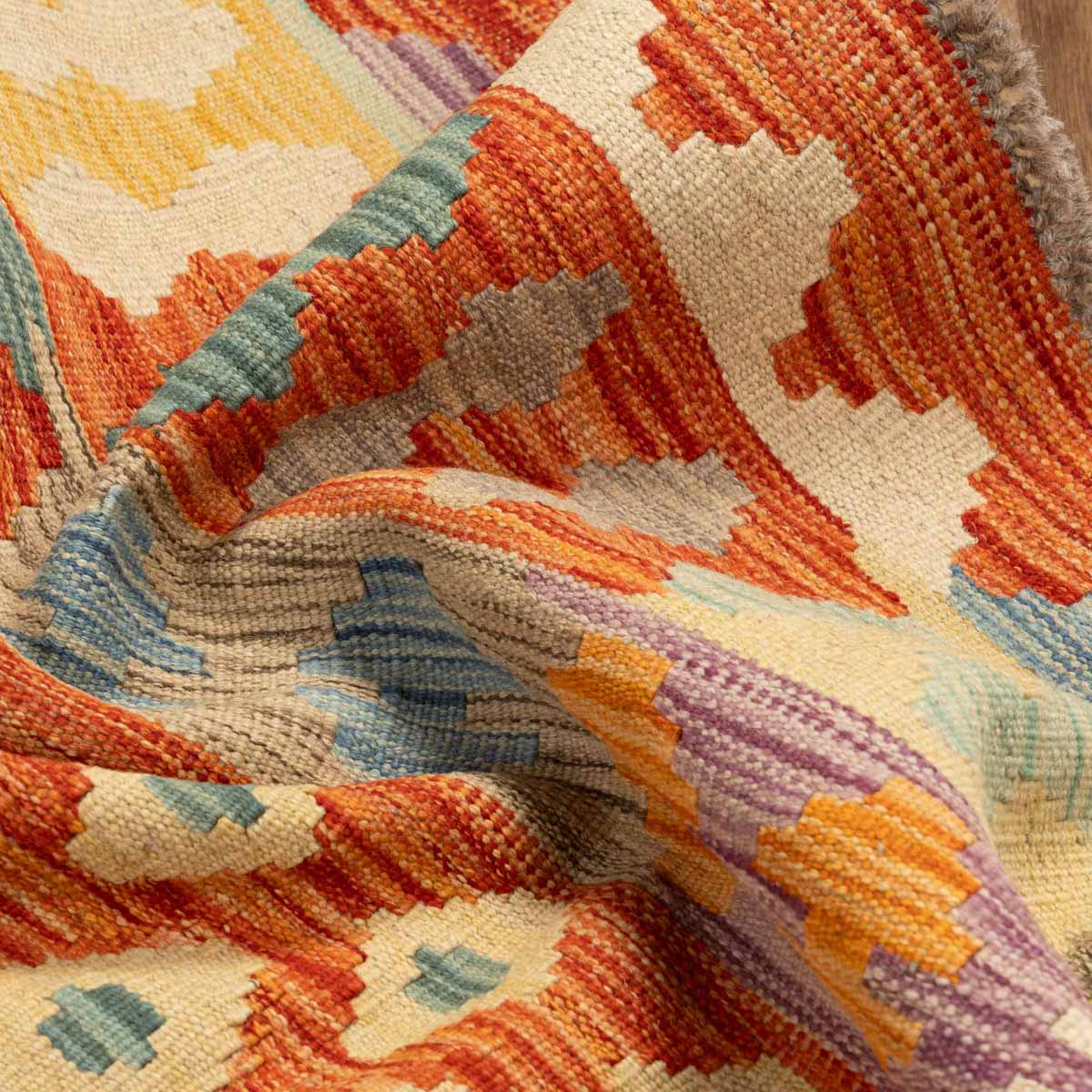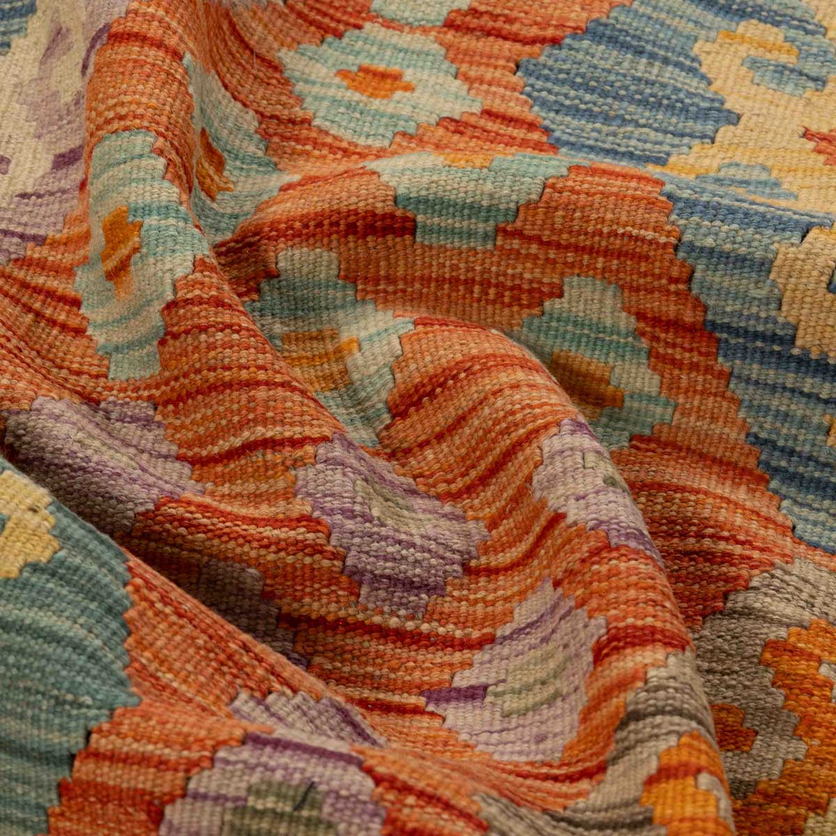 שטיח בעבודת יד מסורתית בסגנון קילים אפגני, בעל צבעוניות חמה ועשירה המשלבת אדום, כתום, צהוב, כחול וירוק. הדוגמאות הגיאומטריות האופייניות לקילים מעניקות לשטיח מראה אותנטי, דינמי ומלא חיים – יצירה שמביאה עמה נגיעה של תרבות עתיקה ישירות לחלל הבית.