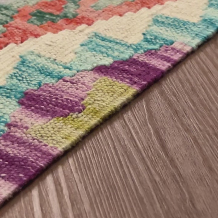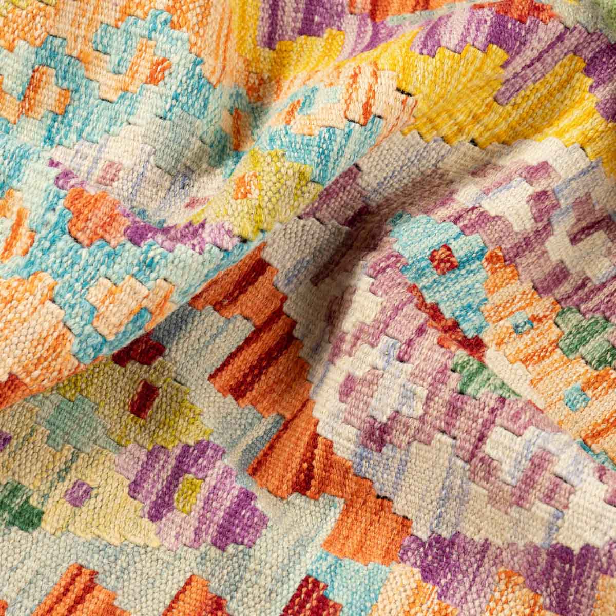 שטיח בעבודת יד מסורתית בסגנון קילים אפגני, בעל צבעוניות חמה ועשירה המשלבת אדום, כתום, צהוב, כחול וירוק. הדוגמאות הגיאומטריות האופייניות לקילים מעניקות לשטיח מראה אותנטי, דינמי ומלא חיים – יצירה שמביאה עמה נגיעה של תרבות עתיקה ישירות לחלל הבית.