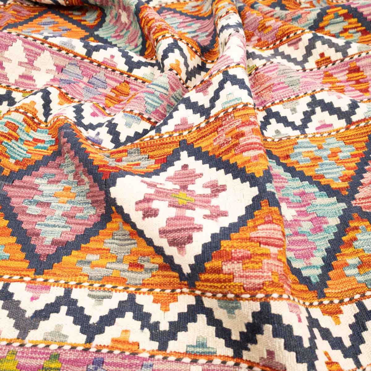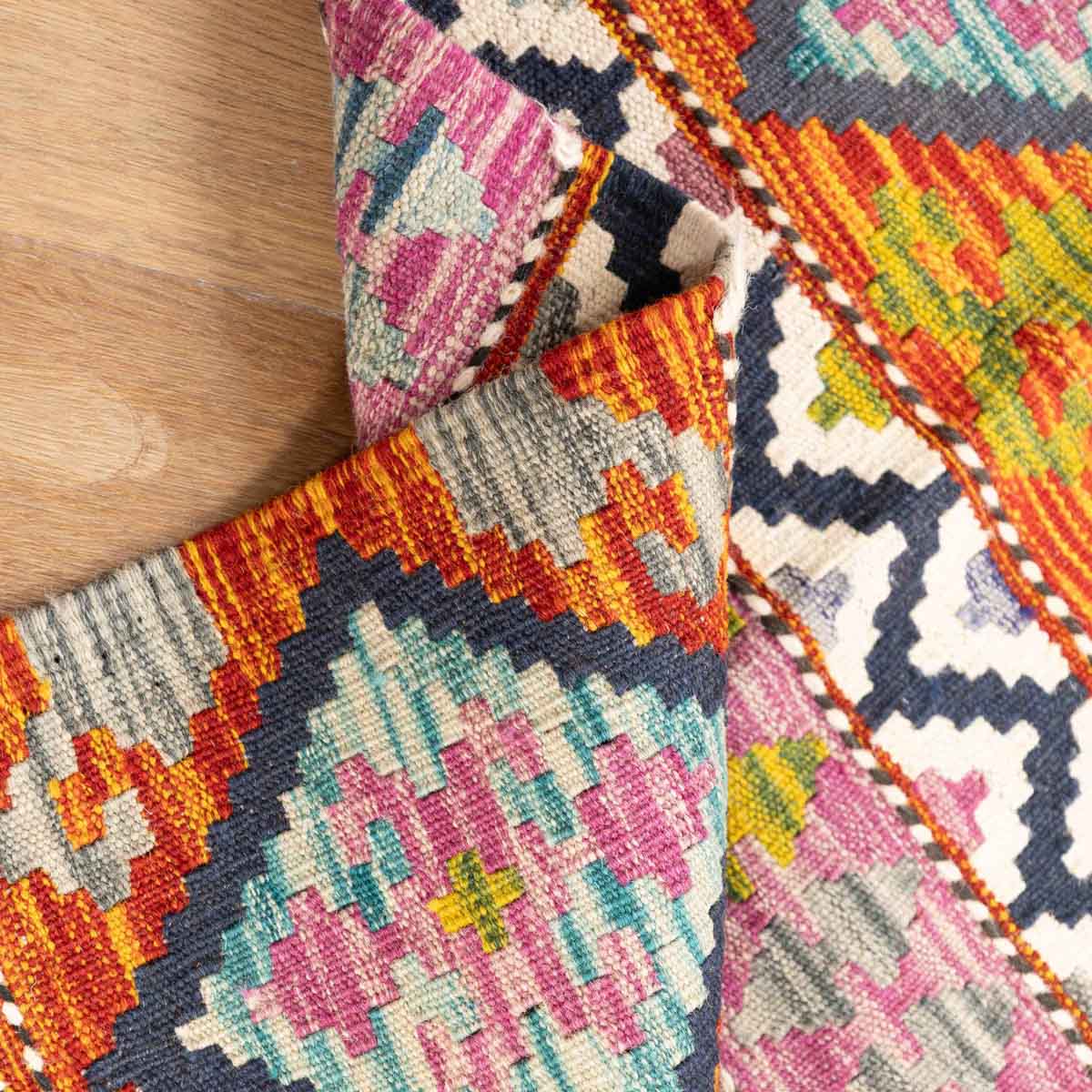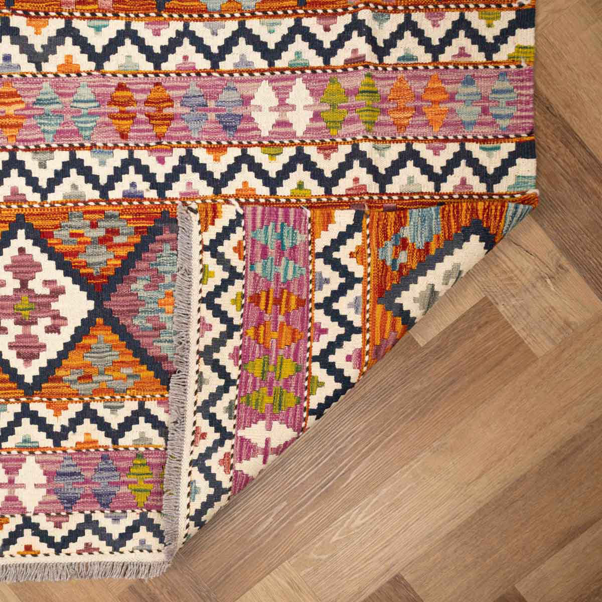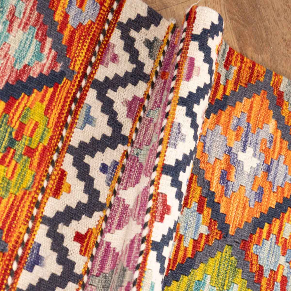 שטיח בעבודת יד מסורתית בסגנון קילים אפגני, בעל צבעוניות חמה ועשירה המשלבת אדום, כתום, צהוב, כחול וירוק. הדוגמאות הגיאומטריות האופייניות לקילים מעניקות לשטיח מראה אותנטי, דינמי ומלא חיים – יצירה שמביאה עמה נגיעה של תרבות עתיקה ישירות לחלל הבית.