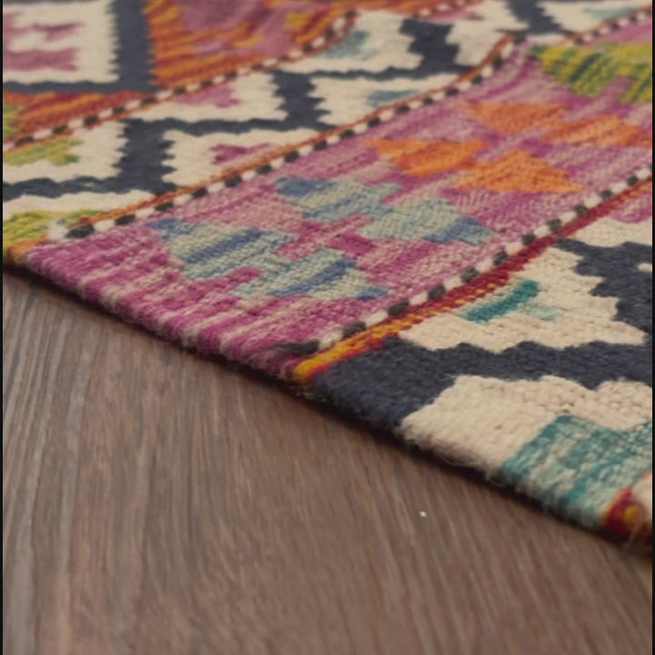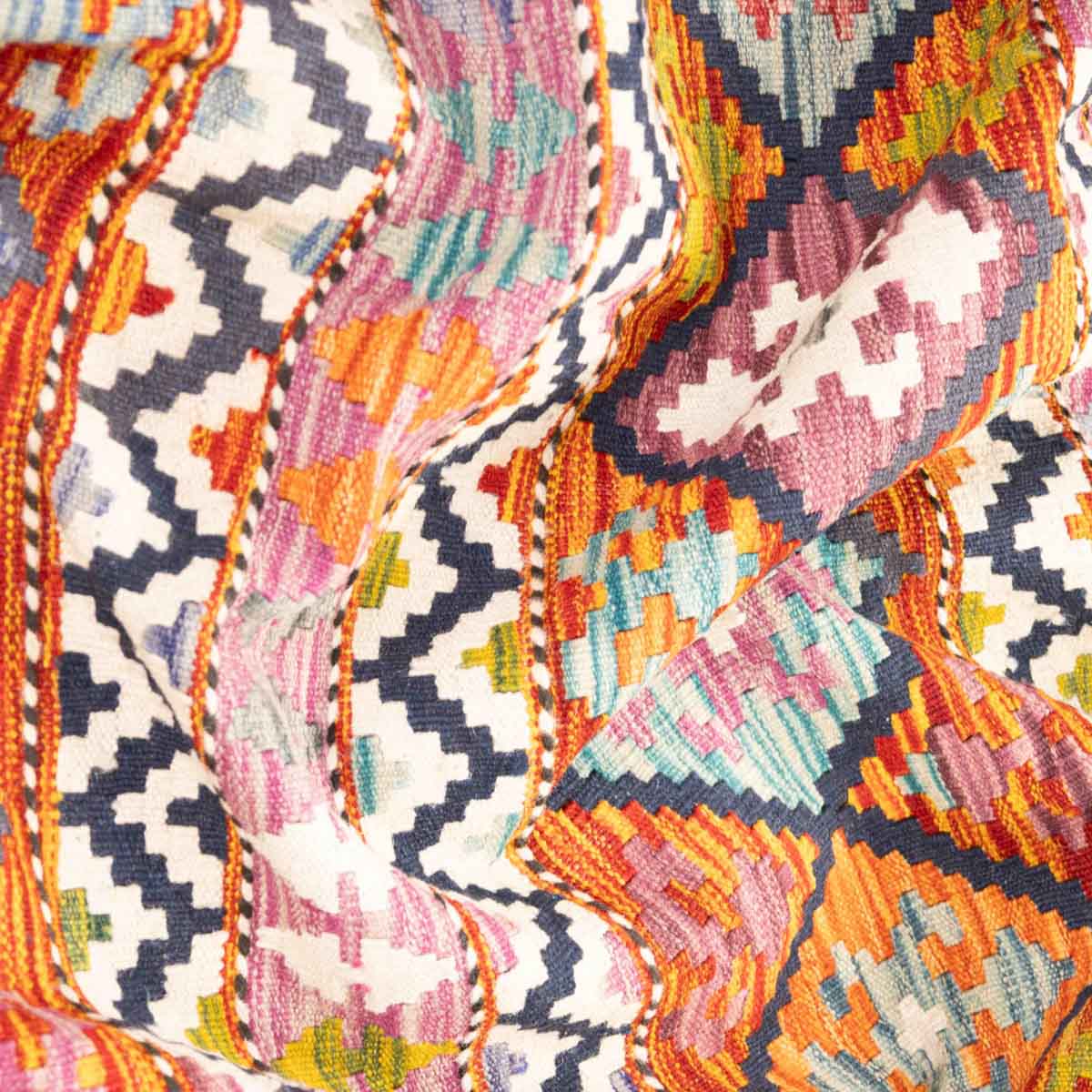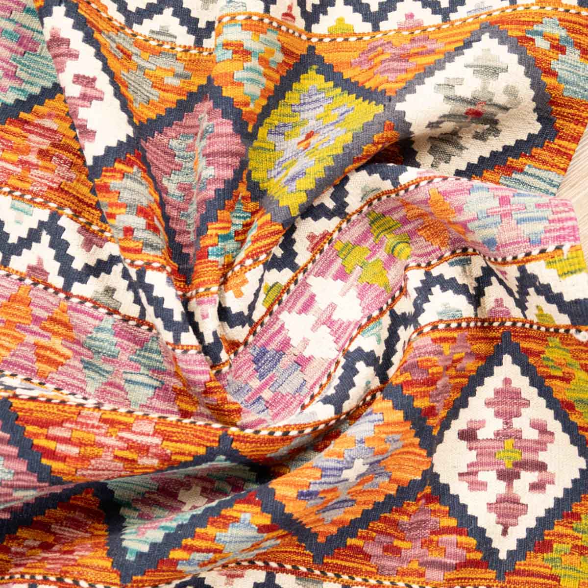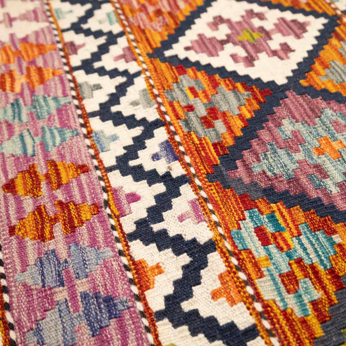 שטיח בעבודת יד מסורתית בסגנון קילים אפגני, בעל צבעוניות חמה ועשירה המשלבת אדום, כתום, צהוב, כחול וירוק. הדוגמאות הגיאומטריות האופייניות לקילים מעניקות לשטיח מראה אותנטי, דינמי ומלא חיים – יצירה שמביאה עמה נגיעה של תרבות עתיקה ישירות לחלל הבית.