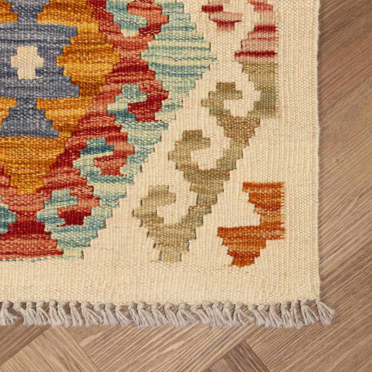 שטיח בעבודת יד מסורתית בסגנון קילים אפגני, בעל צבעוניות חמה ועשירה המשלבת אדום, כתום, צהוב, כחול וירוק. הדוגמאות הגיאומטריות האופייניות לקילים מעניקות לשטיח מראה אותנטי, דינמי ומלא חיים – יצירה שמביאה עמה נגיעה של תרבות עתיקה ישירות לחלל הבית.