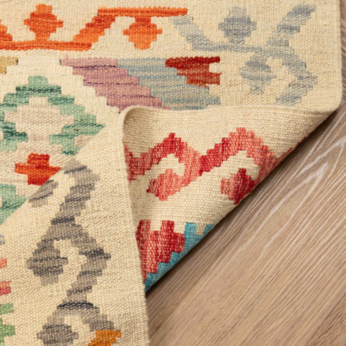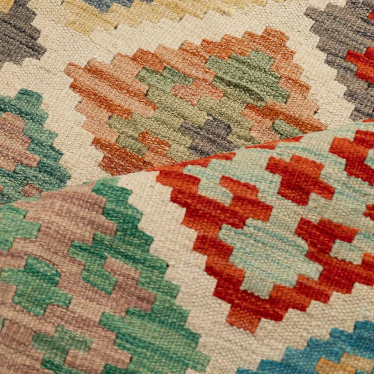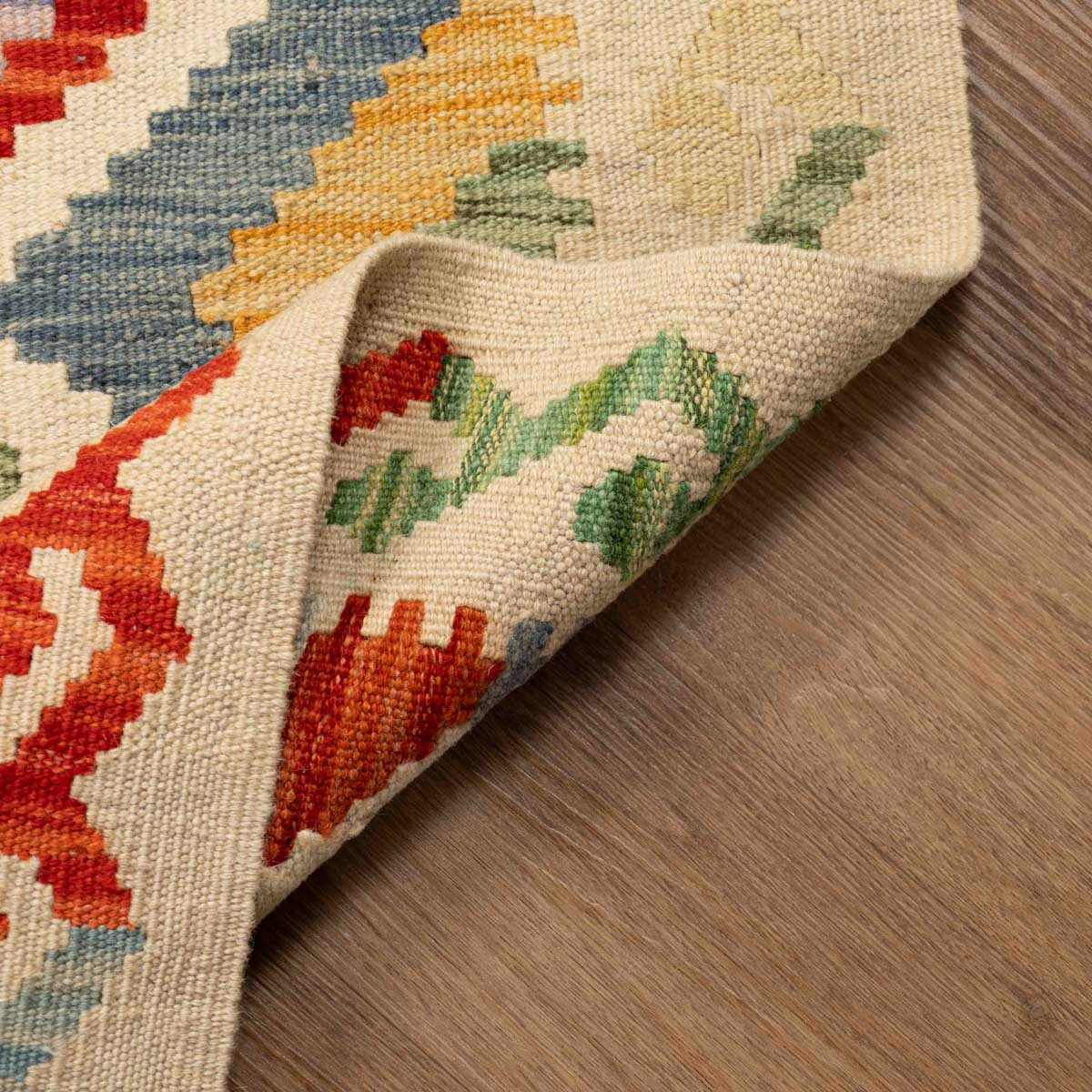 שטיח בעבודת יד מסורתית בסגנון קילים אפגני, בעל צבעוניות חמה ועשירה המשלבת אדום, כתום, צהוב, כחול וירוק. הדוגמאות הגיאומטריות האופייניות לקילים מעניקות לשטיח מראה אותנטי, דינמי ומלא חיים – יצירה שמביאה עמה נגיעה של תרבות עתיקה ישירות לחלל הבית.