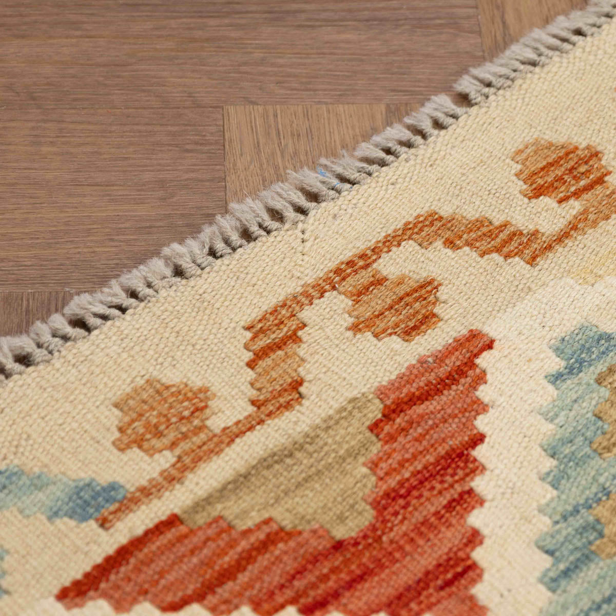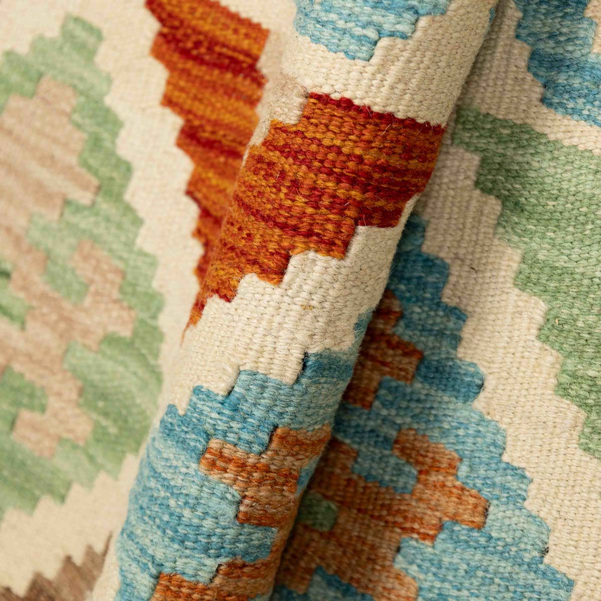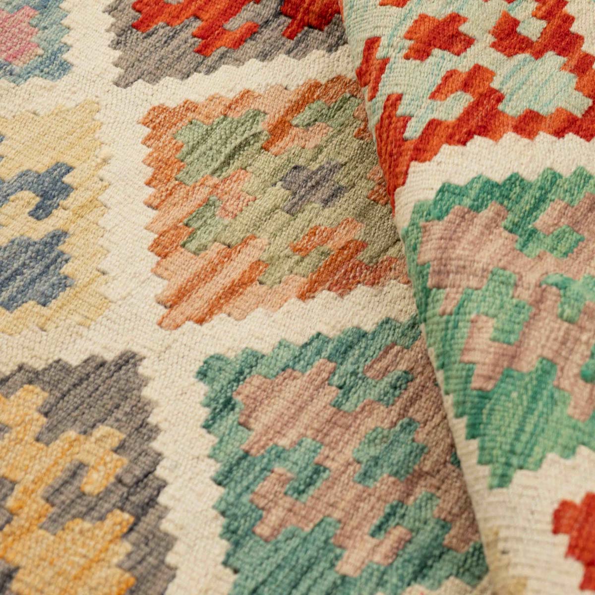 שטיח בעבודת יד מסורתית בסגנון קילים אפגני, בעל צבעוניות חמה ועשירה המשלבת אדום, כתום, צהוב, כחול וירוק. הדוגמאות הגיאומטריות האופייניות לקילים מעניקות לשטיח מראה אותנטי, דינמי ומלא חיים – יצירה שמביאה עמה נגיעה של תרבות עתיקה ישירות לחלל הבית.