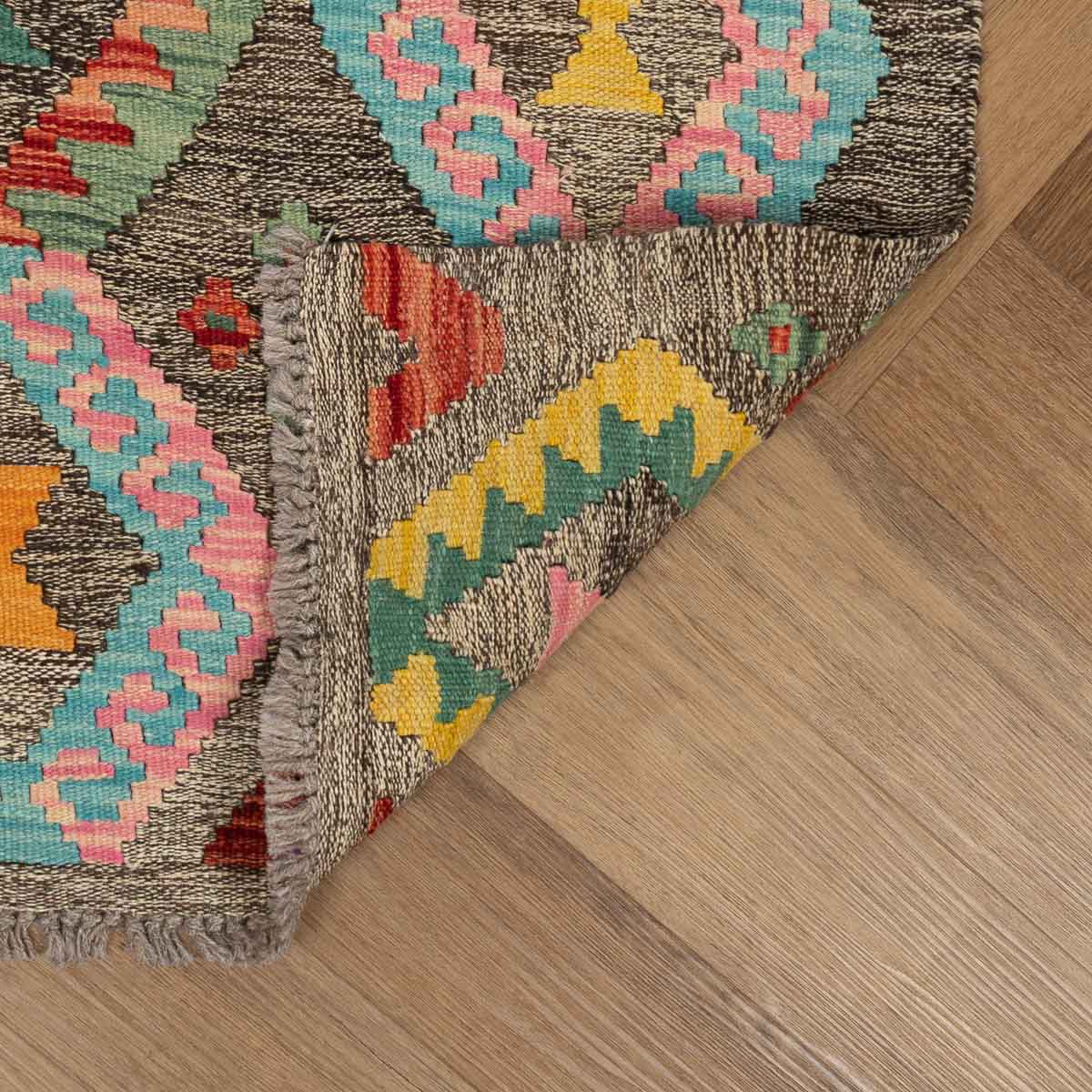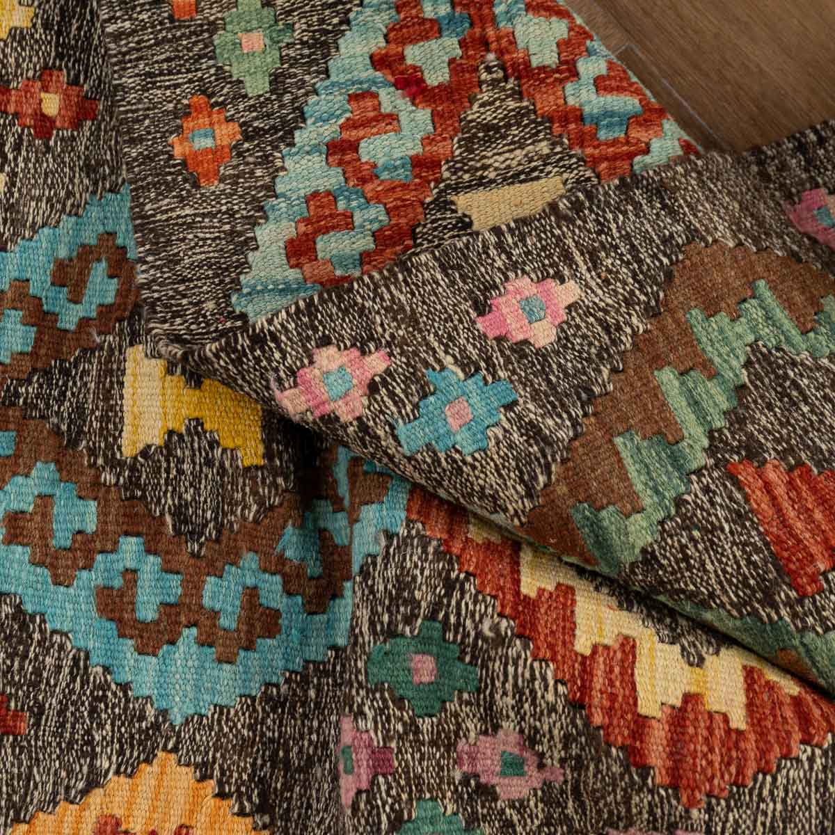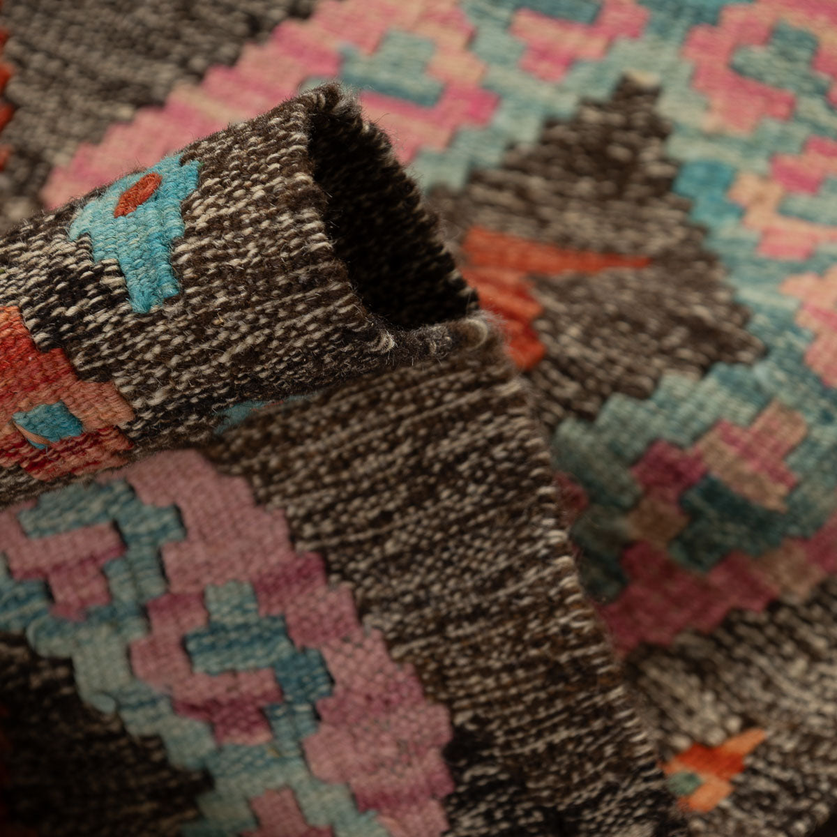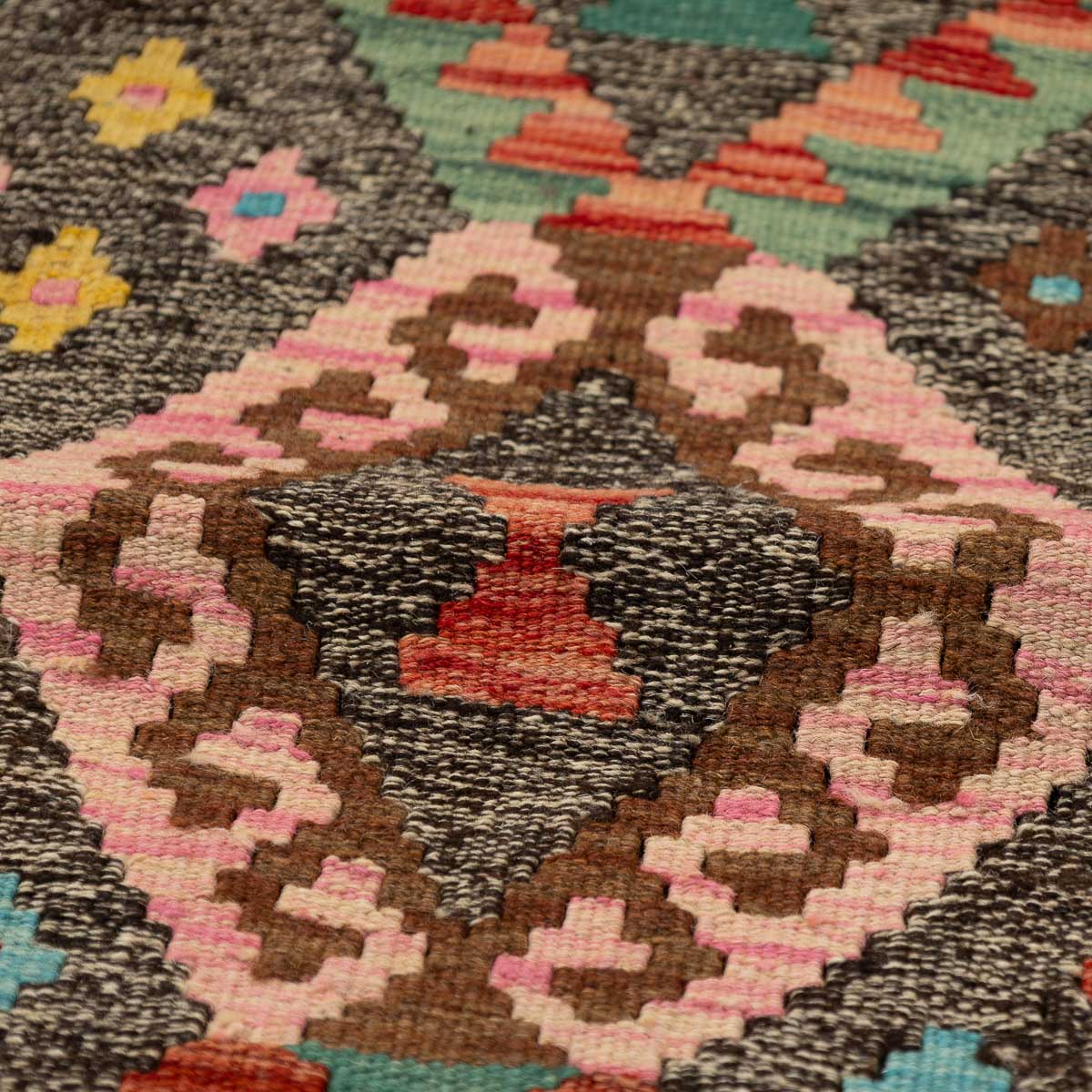 השטיח עשוי מצמר טבעי איכותי, באריגת קילים שטוחה בעבודת יד מוקפדת. הדוגמה הגיאומטרית העשירה משלבת גווני ורוד עתיק, טורקיז, צהוב חרדל, ירוק, אדום וחום עמוק על בסיס כהה, ויוצרת משחק צבעים מלא חיים אך מאוזן.