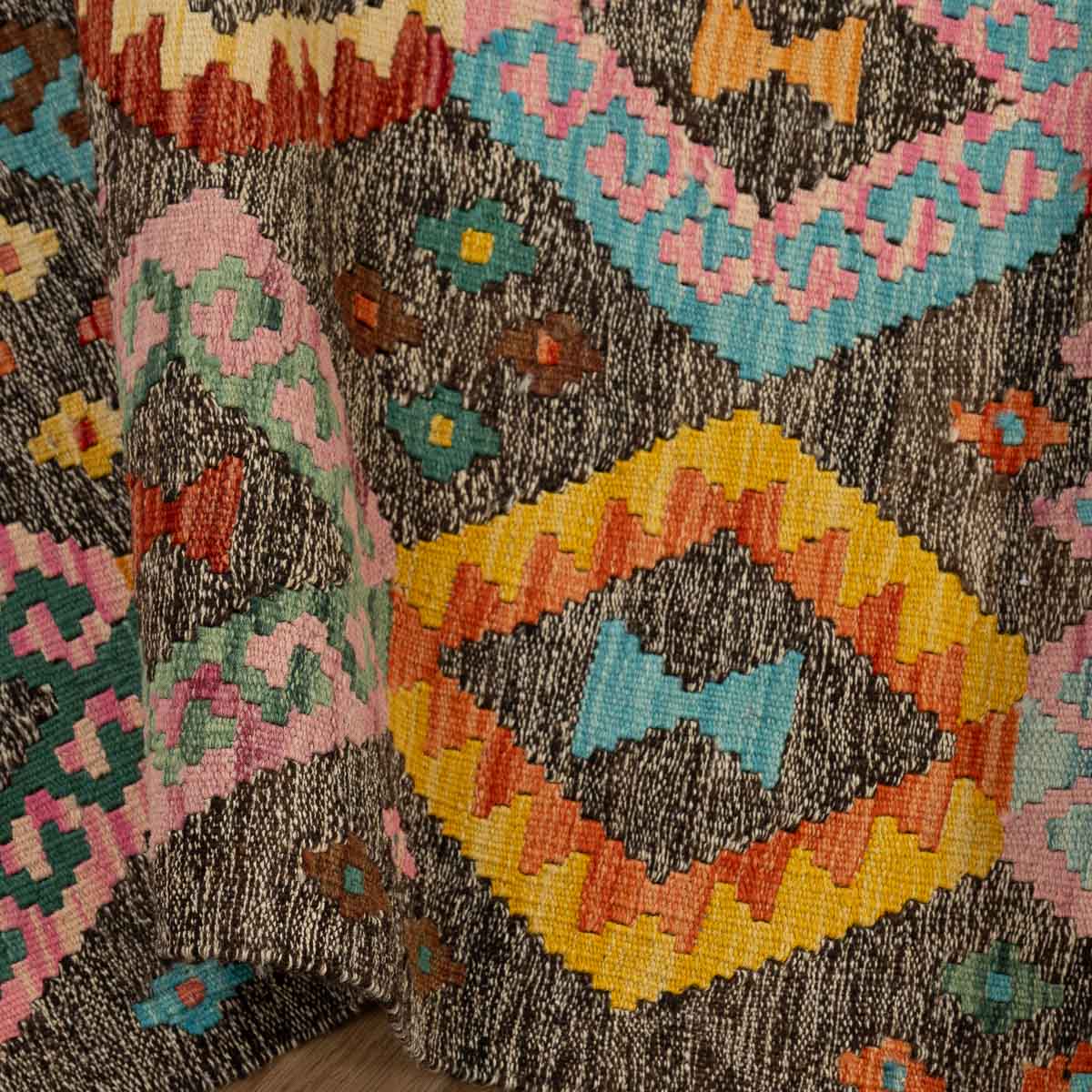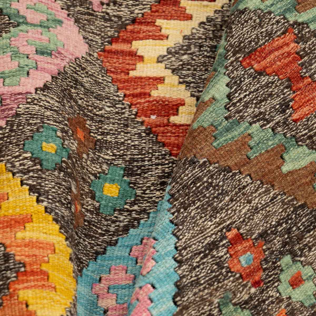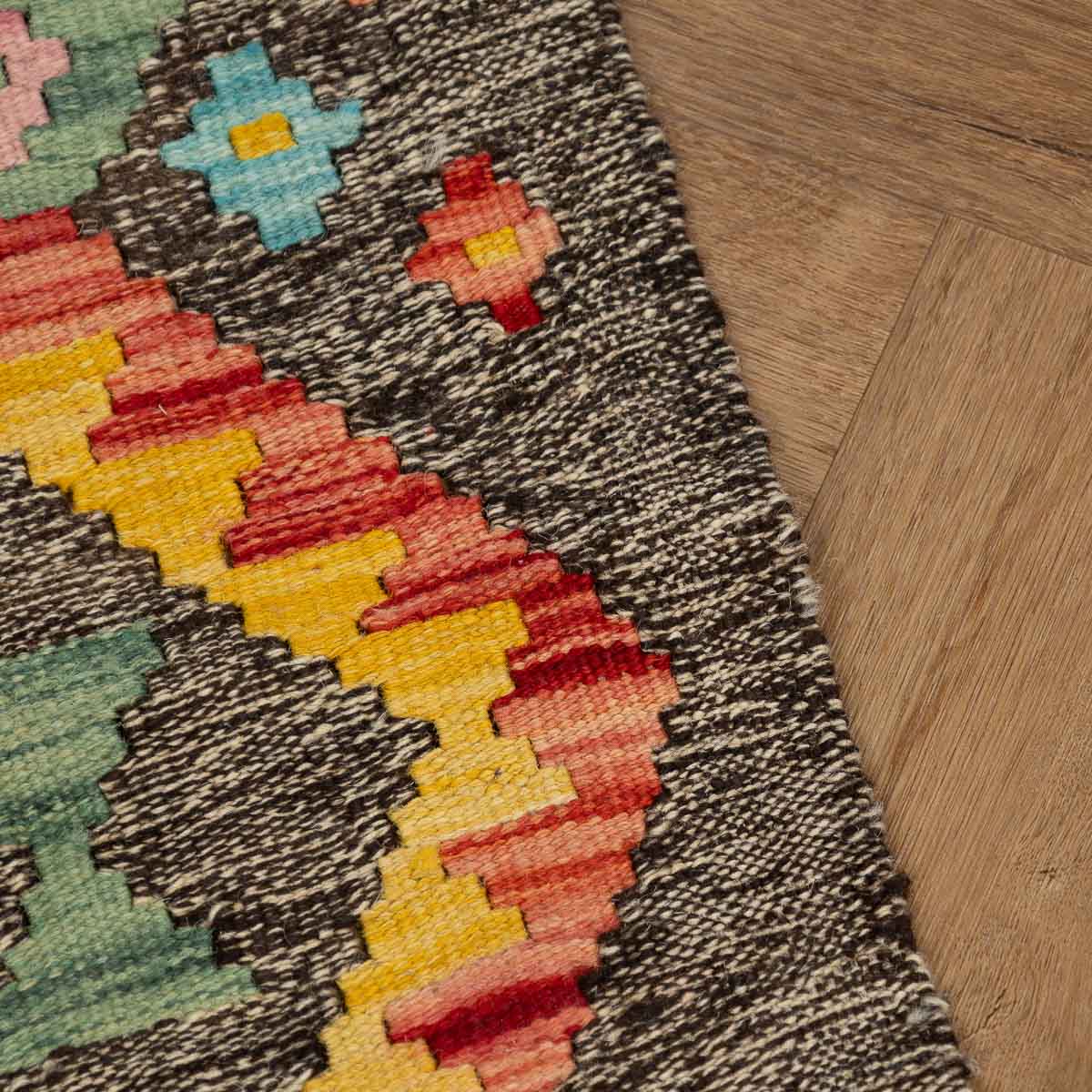 השטיח עשוי מצמר טבעי איכותי, באריגת קילים שטוחה בעבודת יד מוקפדת. הדוגמה הגיאומטרית העשירה משלבת גווני ורוד עתיק, טורקיז, צהוב חרדל, ירוק, אדום וחום עמוק על בסיס כהה, ויוצרת משחק צבעים מלא חיים אך מאוזן.