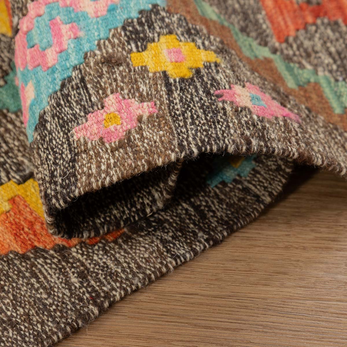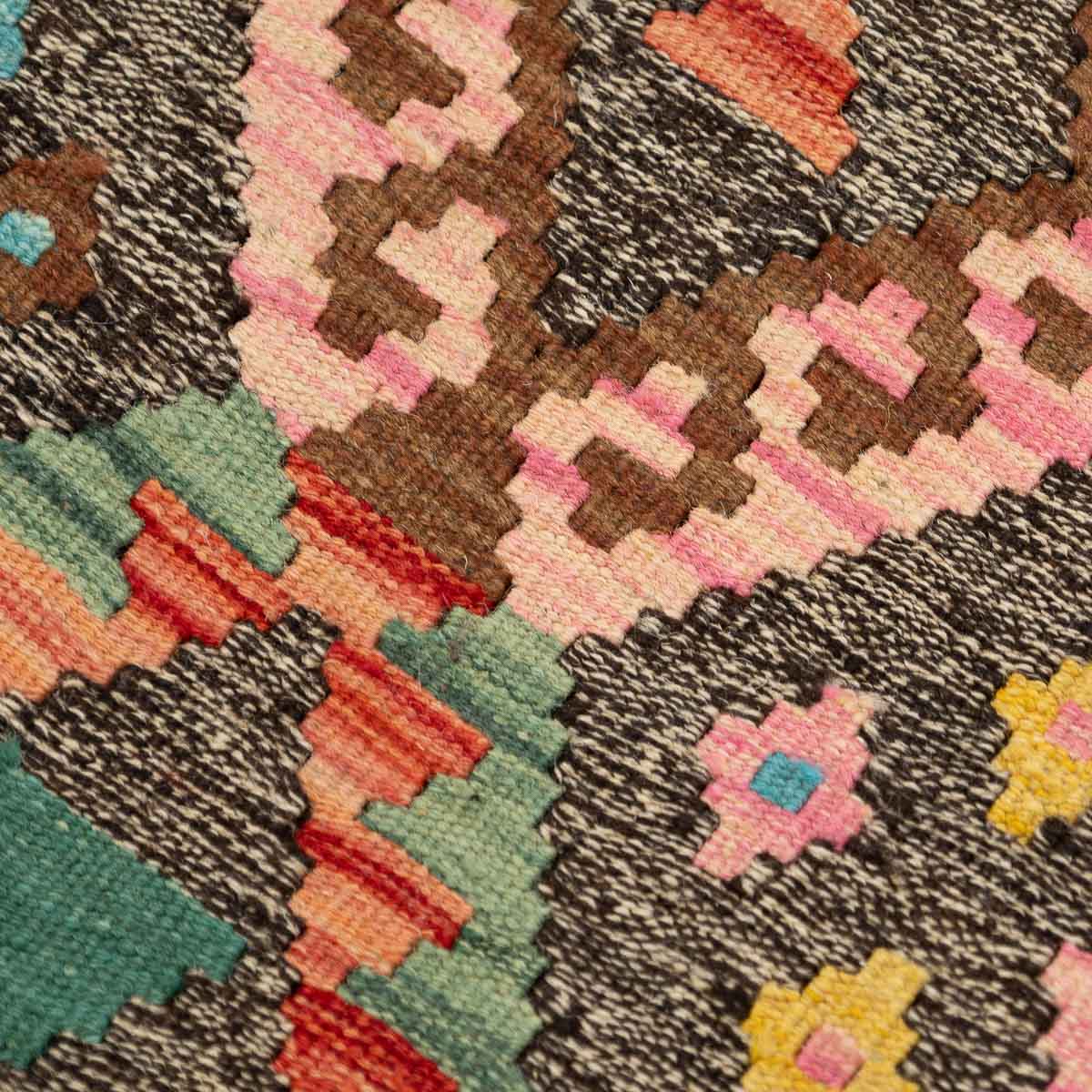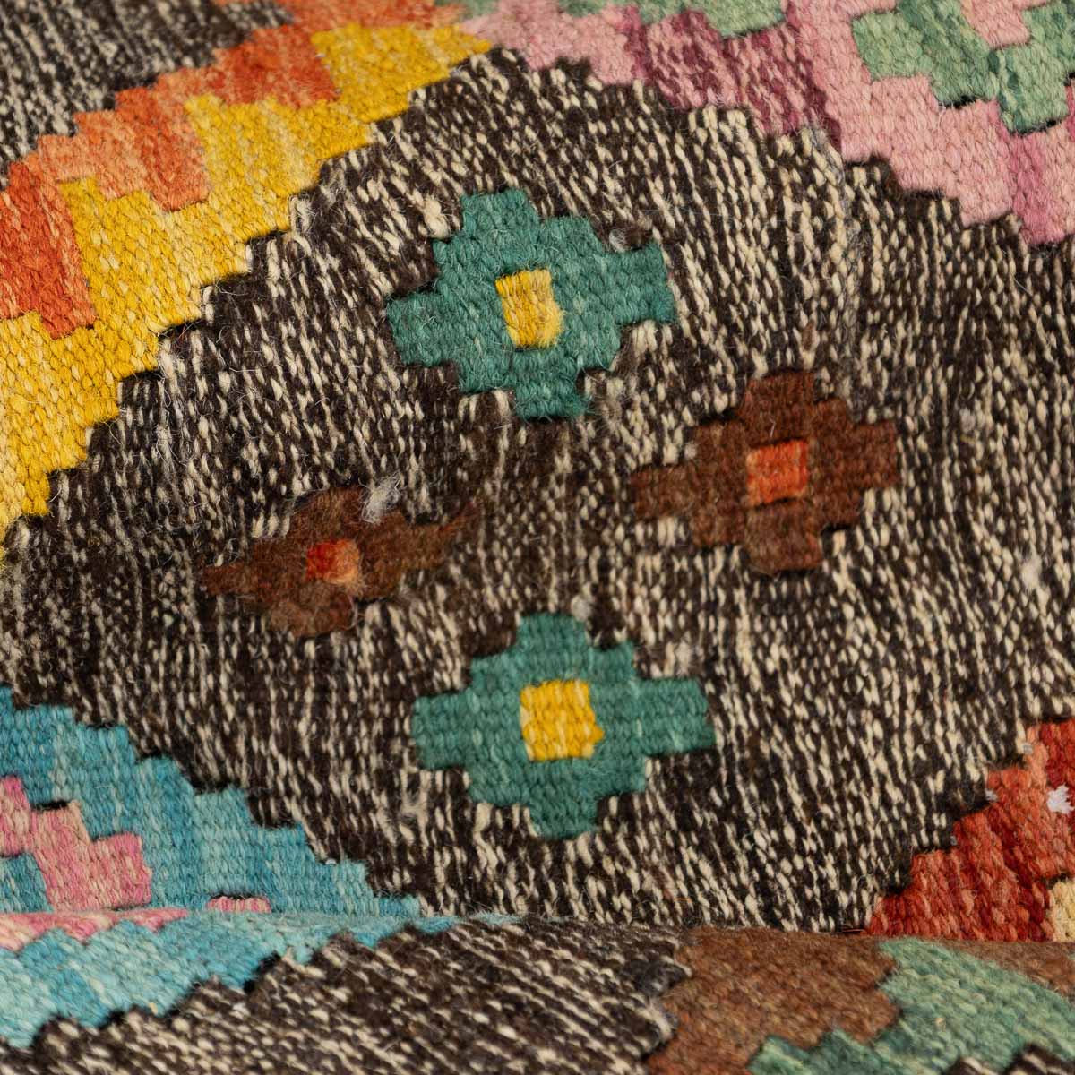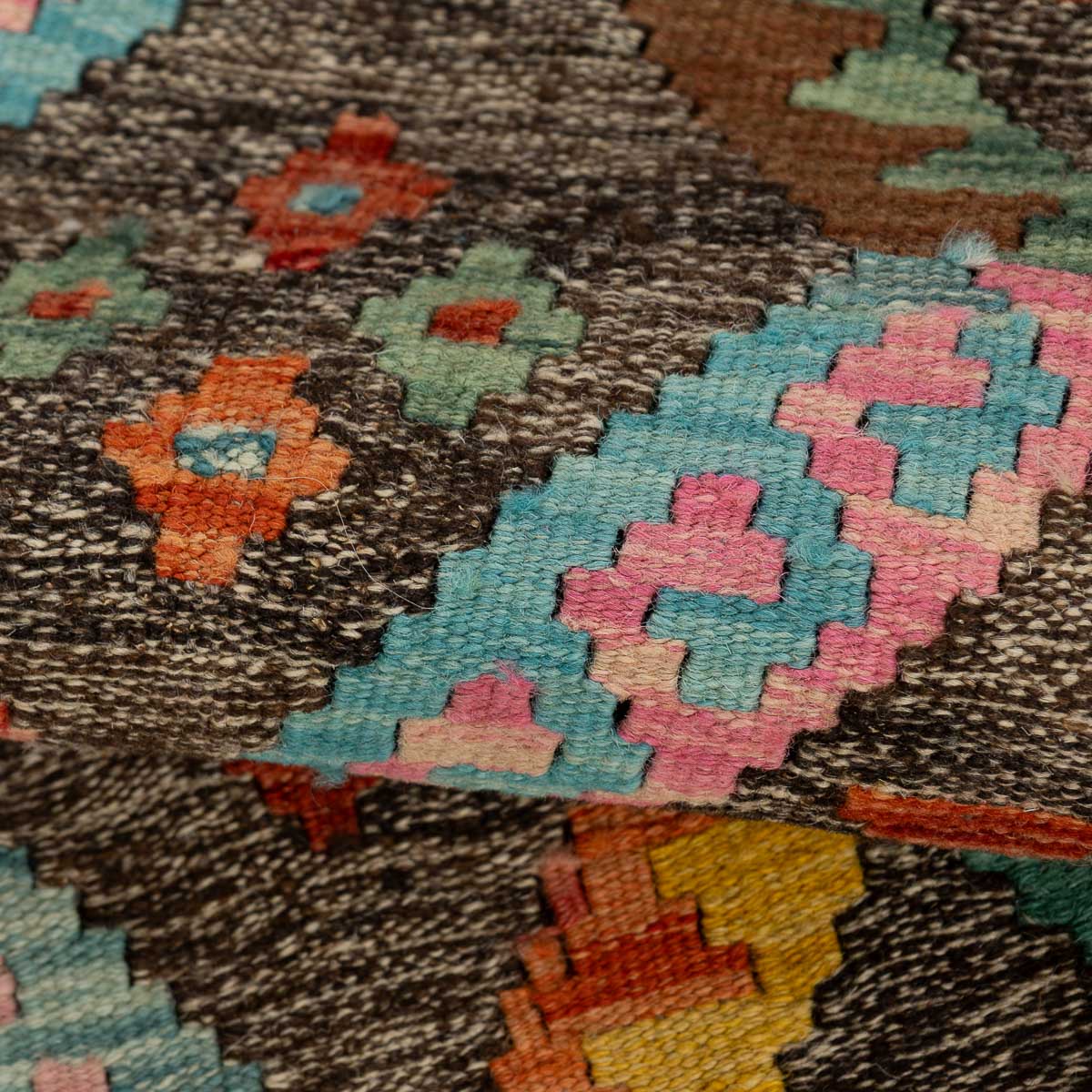 השטיח עשוי מצמר טבעי איכותי, באריגת קילים שטוחה בעבודת יד מוקפדת. הדוגמה הגיאומטרית העשירה משלבת גווני ורוד עתיק, טורקיז, צהוב חרדל, ירוק, אדום וחום עמוק על בסיס כהה, ויוצרת משחק צבעים מלא חיים אך מאוזן.