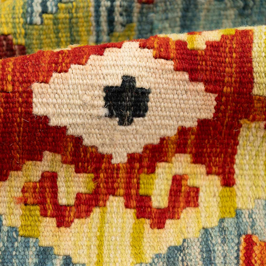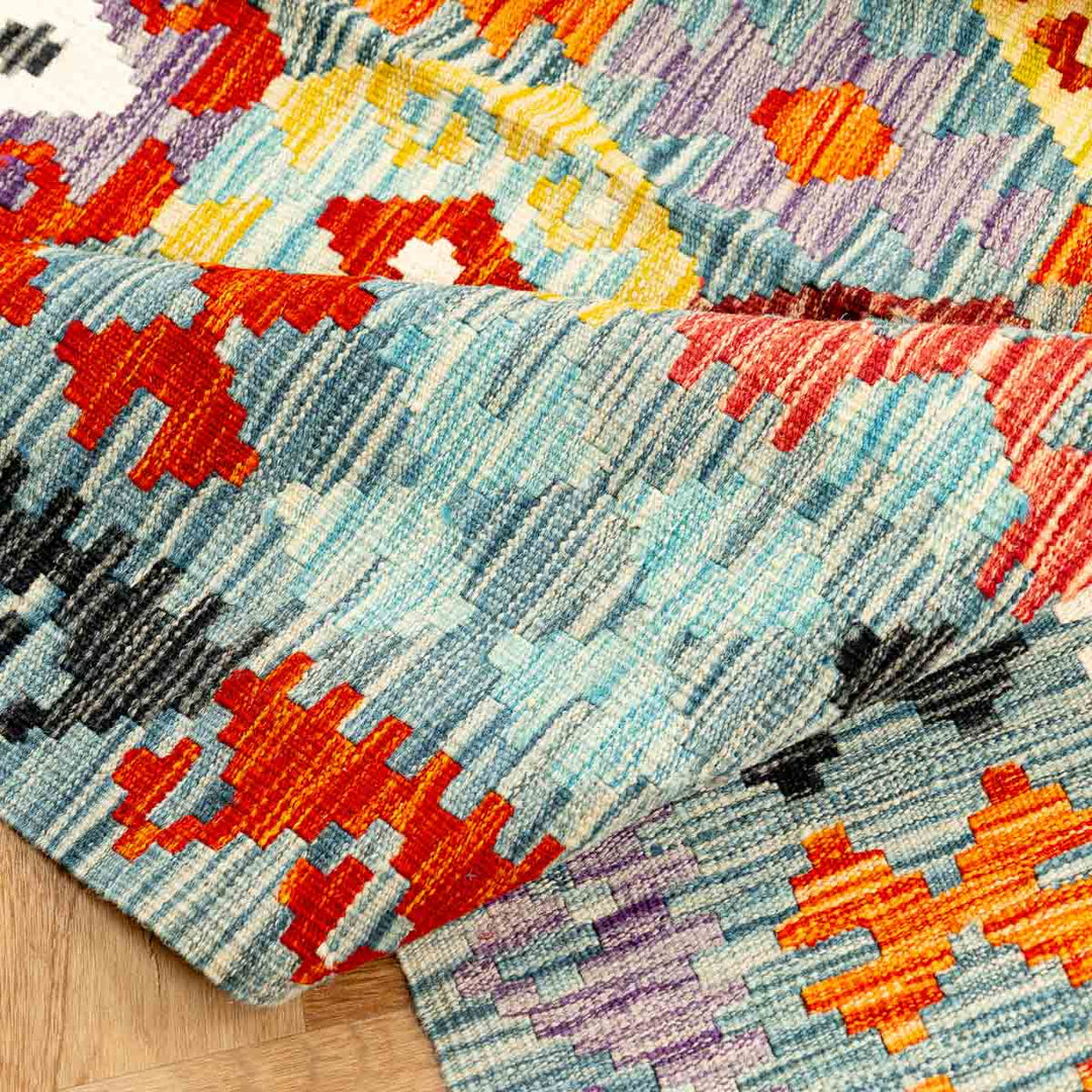 שטיח קילים אפגני זה הוא יצירת אומנות ייחודית אשר נעשתה בעבודת יד מוקפדת על ידי אומנים מסורתיים באפגניסטן. השטיח עשוי בטכניקת האריגה השטוחה הייחודית לקילים, המשלבת דפוסי גיאומטריה מרהיבים וצבעים חיים ועזים, המעניקים לו מראה עשיר ודומיננטי שמתאים לכל חלל.