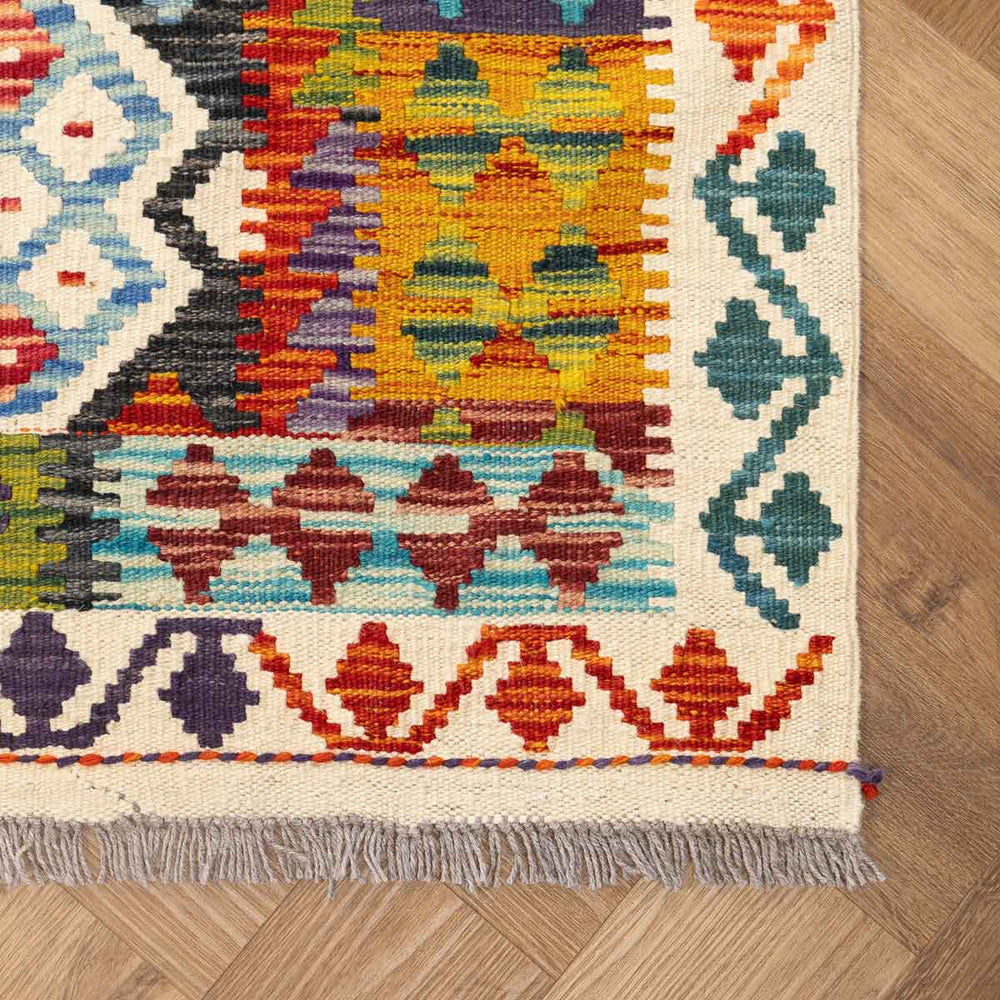 שטיח קילים אפגני זה הוא יצירת אומנות ייחודית אשר נעשתה בעבודת יד מוקפדת על ידי אומנים מסורתיים באפגניסטן. השטיח עשוי בטכניקת האריגה השטוחה הייחודית לקילים, המשלבת דפוסי גיאומטריה מרהיבים וצבעים חיים ועזים, המעניקים לו מראה עשיר ודומיננטי שמתאים לכל חלל.