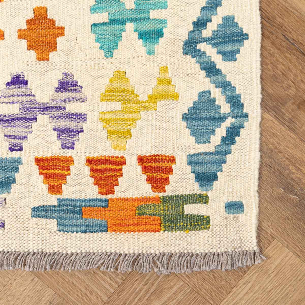 שטיח קילים אפגני זה הוא יצירת אומנות ייחודית אשר נעשתה בעבודת יד מוקפדת על ידי אומנים מסורתיים באפגניסטן. השטיח עשוי בטכניקת האריגה השטוחה הייחודית לקילים, המשלבת דפוסי גיאומטריה מרהיבים וצבעים חיים ועזים, המעניקים לו מראה עשיר ודומיננטי שמתאים לכל חלל.