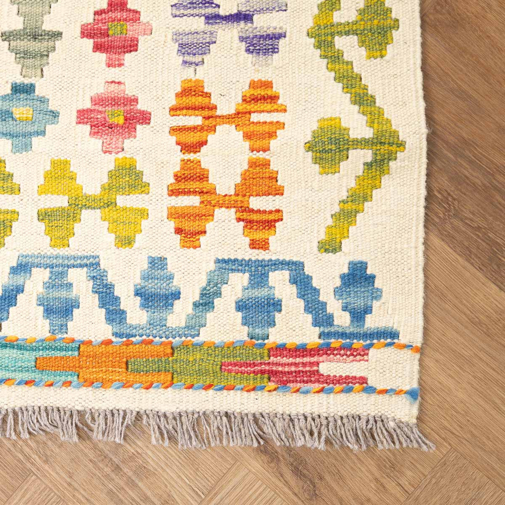 שטיח קילים אפגני זה הוא יצירת אומנות ייחודית אשר נעשתה בעבודת יד מוקפדת על ידי אומנים מסורתיים באפגניסטן. השטיח עשוי בטכניקת האריגה השטוחה הייחודית לקילים, המשלבת דפוסי גיאומטריה מרהיבים וצבעים חיים ועזים, המעניקים לו מראה עשיר ודומיננטי שמתאים לכל חלל.