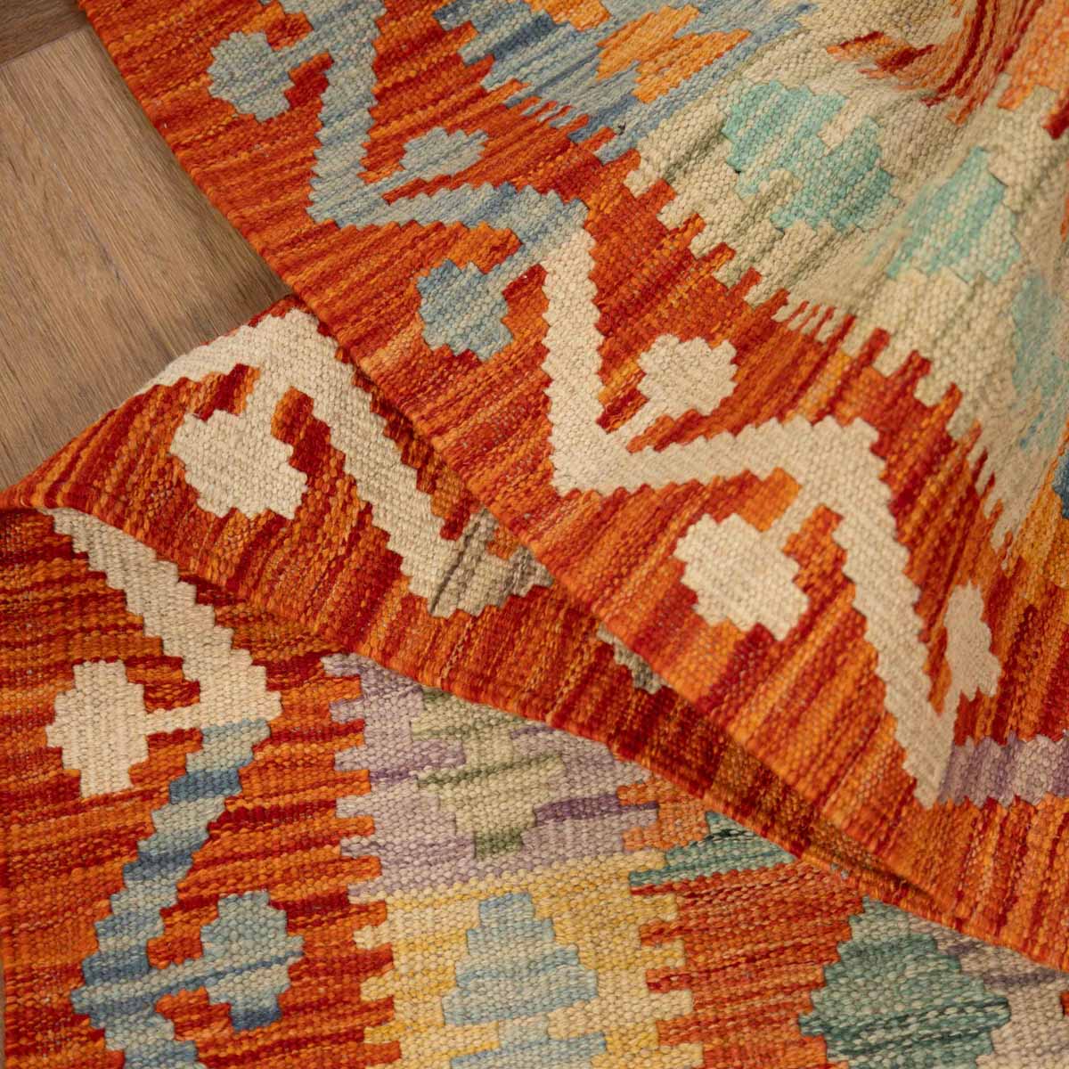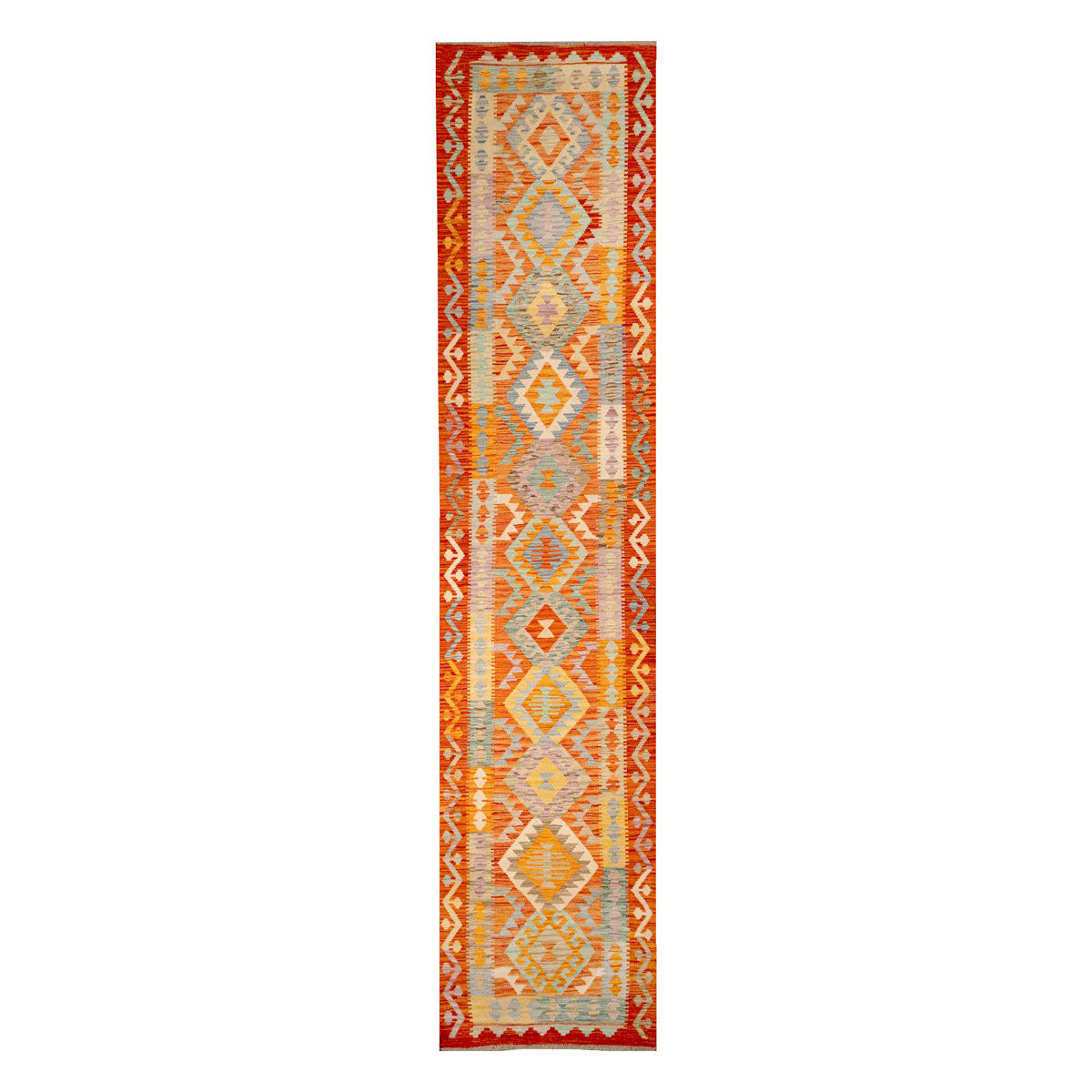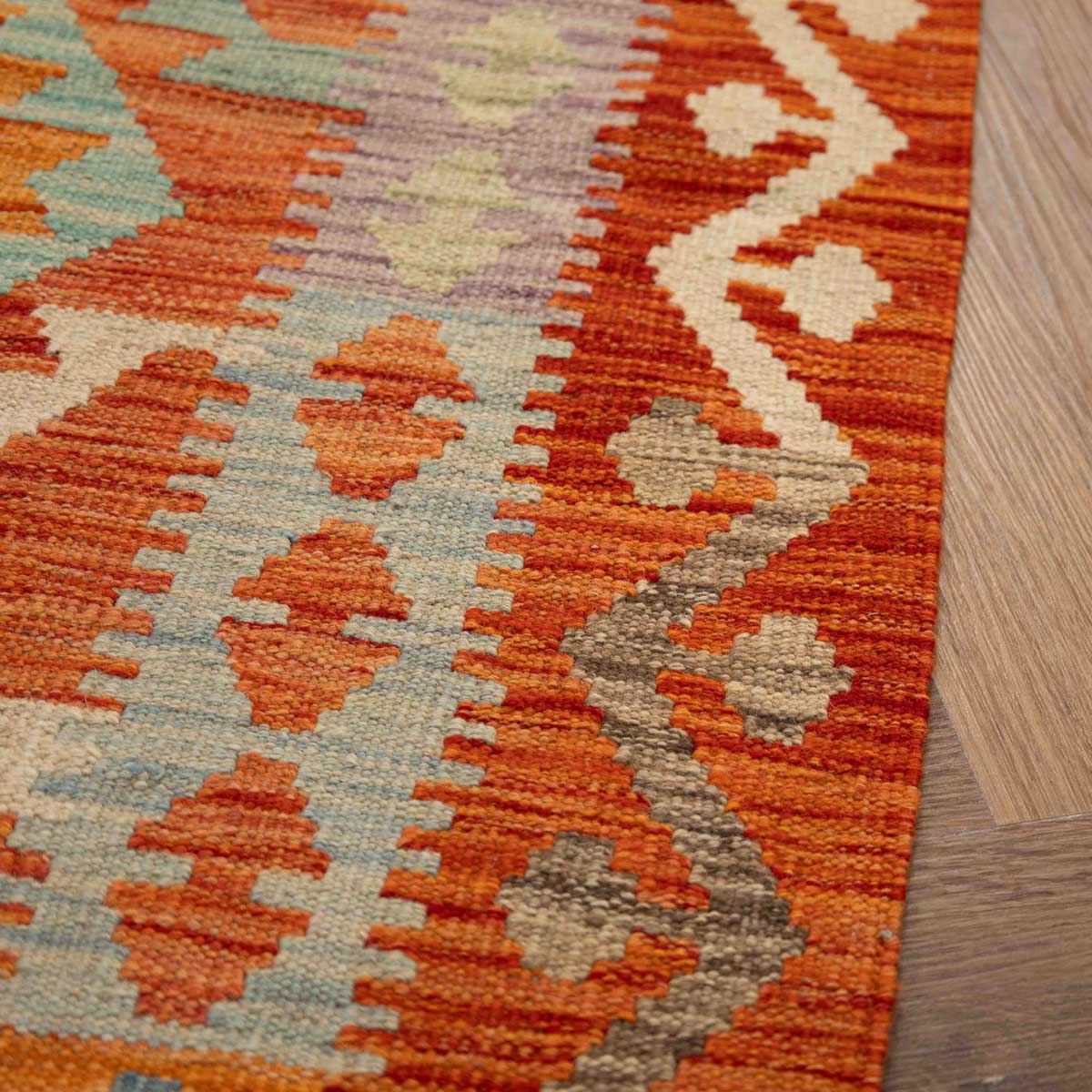 שטיח קילים אפגני בעבודת יד, מלא צבע, חום ואותנטיות. ראנר עם נוכחות שמכניס אופי, שמחה ותחושת מסע לכל חלל.