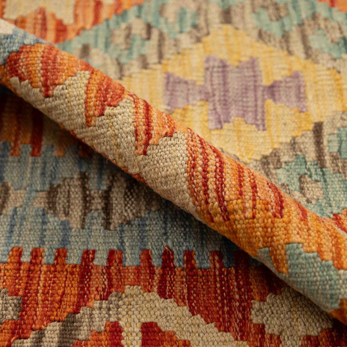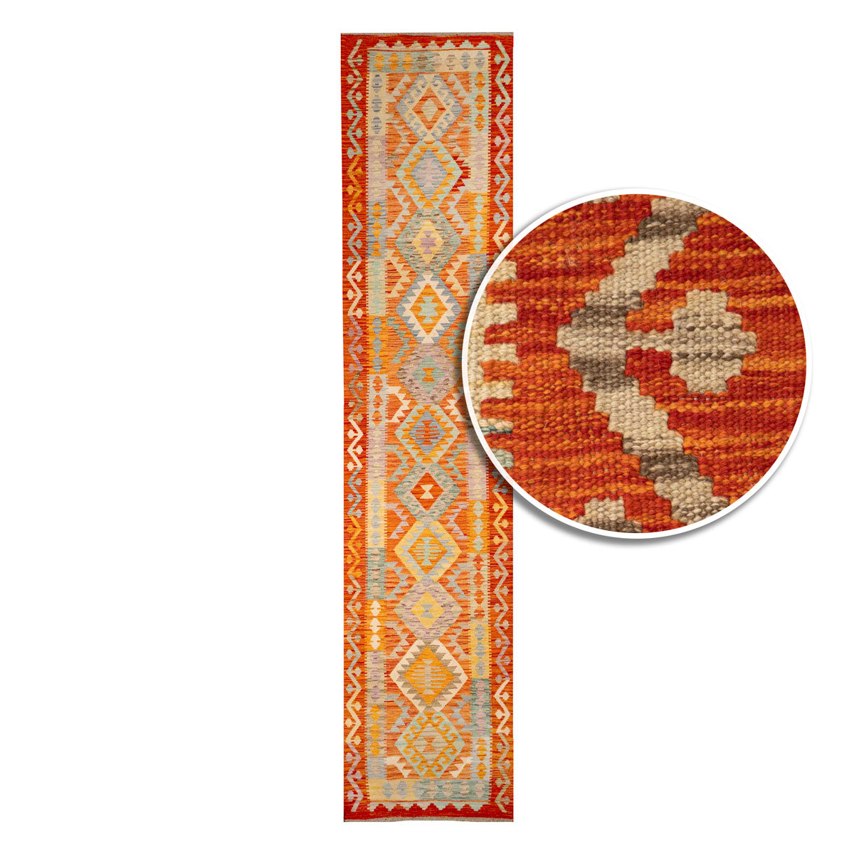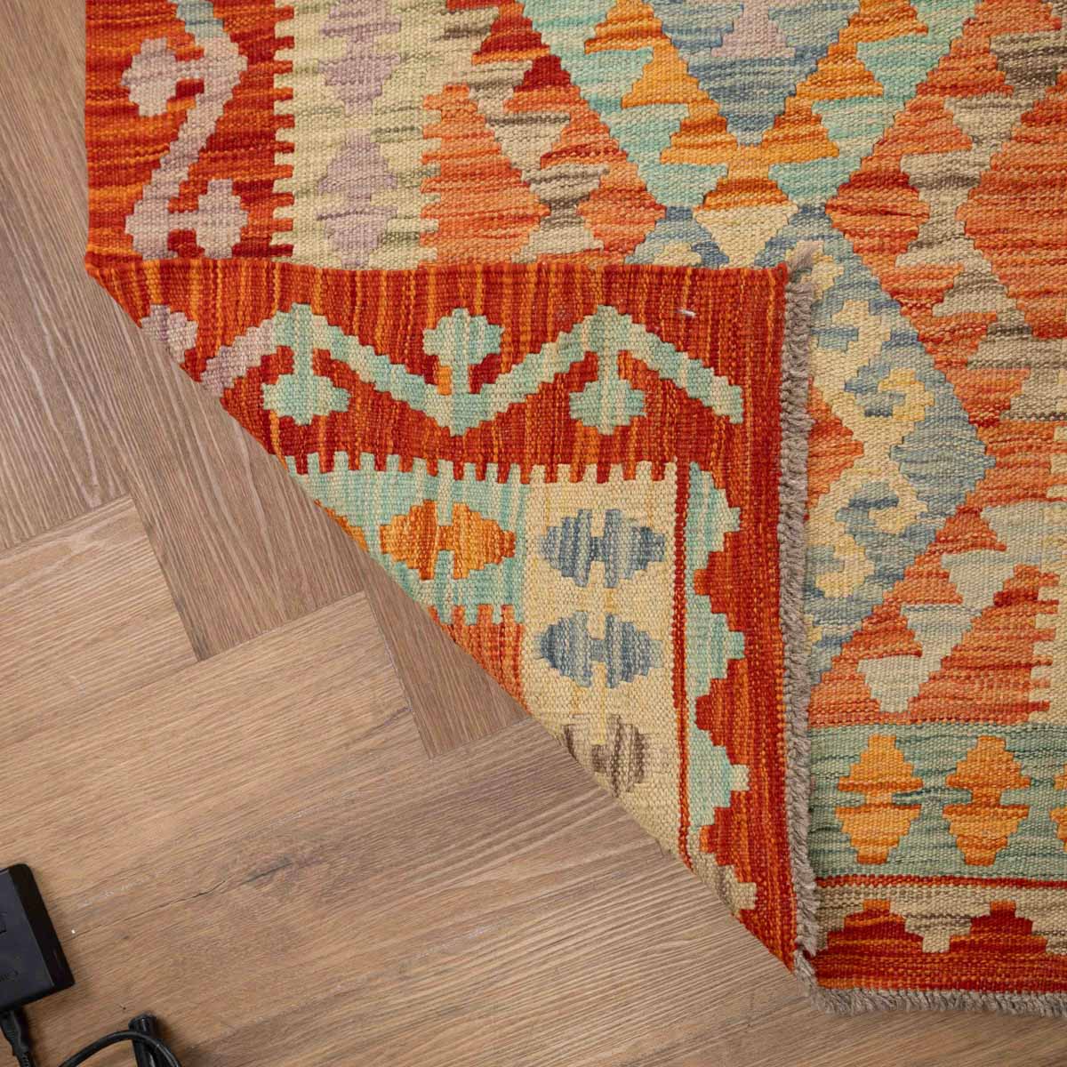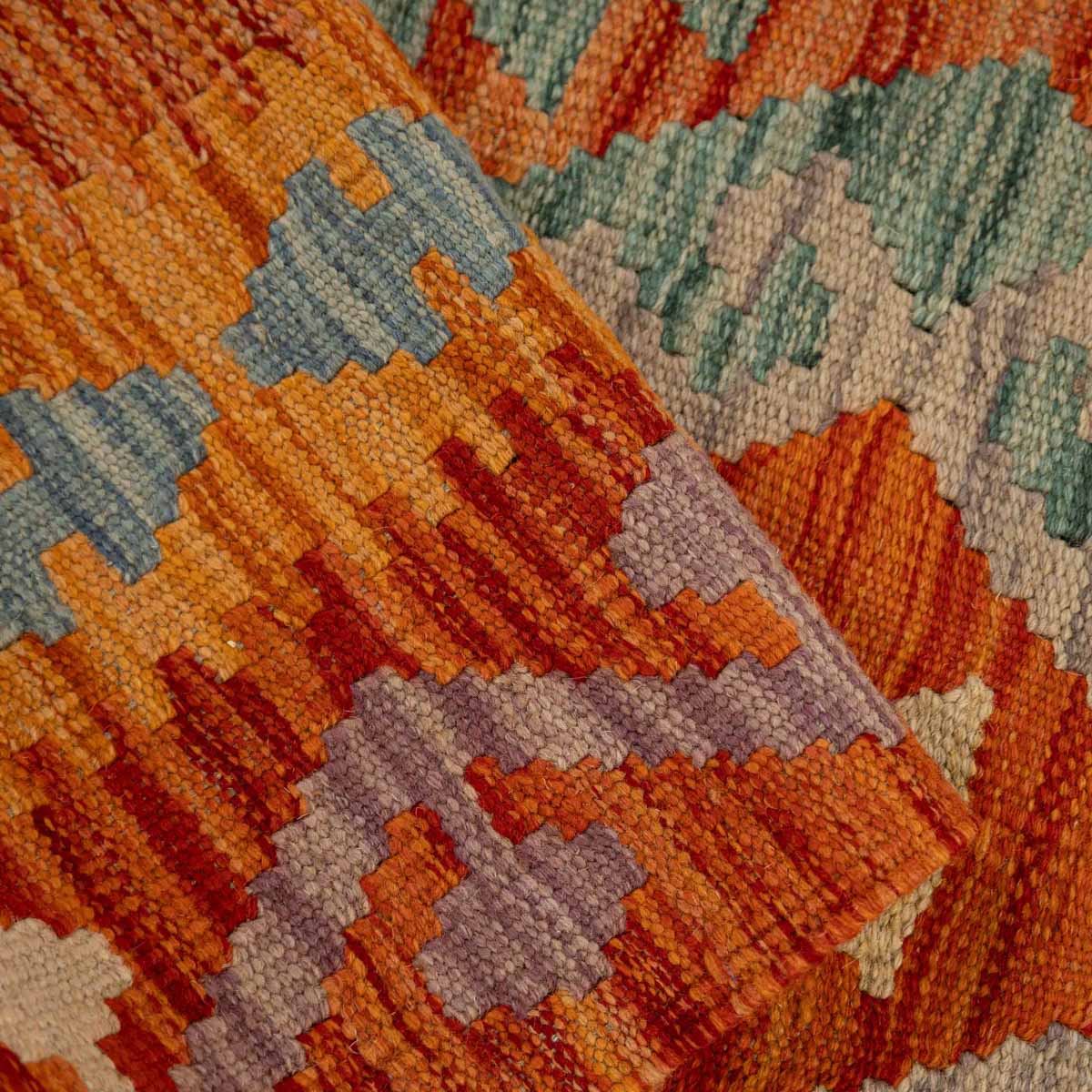 שטיח קילים אפגני בעבודת יד, מלא צבע, חום ואותנטיות. ראנר עם נוכחות שמכניס אופי, שמחה ותחושת מסע לכל חלל.