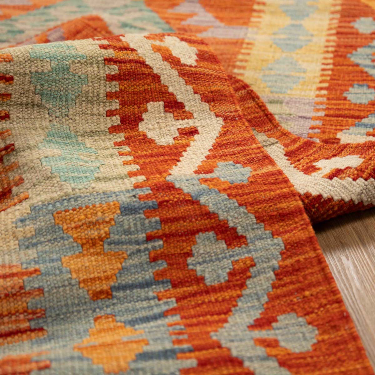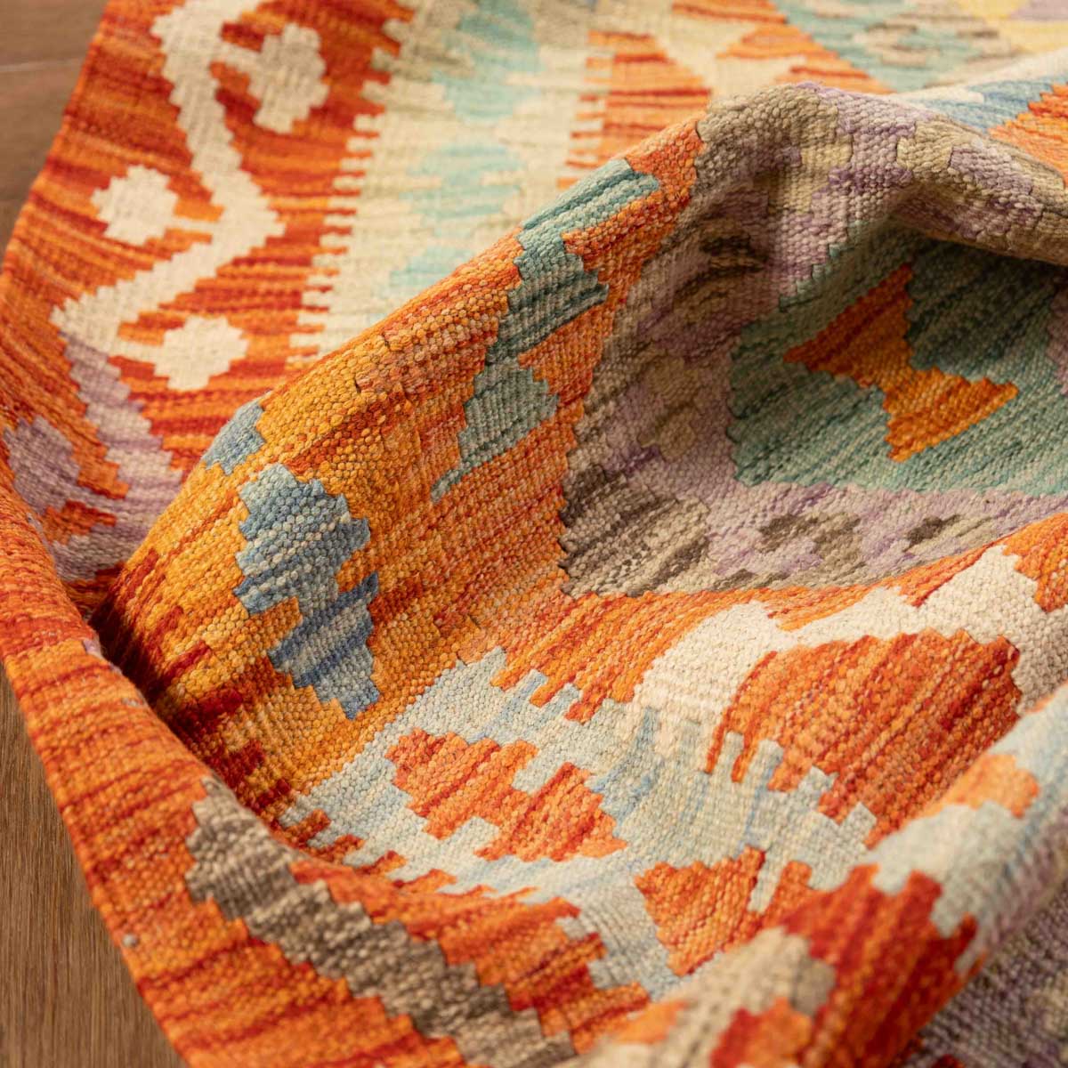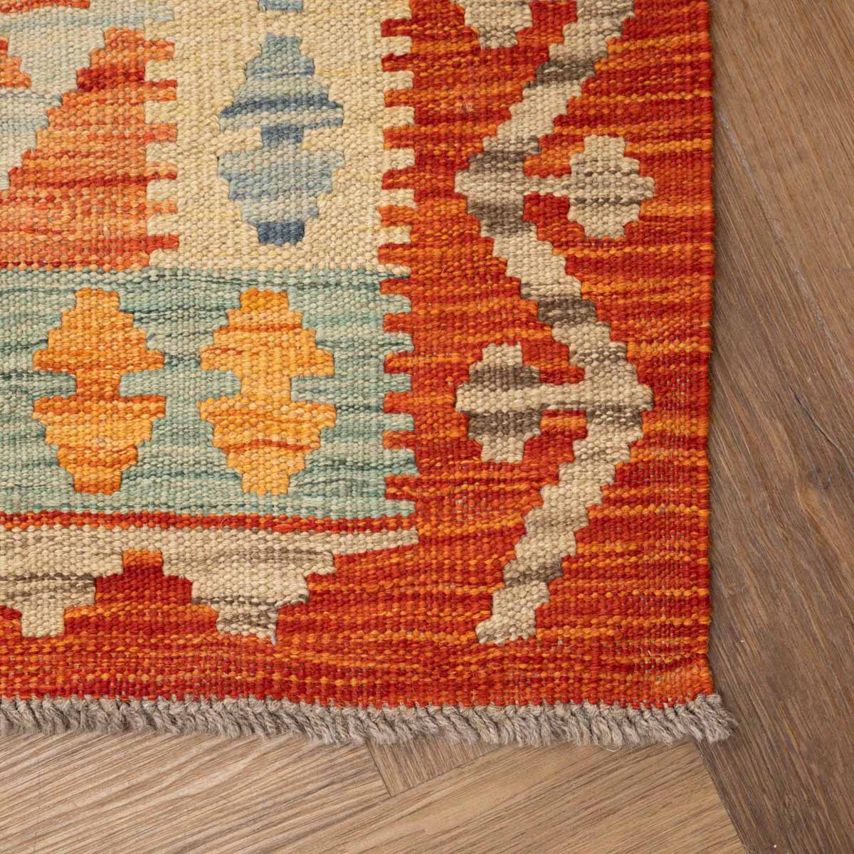 דוגמת קילים גאומטרית מסורתית, בפריסה אורכית קצבית שמדגישה תנועה וזרימה. שילוב עשיר של כתומים, אדומים, בז’, תכלת ונגיעות חום יוצר מראה חי אך מאוזן. מתאים במיוחד למסדרונות, מבואות, מטבחים ארוכים או לצד מיטה.