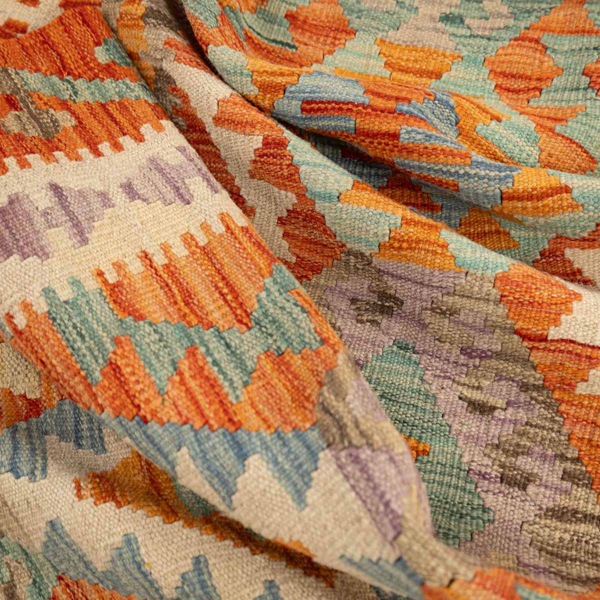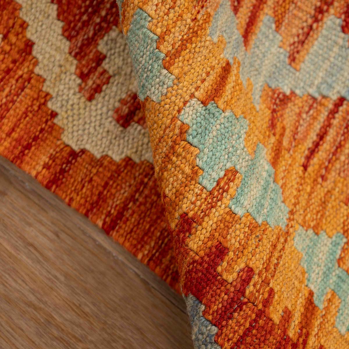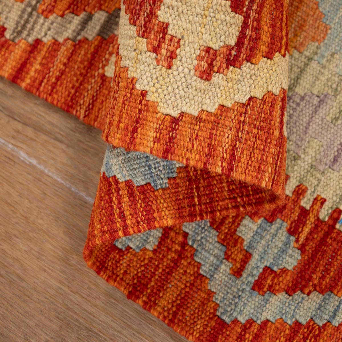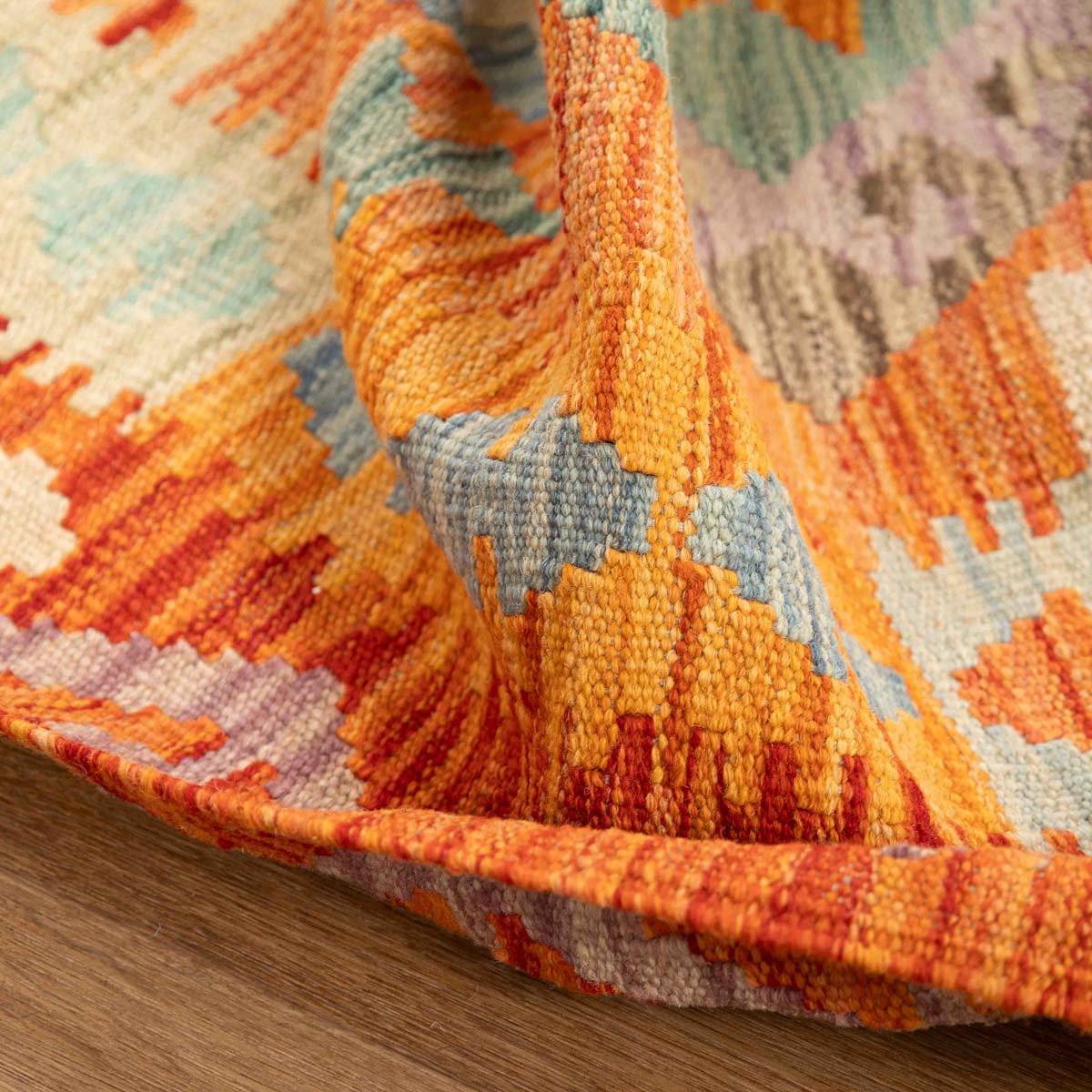 דוגמת קילים גאומטרית מסורתית, בפריסה אורכית קצבית שמדגישה תנועה וזרימה. שילוב עשיר של כתומים, אדומים, בז’, תכלת ונגיעות חום יוצר מראה חי אך מאוזן. מתאים במיוחד למסדרונות, מבואות, מטבחים ארוכים או לצד מיטה.