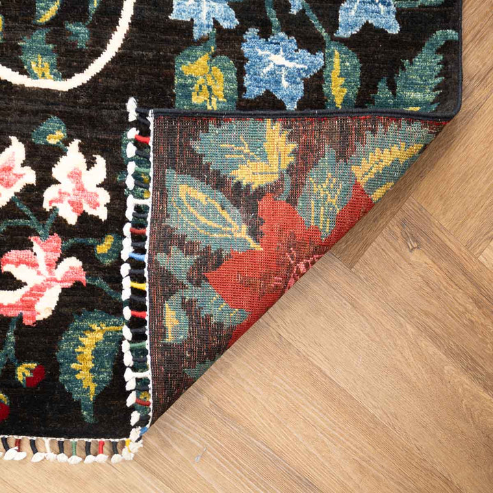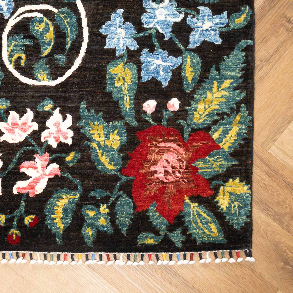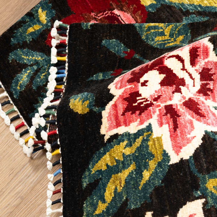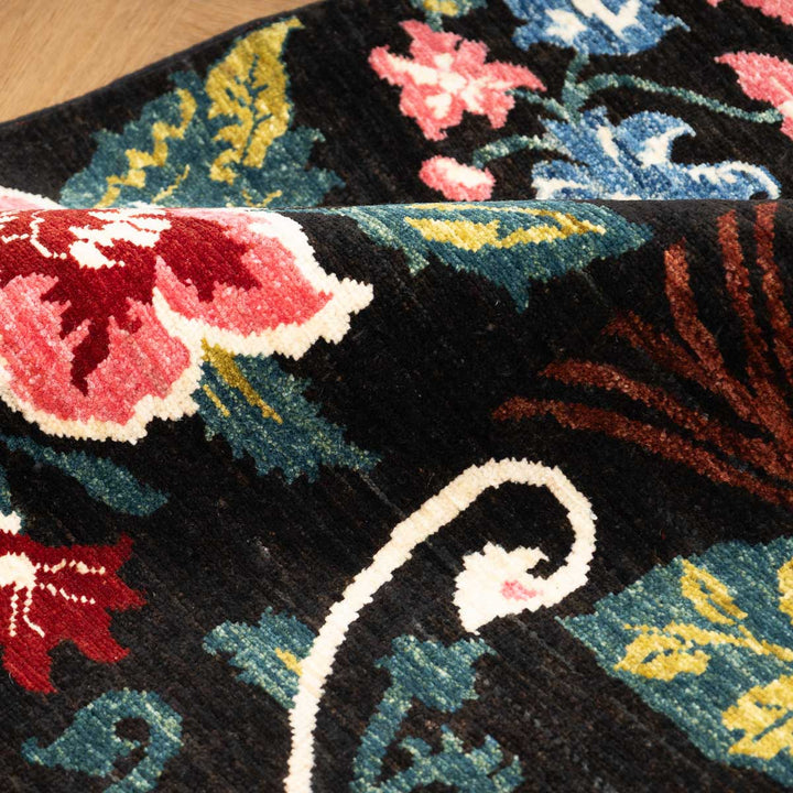 שטיח קראבח הצבעוני הוא יצירת אמנות של ממש – בעבודת יד קפדנית, עם דוגמת פרחים עשירה על רקע שחור עמוק שמבליט כל פרט בצורה דרמטית ומרשימה. זהו שטיח שמתאים למי שמחפש עיצוב עם אופי, רומנטיקה ועוצמה.